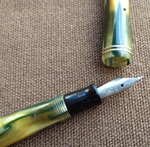 L'ho comprata da un amico perchè mi affascinava il colore. E' una penna da borsetta, ma non le aggiungerò il pendaglio che a me non piacciono. E' lunga 11cm, il diametro del fusto è di 11mm e pesa 10gr scarica. Il pennino Durzem-Zemax proviene da una donatrice. Non saprei dire però che modello sia.
