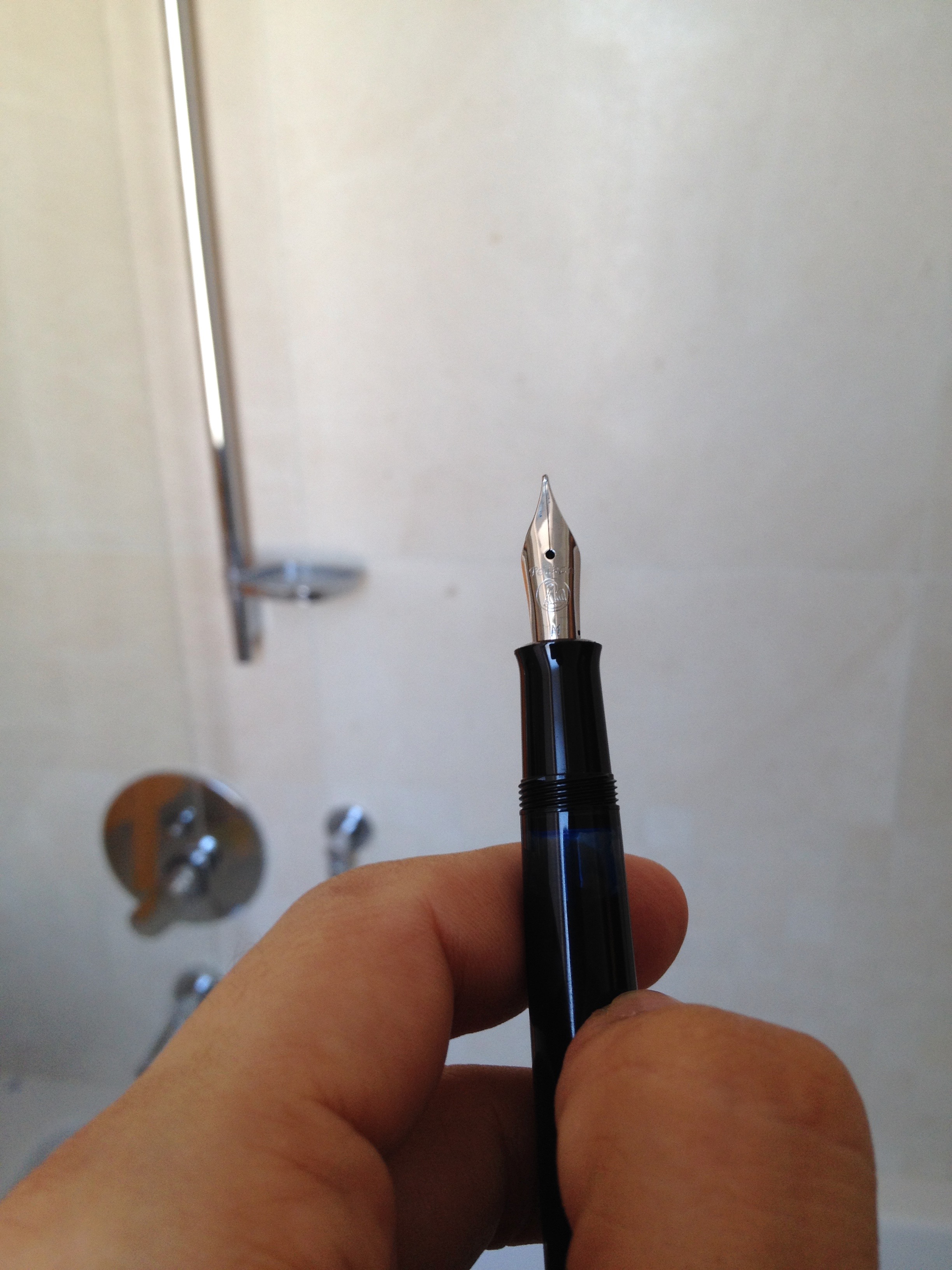 Ha un pennino M e il flusso è assai generoso (questo lo avevo letto e melo aspettavo), ma il pennino ha una strana forma che non ho mai visto prima: ha la punta rivolta un po' all'insù. Questo non compromette la scorrevolezza estrema del pennino ma la mia domanda è se possa influire sulla estrema generosità del flusso.