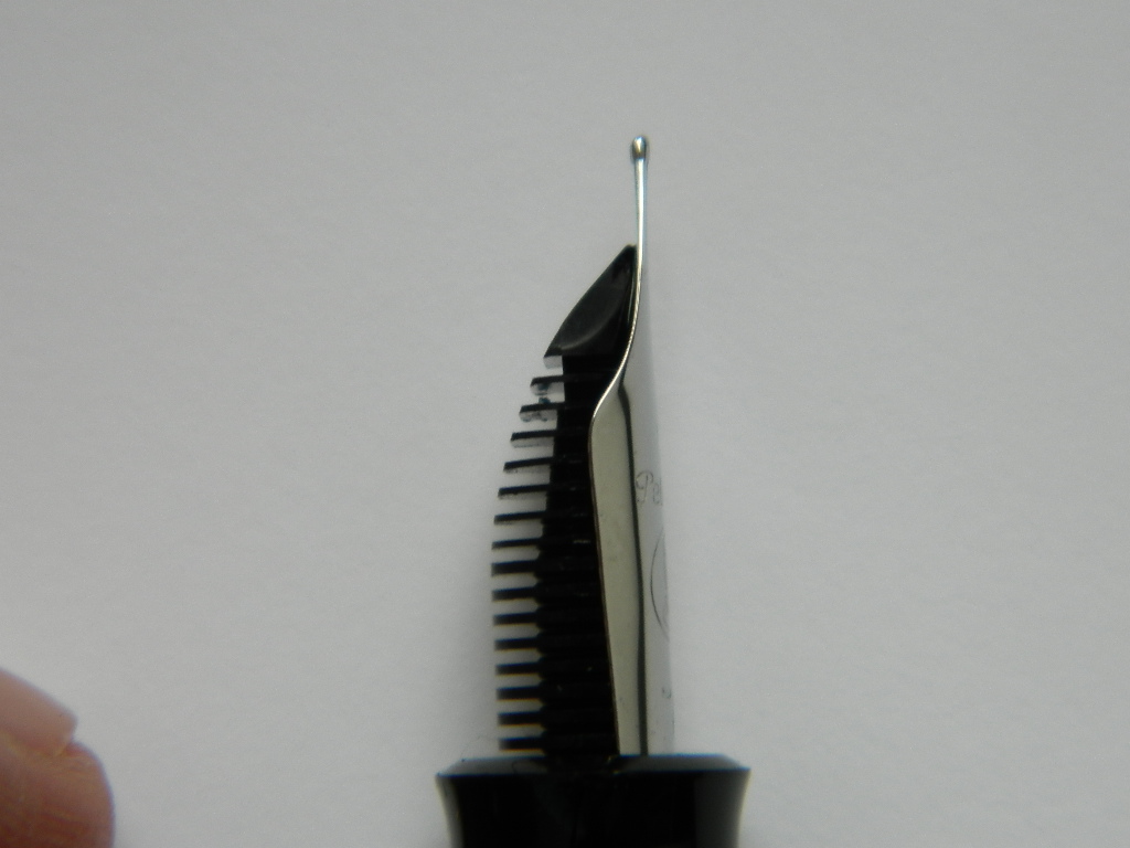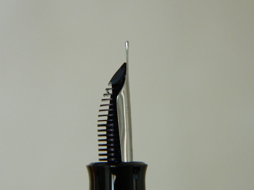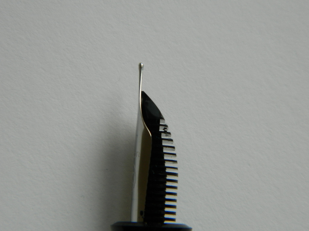 purtroppo non sono riuscito a fare foto, ma di profilo il pennino non è diritto, la punta va all'insù.