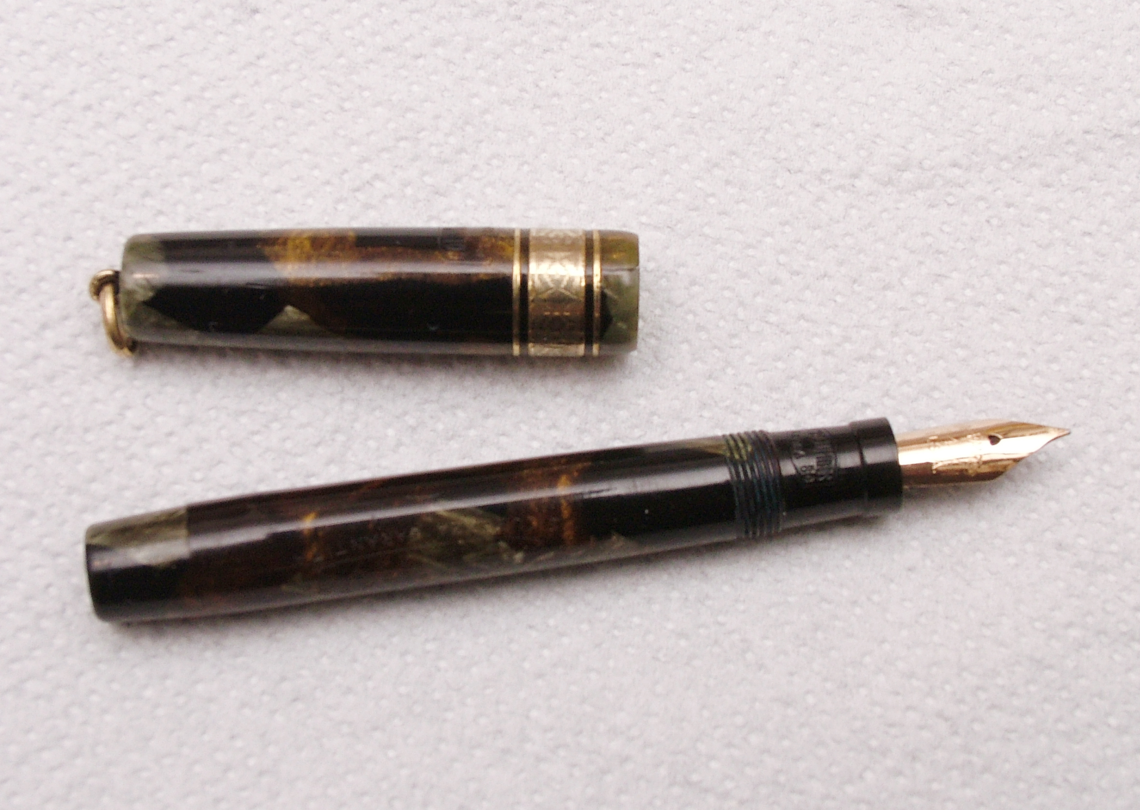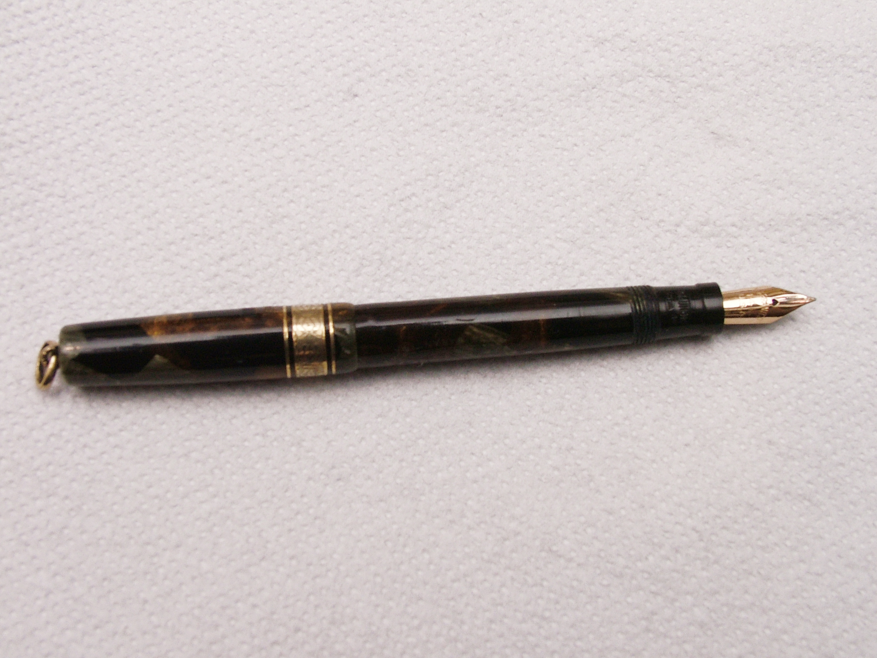 Il colore della celluloide è particolare, molto bello a mio giudizio, purtroppo il pennino è un Warranted, un po di pazienza e troverò l'originale, non comune ma neanche molto raro.