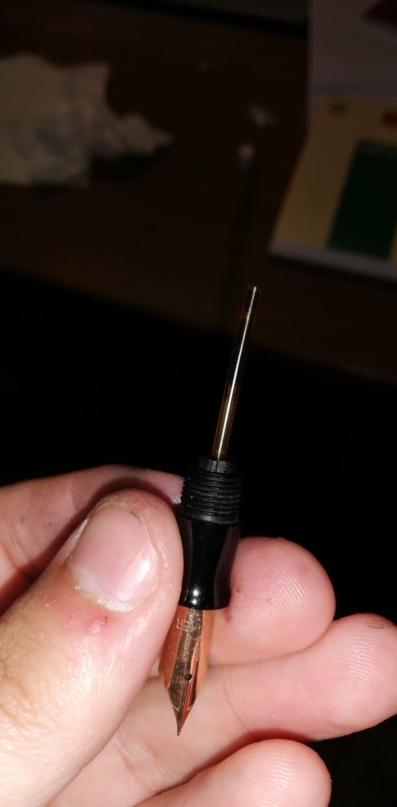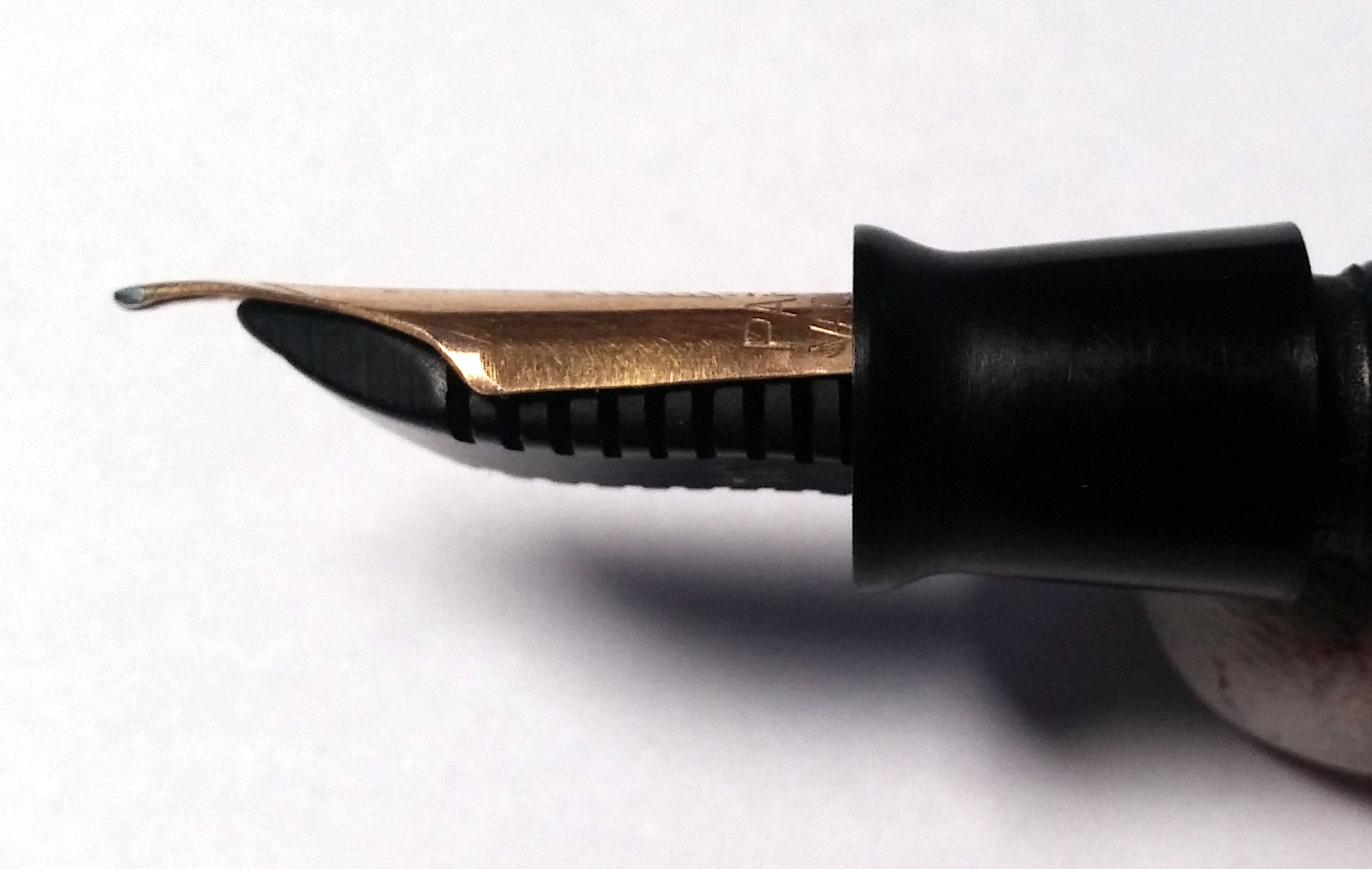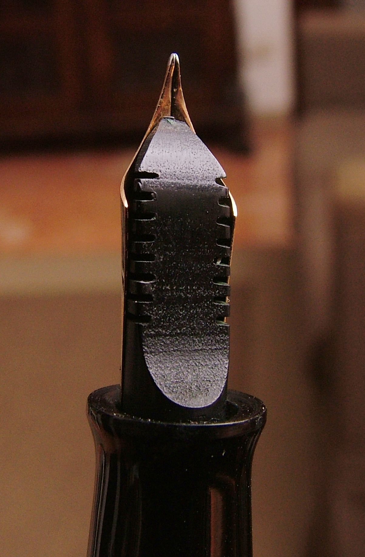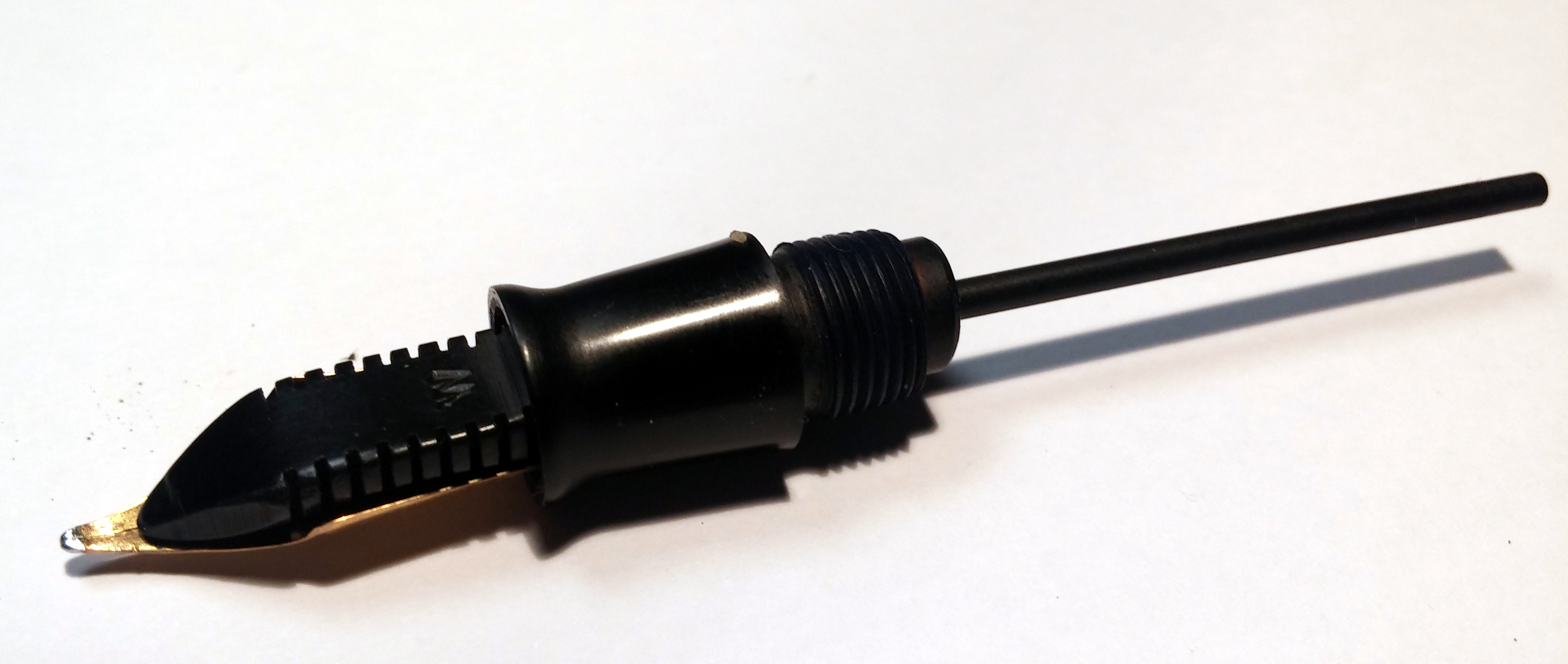 Qualche volta la sezione è un po' strettina e occorre più di un tentativo per posizionare correttamente pennino e alimentatore. Nel caso della Vacumatic devi porre correttamente il pennino sull'alimentatore (vedi foto sotto). Poi (con i metodi spiegati sopra) infili il tutto finchè il culo dell'alimentatore è a filo con il culo della parte filettata della sezione.