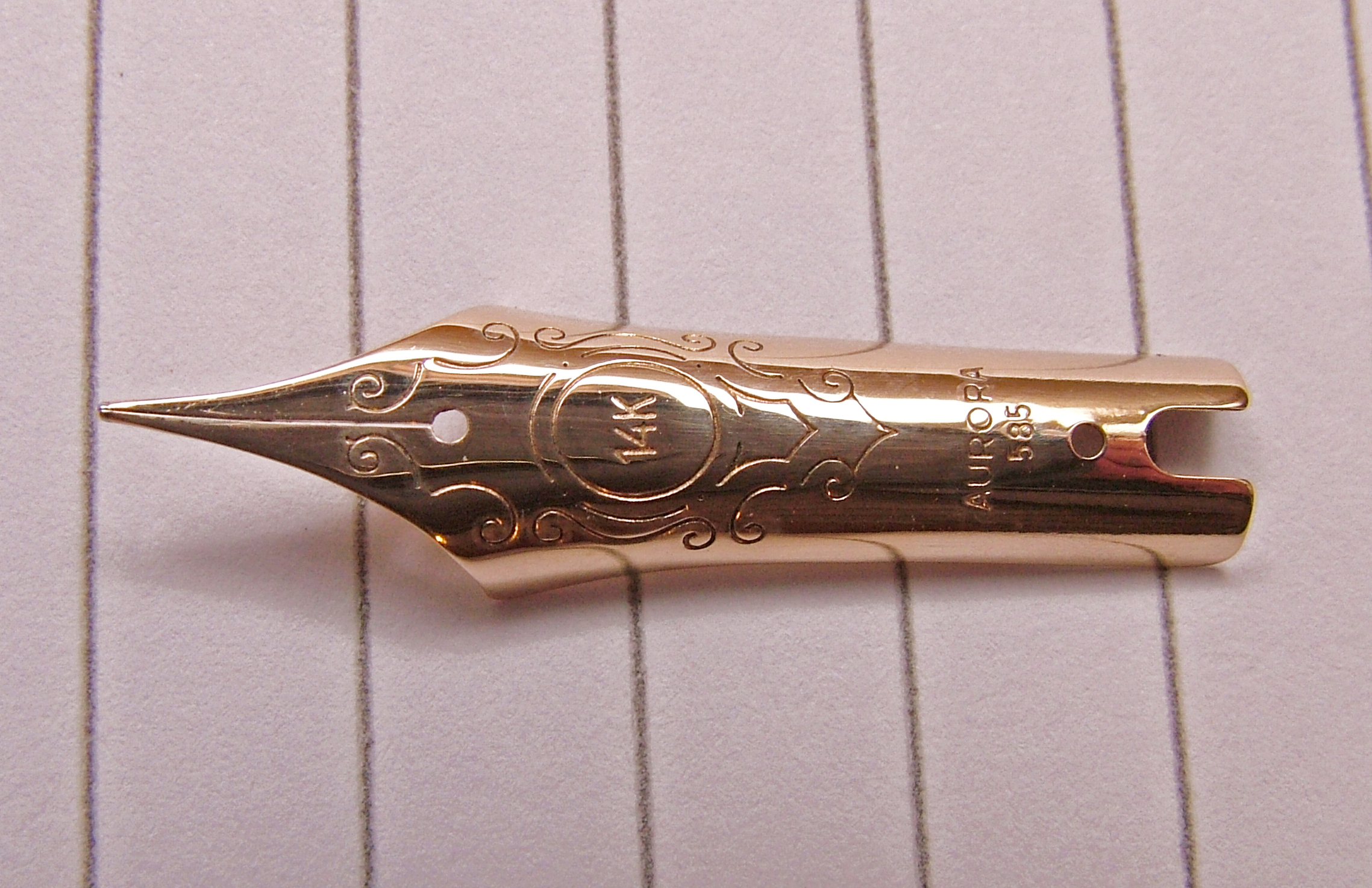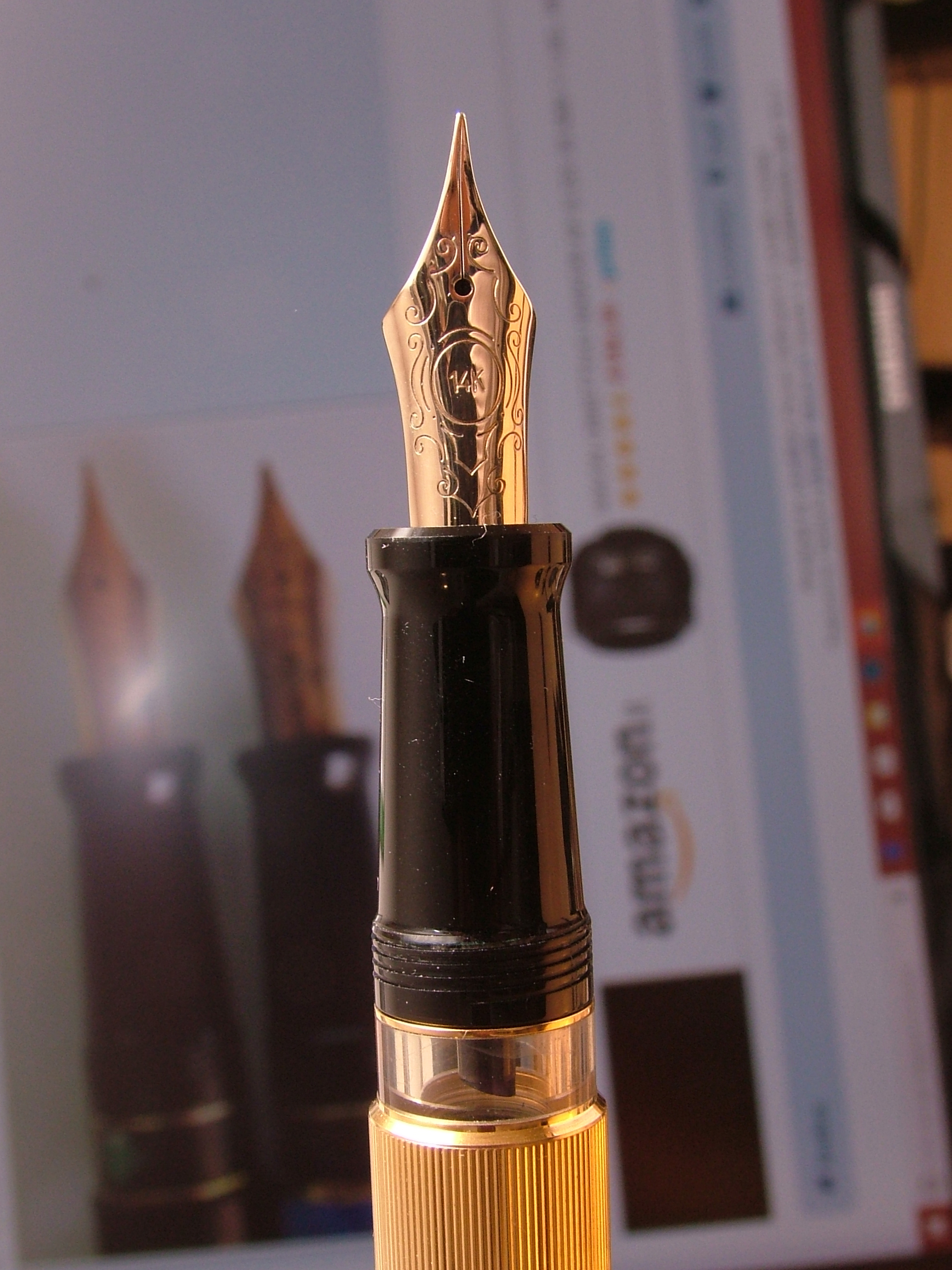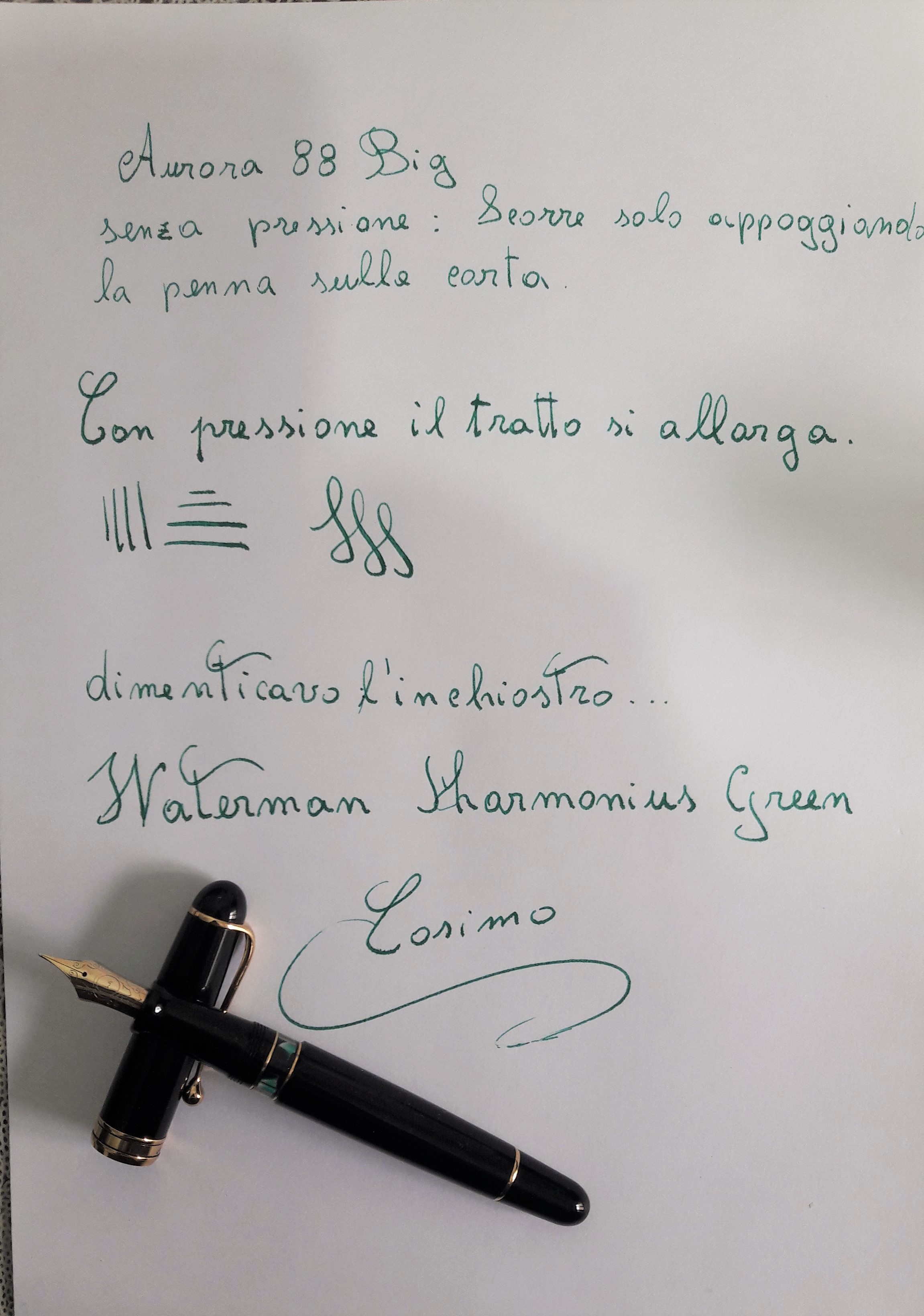 La penna è forse inusata, o comunque tenuta molto bene, ma non ho trovato indicazioni della misura del tratto; "e dopo un anno di forum, ancora non sei in grado riconoscerlo ?" direte voi; in effetti mi risulta difficile, perche lo trovo molto variabile. Usato con la mia mano, forse più adusa alla zappa che alla penna, direi M. Però se la penna viene usata con mano leggera il tratto si assottiglia visibilmente. Perdonate la grafia, già pessima normalmente, ma in questo caso particolarmente brutta a causa del dolore al polso.