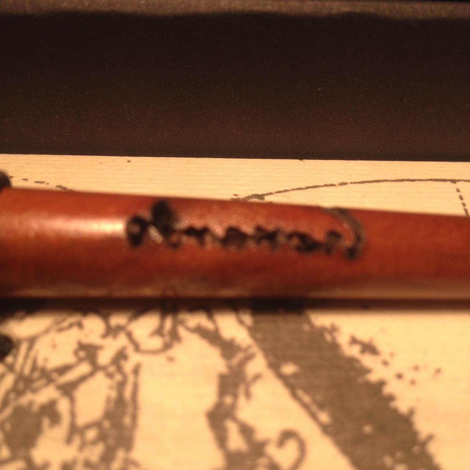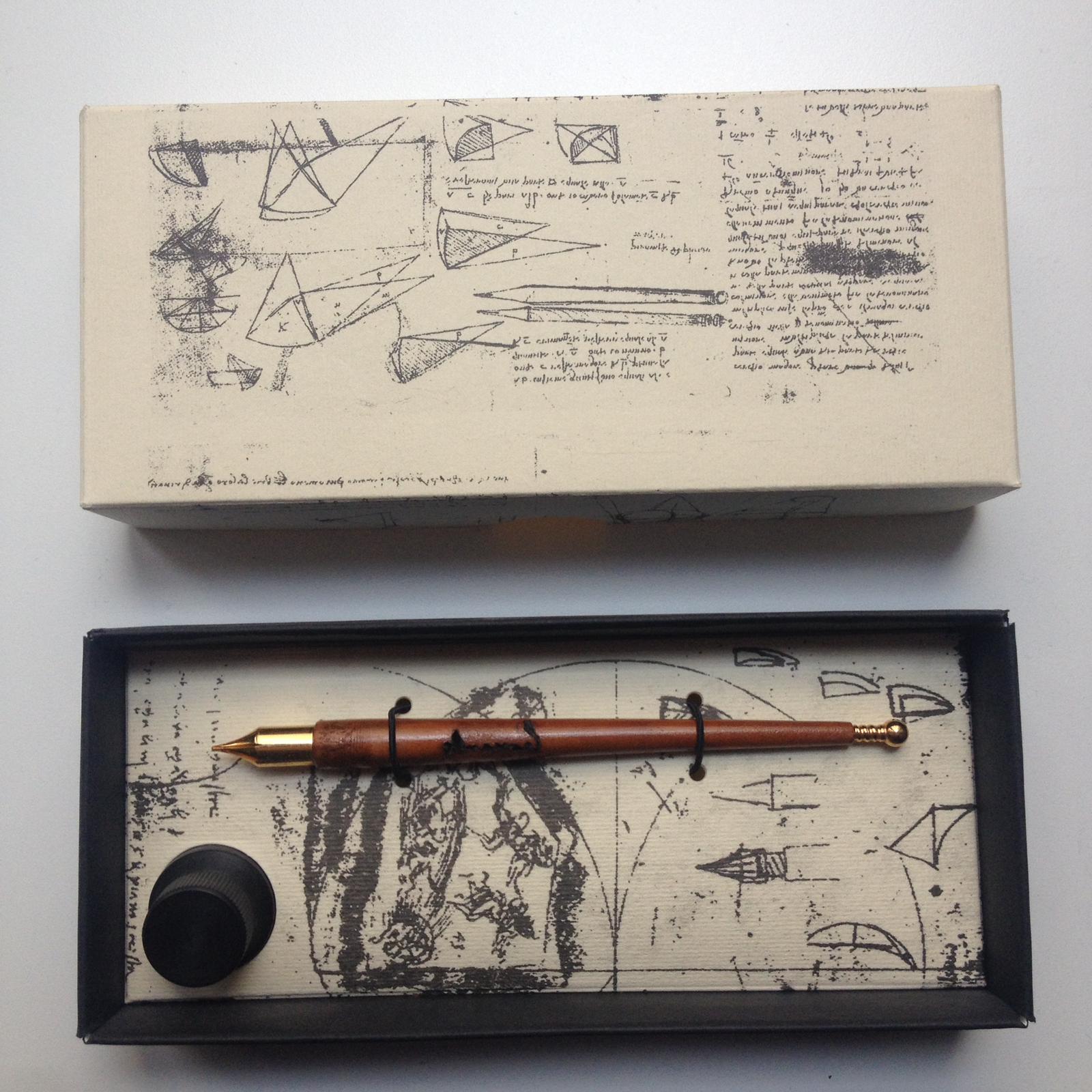 Molto carine (scusate, in generale, la scarsa qualità delle foto, scattate col cellulare) erano anche la scatolina della confezione, il boccettino di inchiostro (di plastica), e la incisione della firma di Leonardo – rigorosamente da destra verso sinistra – marchiata a fuoco sulla cannuccia in legno dello stilo.