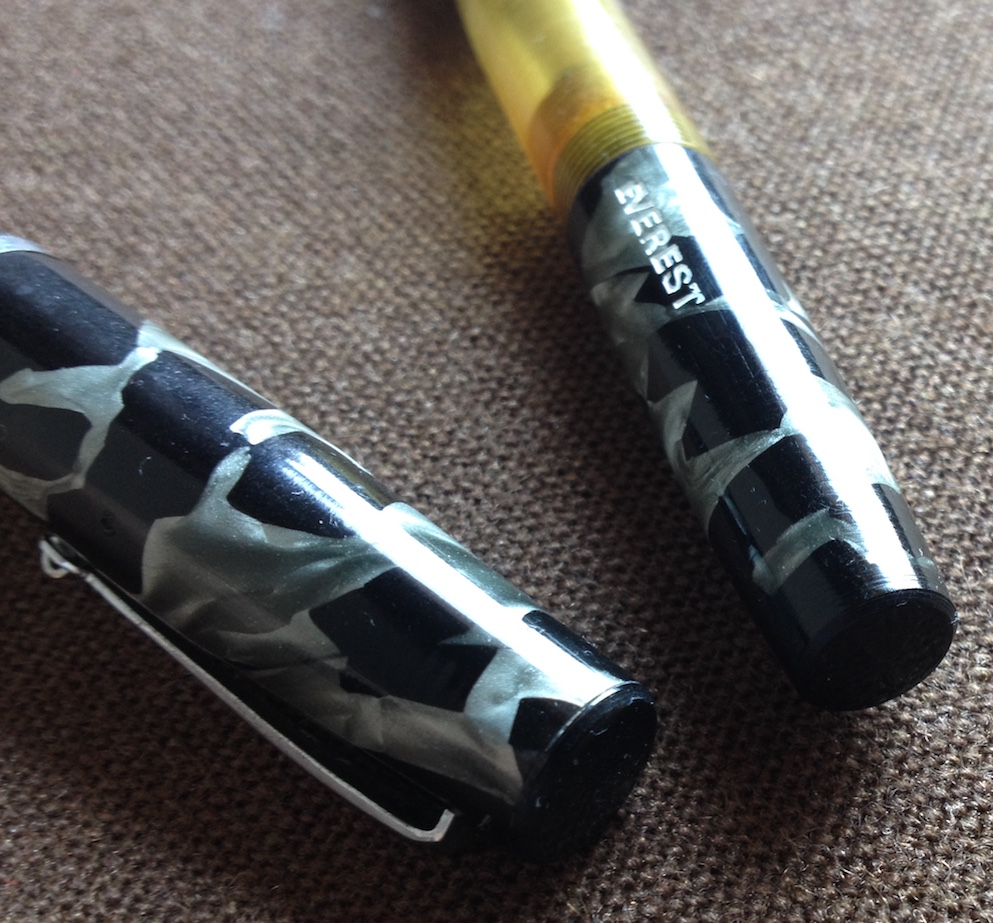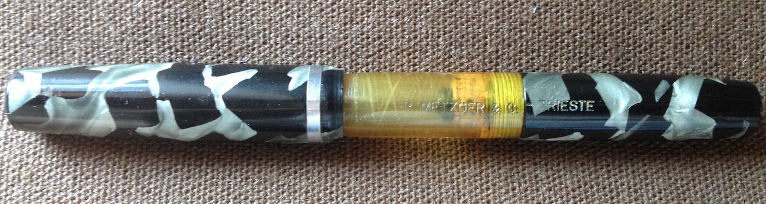 è veramente fuori dal comune. Ma la ditta si pregiava di produrre penne a inchiostro visibile. Reca sia la pubblicità del birrificio R. Metzger di Trieste, sia il marchio che sappiamo essere stato registrato nel 1947 a Torino. Sappiamo inoltre che la Stilo Everest era già attiva almeno fin dal 1943 e che spediva franco di porto previo pagamento con vaglia. Garantiva anche pennini nel metallo più nobile, ma questa ne era sprovvista purtroppo, corredata solo da una banale seconda punta in vile metallo che si è spezzata. Se qualcuno avesse un pennino Everest che gli avanza, mi avvisi in PM, grazie! La penna è lunga 13 cm, il fusto ha un diametro di 12 mm e pesa 16 gr. senza inchiostro. Il caricamento è a siringa, anch'esso inusuale per una penna torinese.