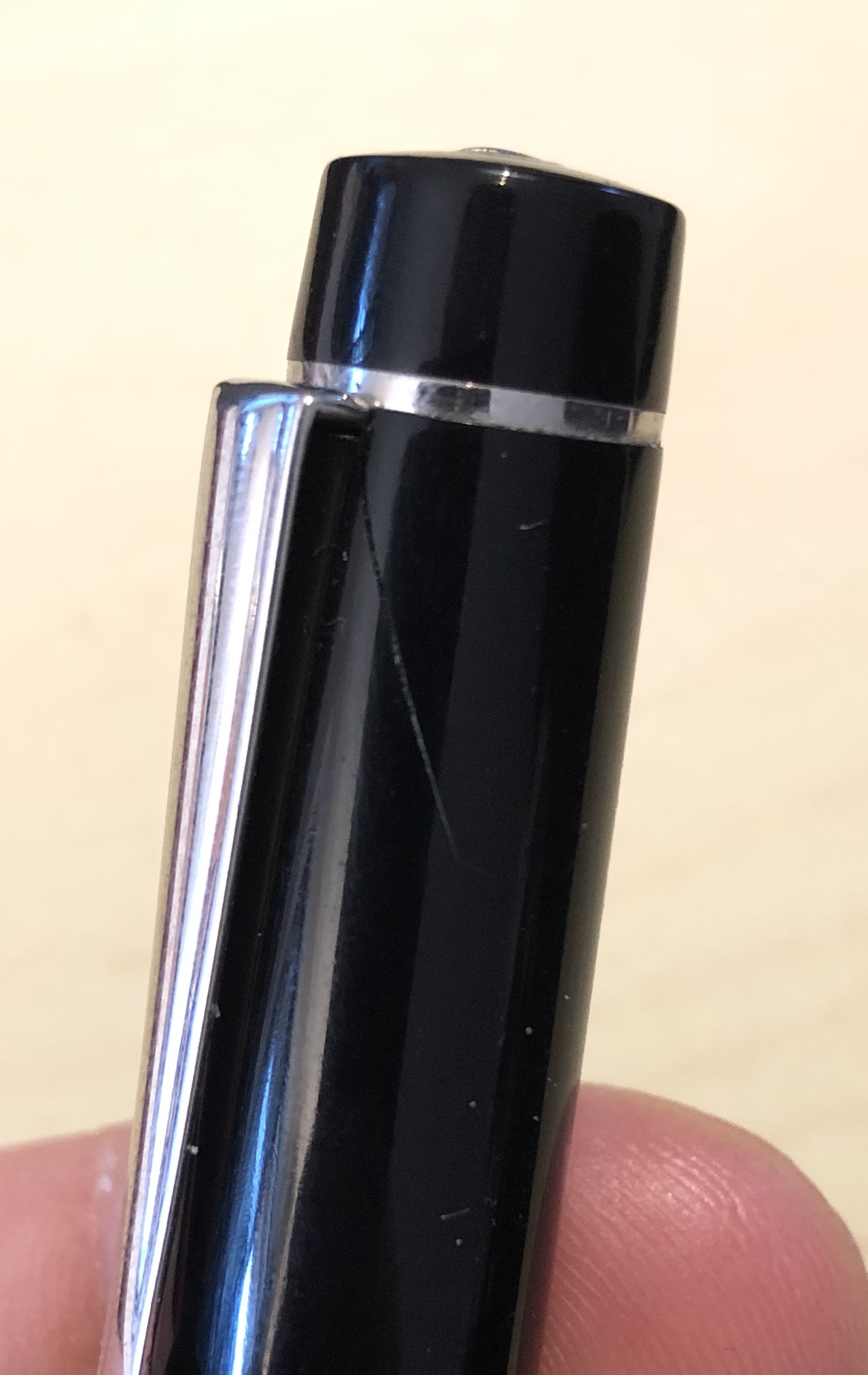 Fortunatamente la penna non ha riportato danni agli organi principali; lo stesso non si può dire per il cappuccio, sul quale si è formata una crepa di circa 1,5cm che parte dalla clip.