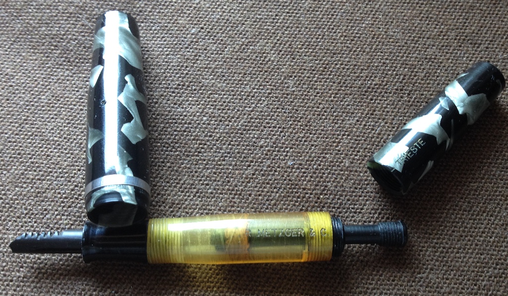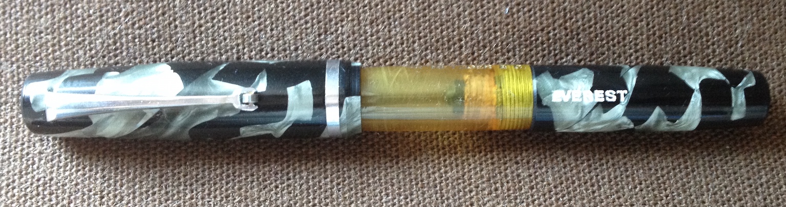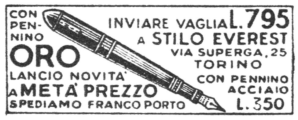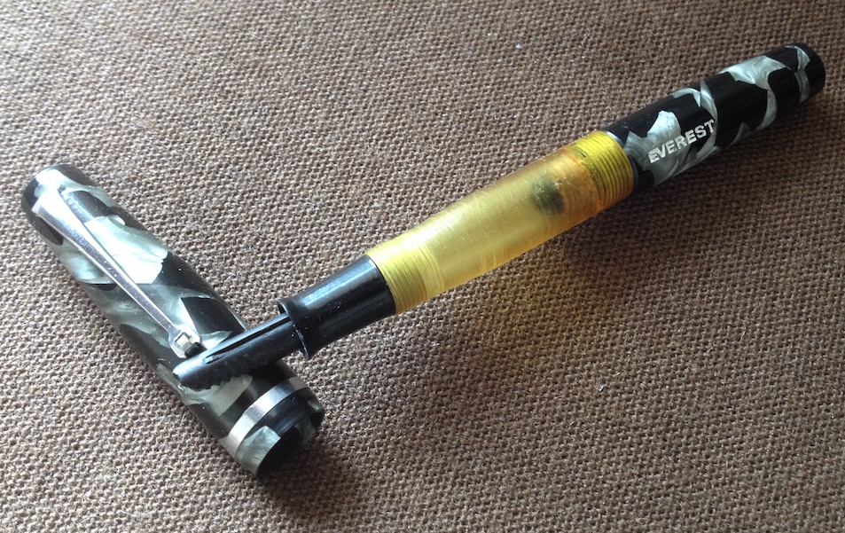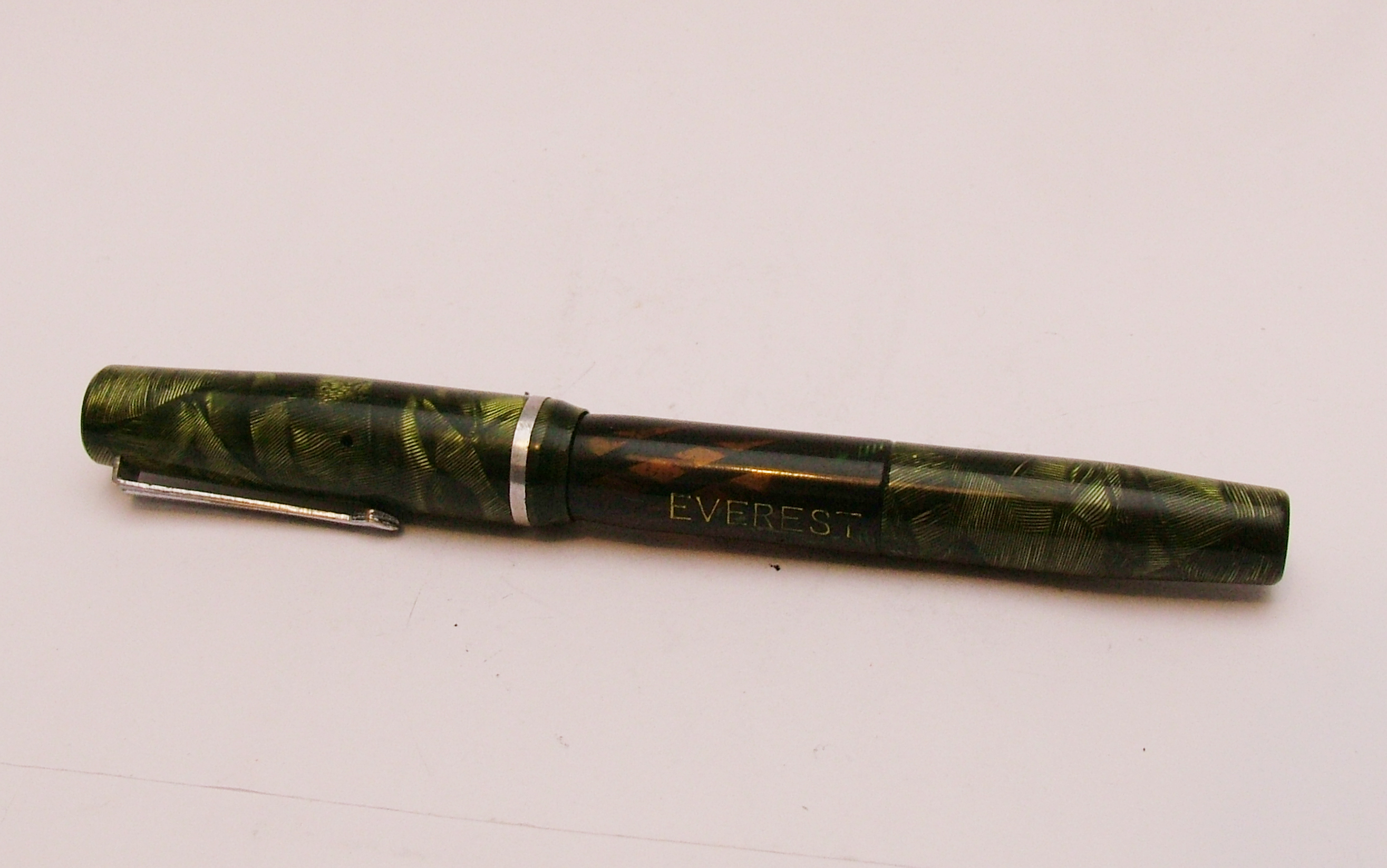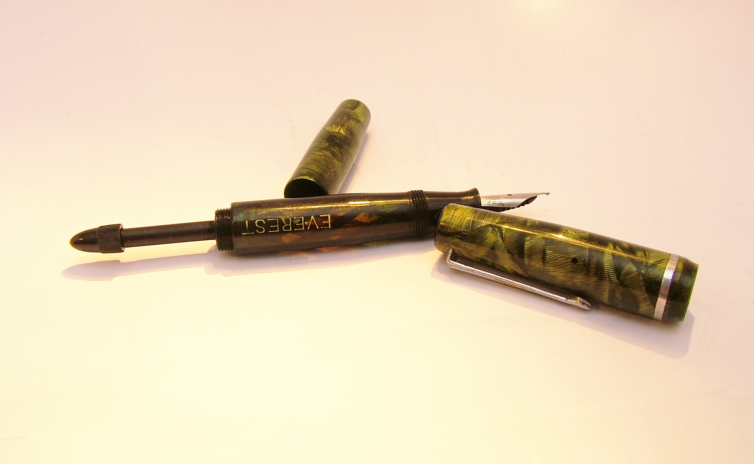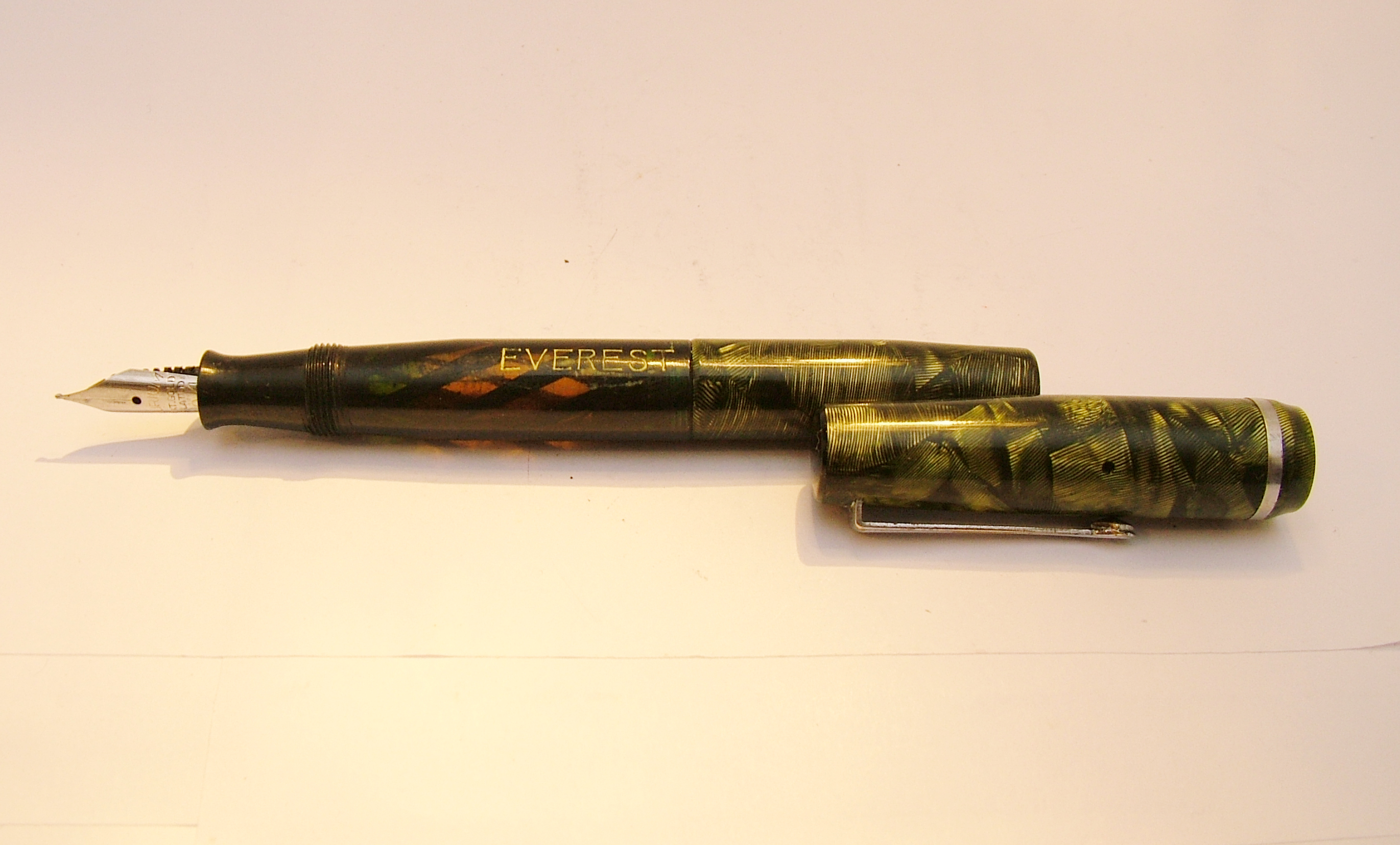 Pescata nella baia tempo fa, questa mi aveva proprio incuriosito. Al di là della mia livrea preferita (il tipo marmorizzato) che ricorda la mimetica dell'Armata rossa usata durante le esercitazioni in Siberia, il serbatoio in plastica trasparente GIALLA :shock: :shock: è veramente fuori dal comune. Ma la ditta si pregiava di produrre penne a inchiostro visibile. Reca sia la pubblicità del birrificio R. Metzger di Trieste, sia il marchio che sappiamo essere stato registrato nel 1947 a Torino. Sappiamo inoltre che la Stilo Everest era già attiva almeno fin dal 1943 e che spediva franco di porto previo pagamento con vaglia. Garantiva anche pennini nel metallo più nobile, ma questa ne era sprovvista purtroppo, corredata solo da una banale seconda punta in vile metallo che si è spezzata. Se qualcuno avesse un pennino Everest che gli avanza, mi avvisi in PM, grazie! La penna è lunga 13 cm, il fusto ha un diametro di 12 mm e pesa 16 gr. senza inchiostro. Il caricamento è a siringa, anch'esso inusuale per una penna torinese.