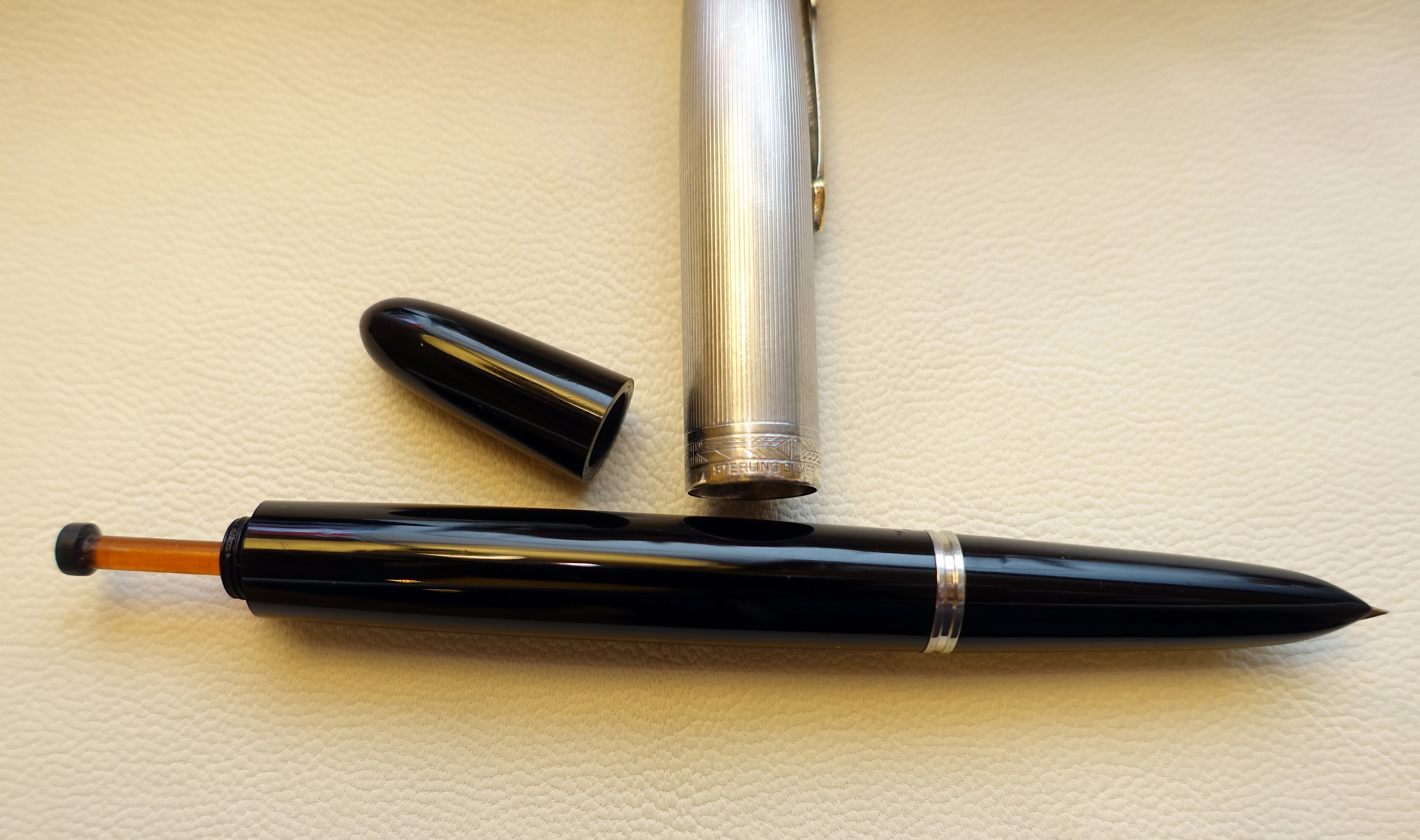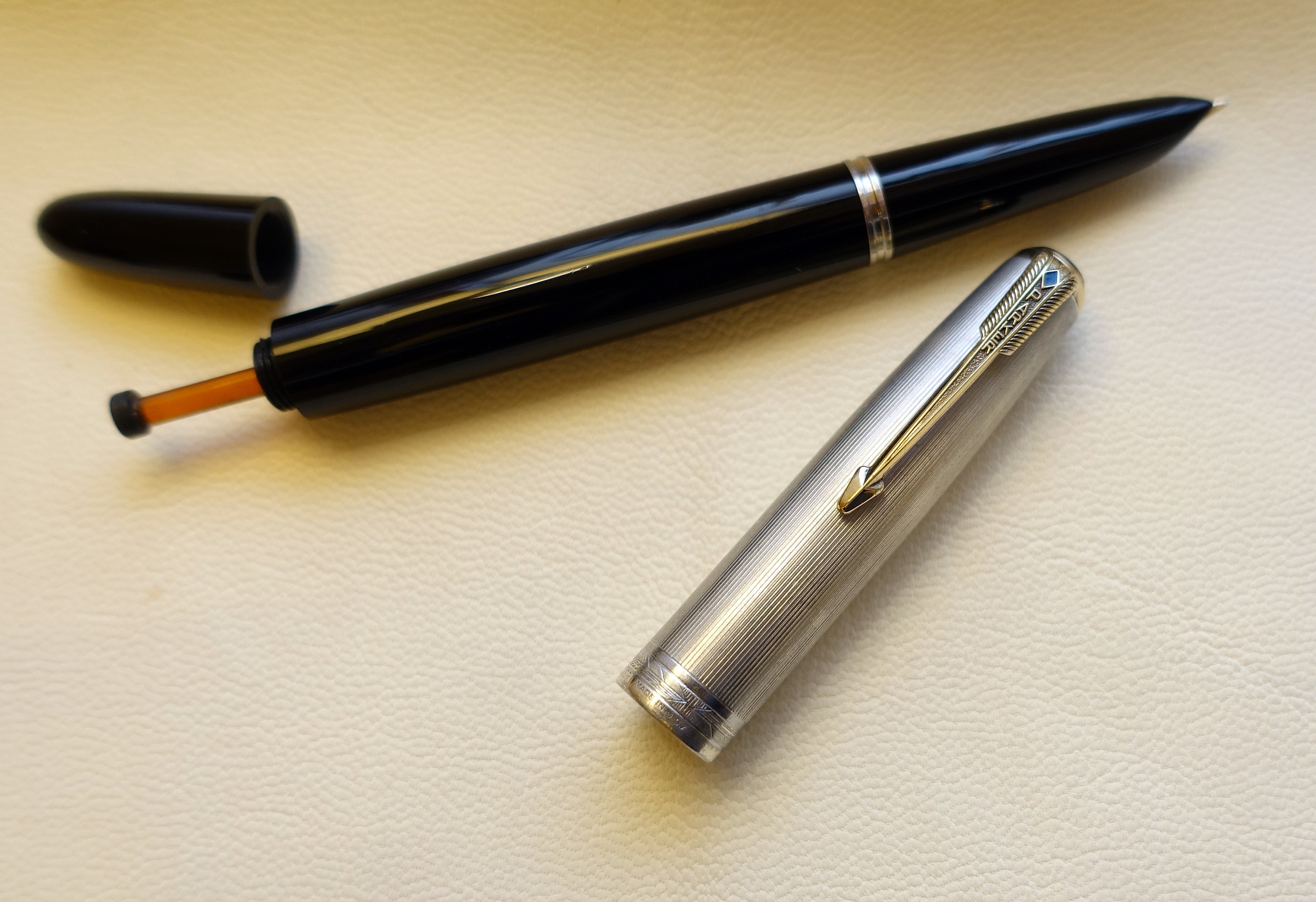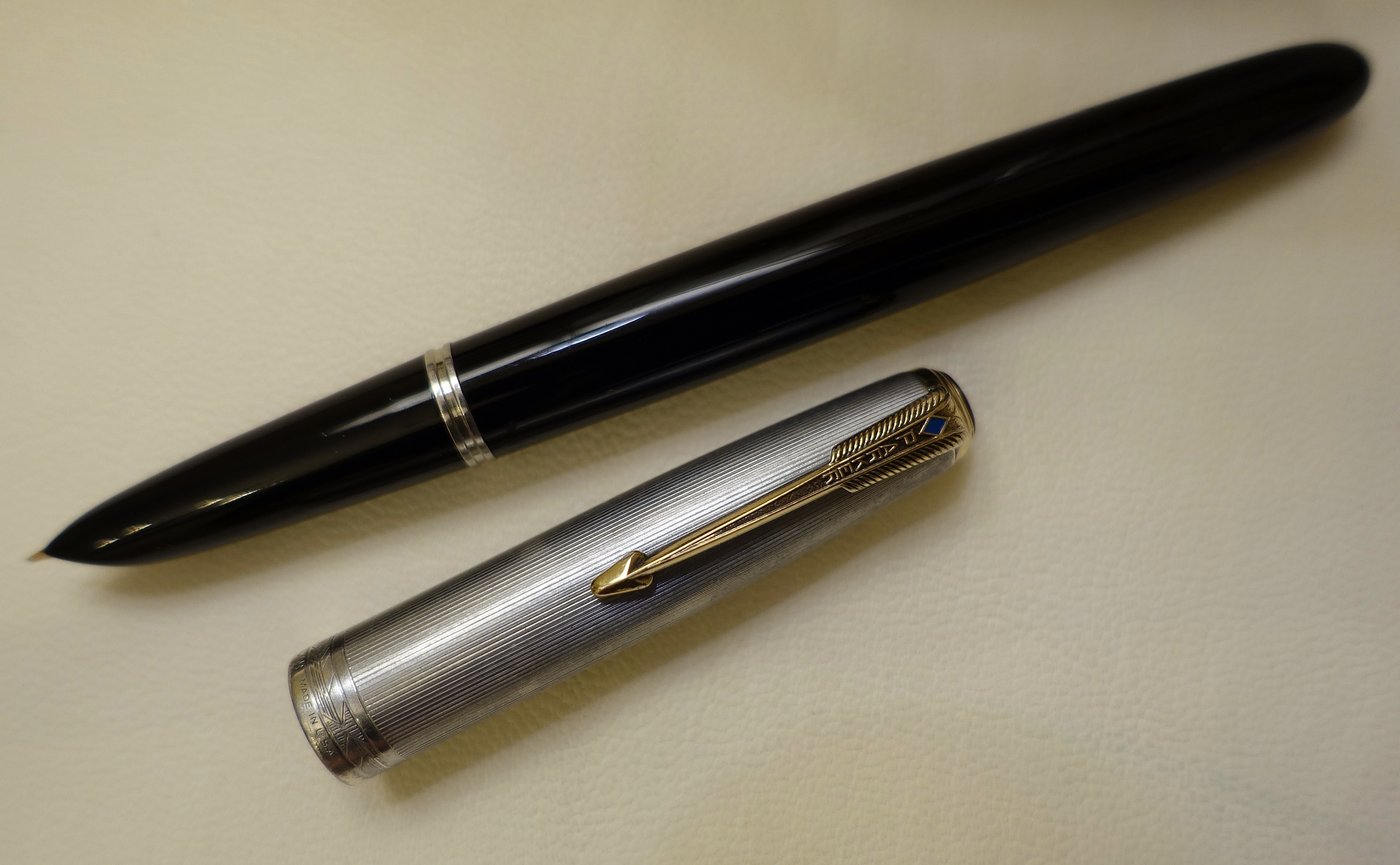 La Parker 51 con la Aurora 88 è la mia penna preferita, questo ultimo ritrovamento è dunque un sogno, l' avevo vista la prima volta nella collezione di un amico e pensavo che mai più ne avrei trovata una simile. Un colpo di fortuna ha voluto che la scovassi incredibilmente su ebay, "nascosta" tra una di quelle inserzioni bizzarre dove si intuisce che il venditore non sa cosa ha per le mani e descrive la penna senza precise indicazioni, ho partecipato all'asta e mi è andata molto bene.