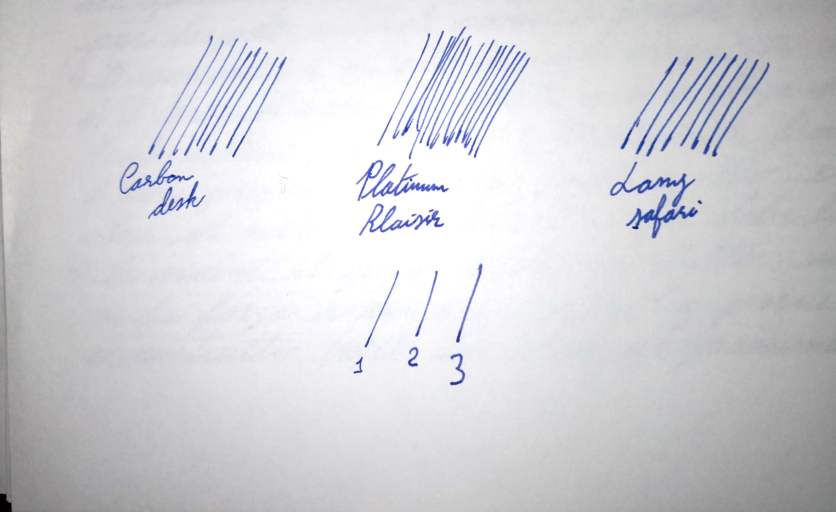 Tralasciando la calligrafia da bambino che ha appena smesso di giocare con le formine, si può notare come la platinum carbon sia caratterizzata da un tratto sottilissimo nonostante una carta da stampa dolphin di infima qualità (studente, non dimenticatelo), la lamy safari nonostante il pennino con su scritto EF si comporta un po' come un idrante, mentre la Plaisir che sono qui a recensire si trova in una bella via di mezzo.