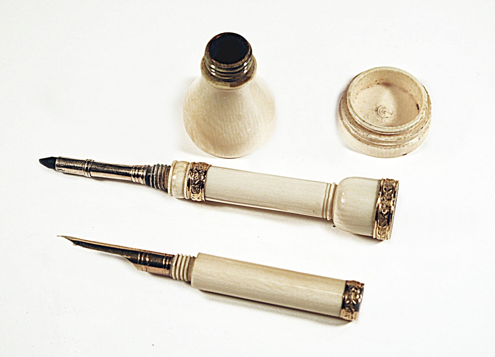 Baradel, Francia fine XVIII° secolo. Avorio, verette e pennino (fatto in guisa di quello d'oca) in oro. Punta di diamante della mostra tenutasi a Palazzo Giacomelli in Udine, gennaio-febbraio 2018.