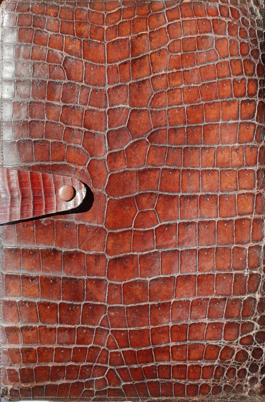 Scrittoio portatile in legno, ricoperto esternamente in coccodrillo ed internamente in marocchino. Portapennino/matita centimetrato. Da notare il pesa buste pro affrancatura. Fine XIX° secolo.