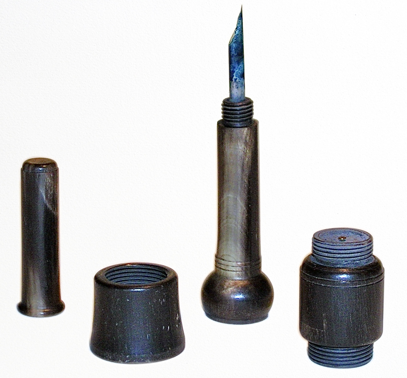 Penner in corno, fine XVIII° secolo, con penna, calamaio e sandracchiera. Inghilterra.