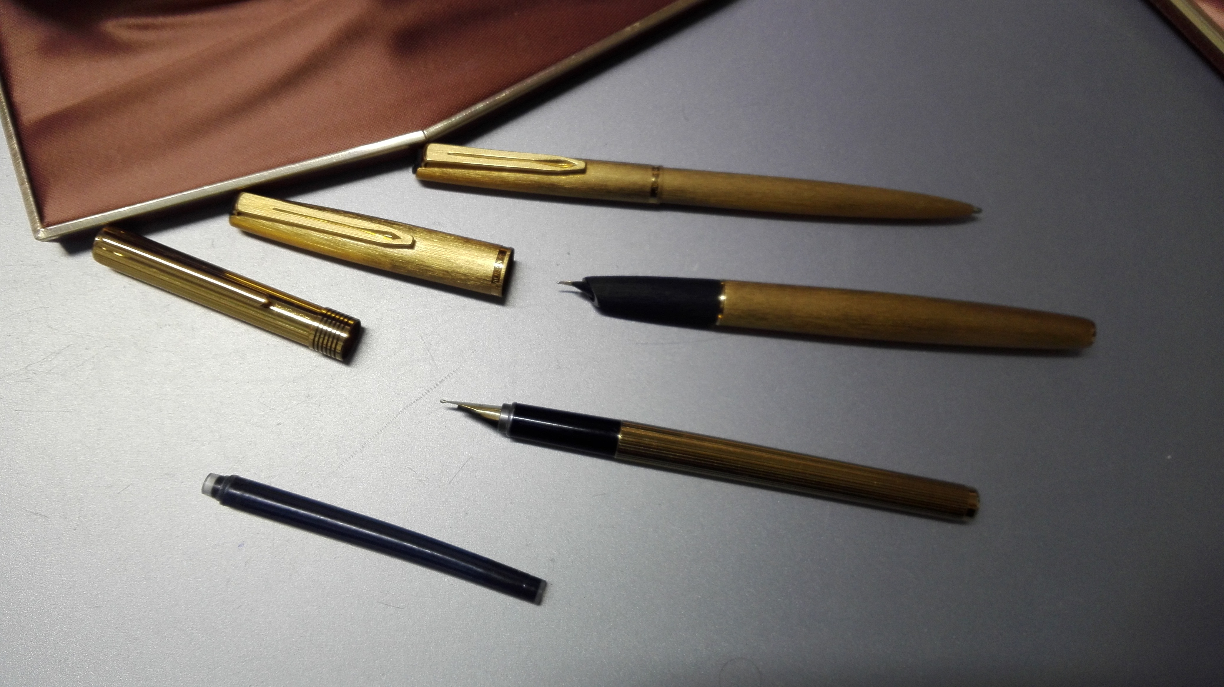 Vorrei cominciare a scrivere utilizzando la stilografica (ne ho due che mi sono state regalate nella seconda metà del secolo scorso e che non ho mai inchiostrato) e cercando notizie sulle penne stilografiche per scoprire quali siano i modelli in mio possesso per acquistare gli inchiostri ho scoperto per caso il forum. Premetto che entrambe dovrebbero funzionare con cartucce (di una ho la cartuccia originale regalatami assieme alla stilografica che pur essendo ancora inutilizzata presenta, tuttavia, l’inchiostro asciutto perché è rimasto chiuso assieme alla confezione della stilografica in un cassetto per troppo tempo). Le due stilografiche in mio possesso sono state prodotte da Aurora. Quella ricevuta in occasione della prima comunione assieme ad una penna a sfera con lo stesso trattamento del fusto è un modello in oro satinato mentre a seconda, da una ricerca da me effettuata, dovrebbe essere una Aurora modello Marco Polo color oro.