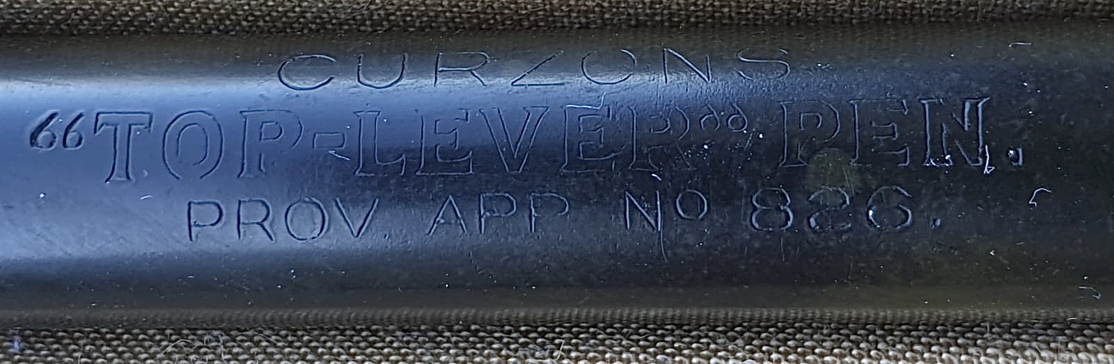 CURZONS “TOP-LEVER“ PEN. PROV. APP. Nº 826, stilografica in ebanite con caricamento brevettato a levetta posta alla sommità del fusto. Pennino Warranted 14. Modello alquanto raro, introdotto dalla Curzons Ltd. (Inghilterra) nel 1926 e prodotto per circa un anno. Nei disegni del brevetto, la descrizione del meccanismo “top lever”.