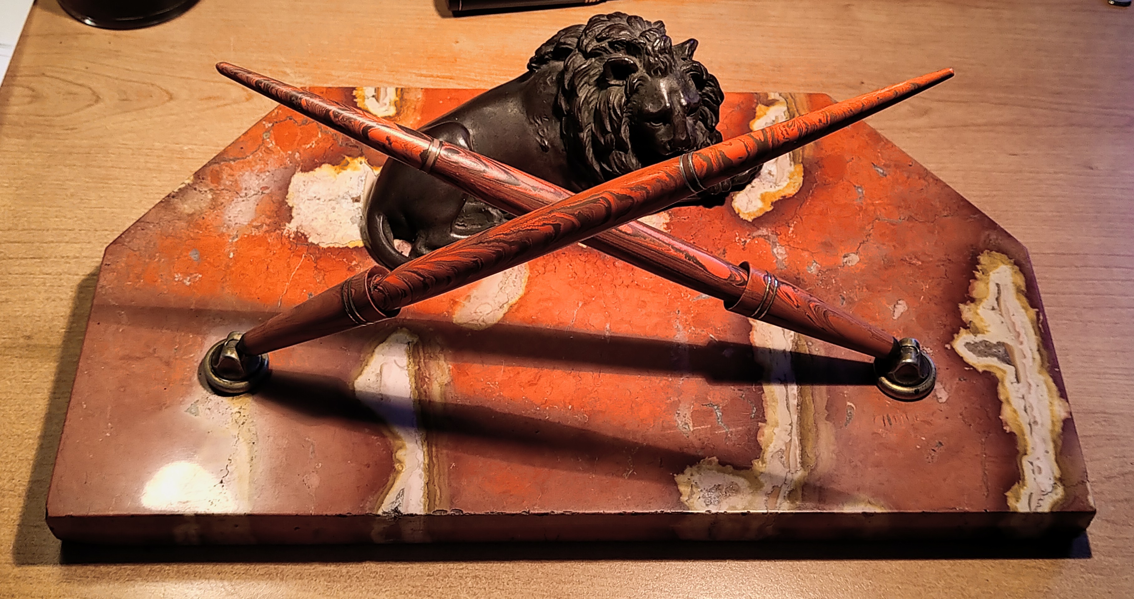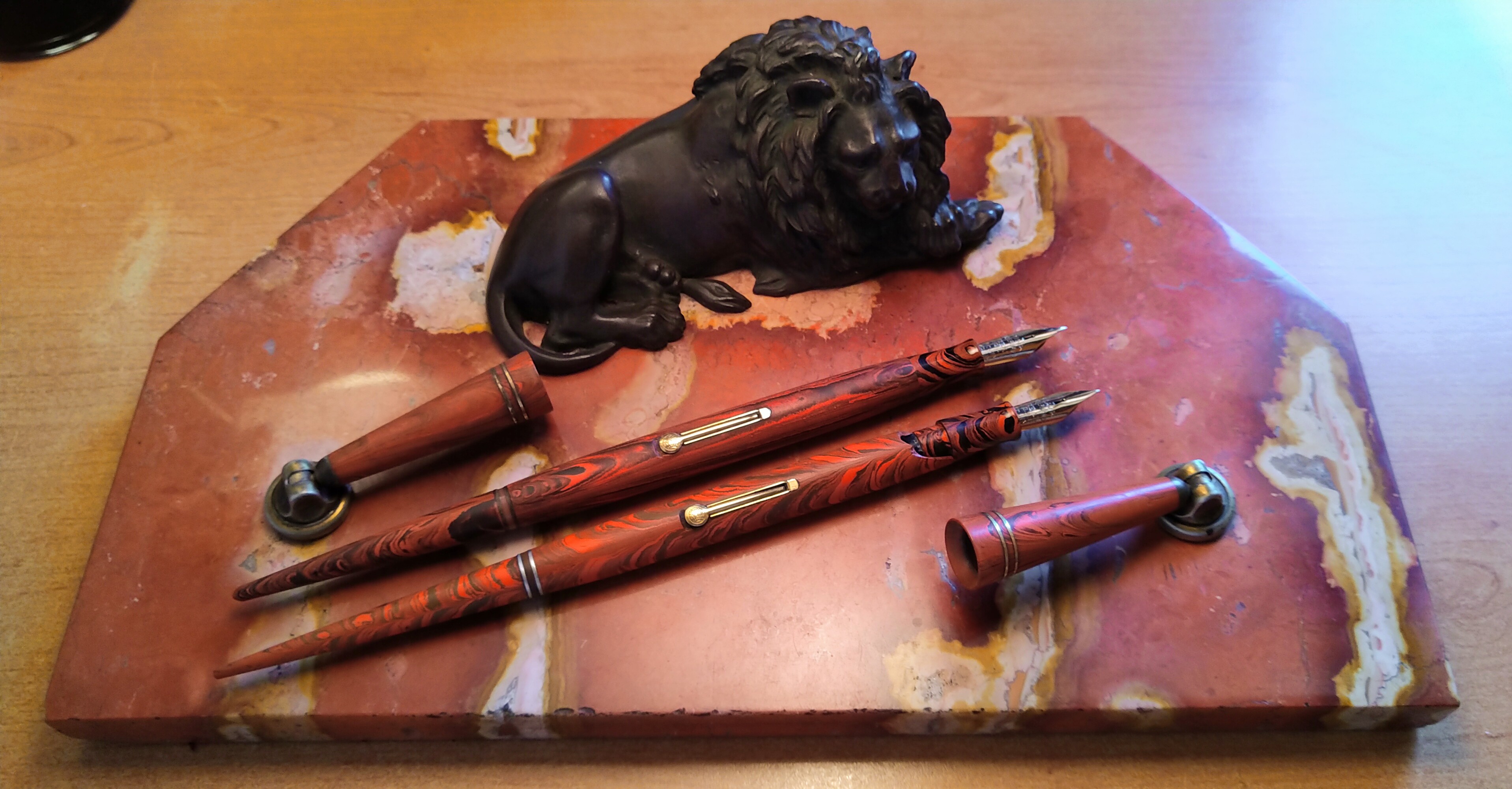 Ritornato al negozietto per acquistare definitivamente l'oggetto, appena giunto a casa cominciai ad analizzare il nuovo arrivato. Sì tratta di uno set di stilofori da scrivania composto da una bella (e pesante) base in marmo rosa, un bel leone in bronzo decorativo, e due stilofori Waterman Red Ripple.