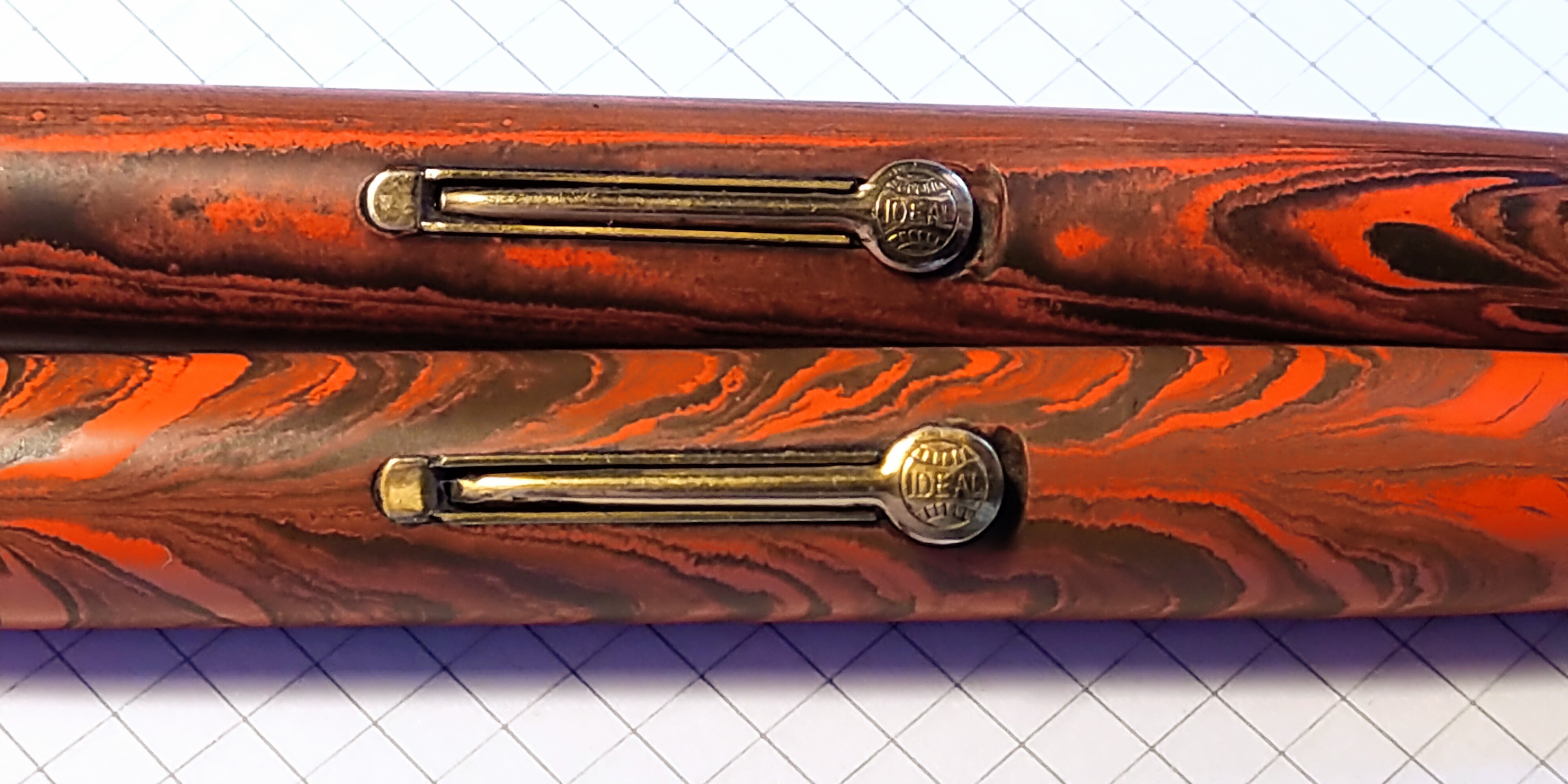 Per quanto riguarda le penne stesse, la Pink come hai notato presenta la parte terminale accorciata, in aggiunta il corpo non sembra avere alcuna scritta. Probabilmente si saranno cancellate, essendo sulla nera appena leggibili. Altro dettaglio che mi rende perplesso è la trama dell'ebanite: sulla Pink vi sono meno volute rispetto alla Black, perciò inizialmente pensavo che il corpo della Pink fosse stato sostituito. Potrebbe anche trattarsi di una differente miscelazione che ha portato ad una penna meno Ripple e piu lineare.