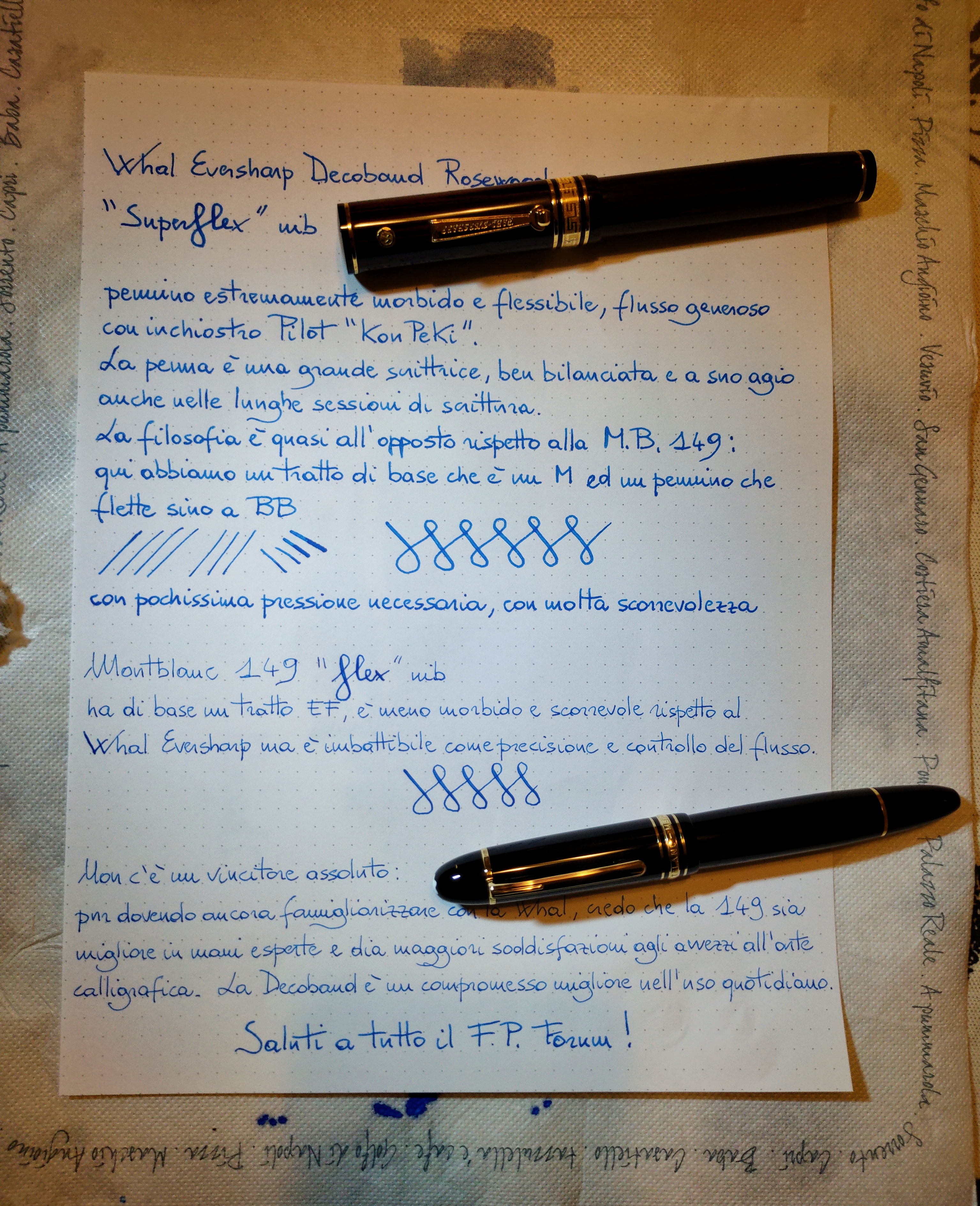 Sin da quando fu annunciata (anche su questo forum, dal suo proprietario-creatore) la Wahl con pennino "superflex", ho avuto il dubbio se le promesse sarebbero state mantenute; ora (per la prima volta) ho potuto farmi un'dea precisa sulle due penne (nonostante "Fufluns" abbia ampiamente illustrato la 149 "flex", questo intervento comparativo è una gradita aggiunta).