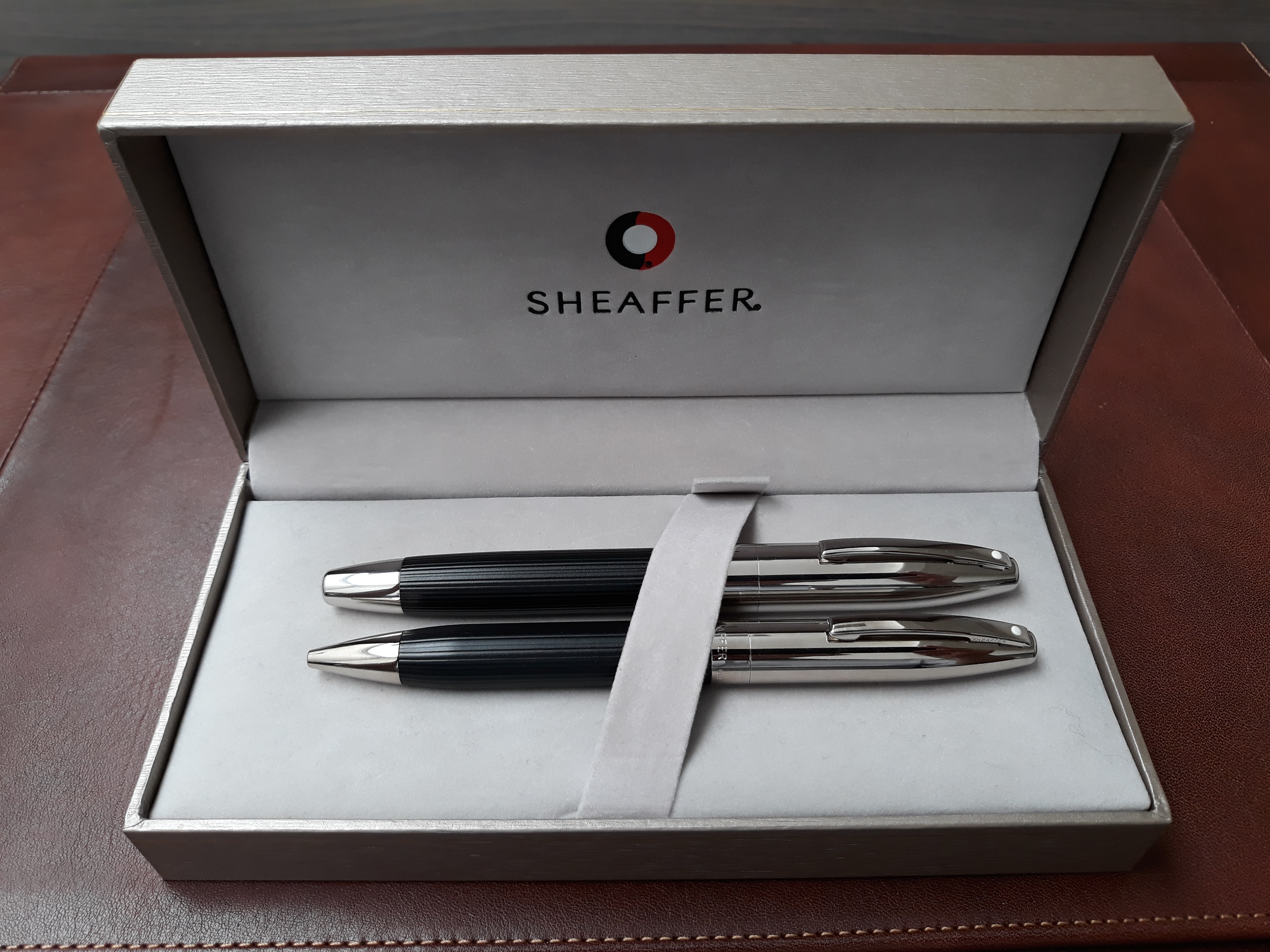 Mi è stato fatto un regalo di compleanno: il set Sheaffer Legacy che vedete, con confezione, garanzia a vita (2001) e scatoletta di cartucce intonsa. La stilografica non è mai stata inchiostrata (scusate la povertà delle immagini).