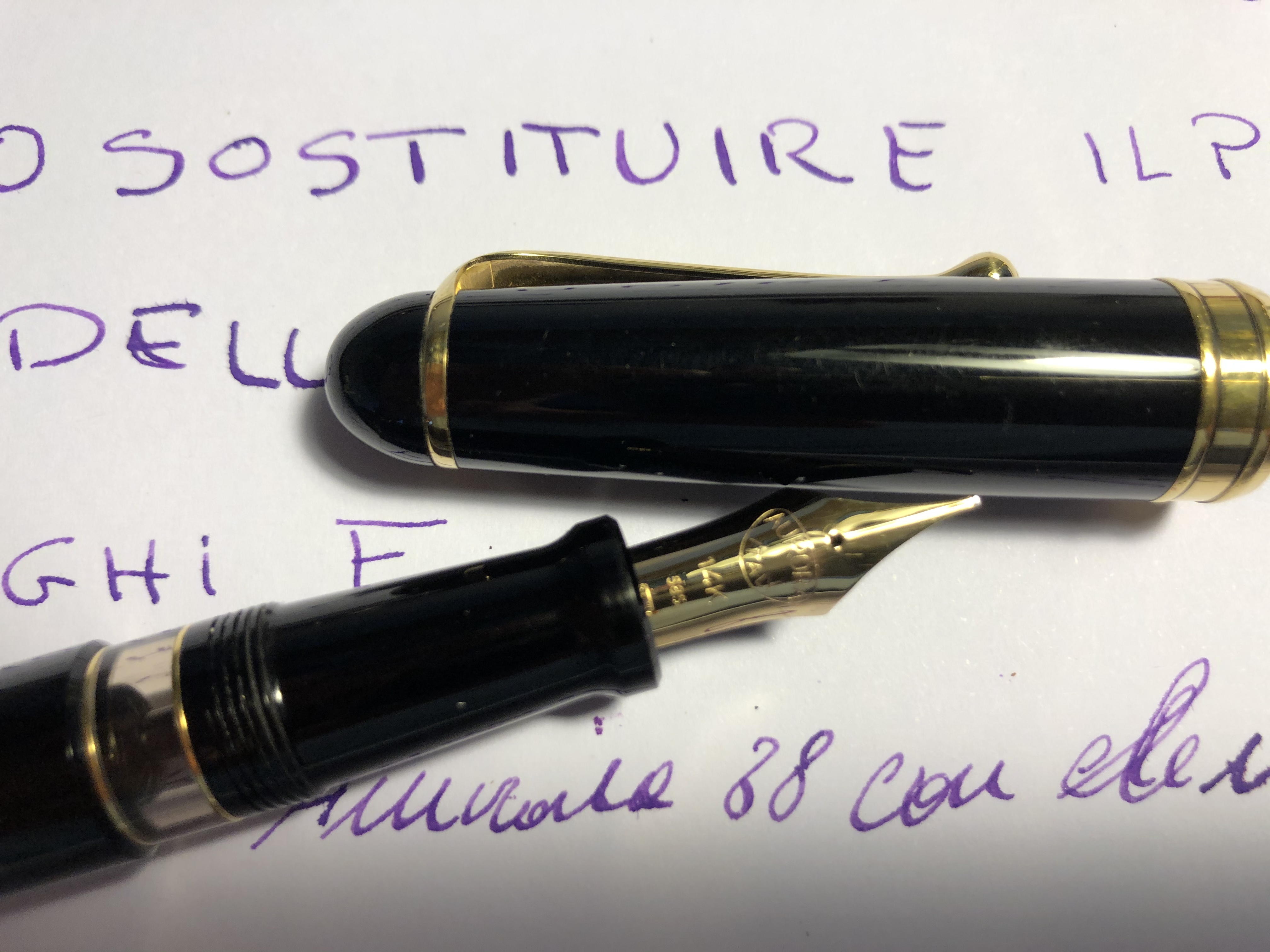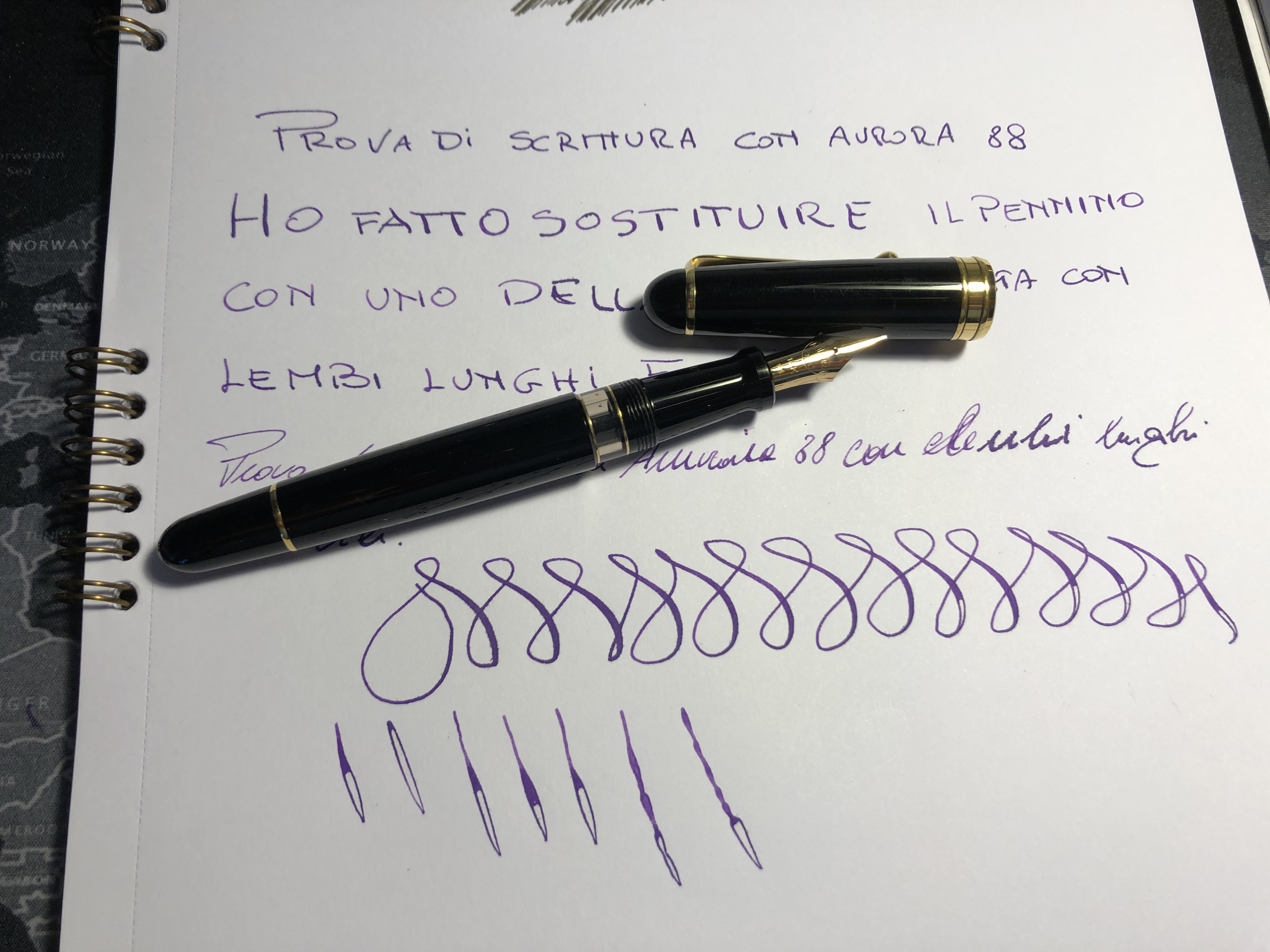 Ciao a tutti... come promesso vi faccio vedere il risultato della sostituzione del pennino M sulla mia Aurora 88 big. Ho fatto installare dalla aurora un F a lembi lunghi felssibile.... alcuni mi consigliavano di non aspettarmi tanta flessibilità... per la poca esperienza in merito ai flessibili devo dire che il pennino ha dimostrato di cavarsela più che decentemente con una buona flessione... solo un appunto, in salita forse graffia un pochino...... tutto sommato sono rimasto contento. Anche se il medio che montava era un buon pennino.... vi allego una prova di scrittura da profano....