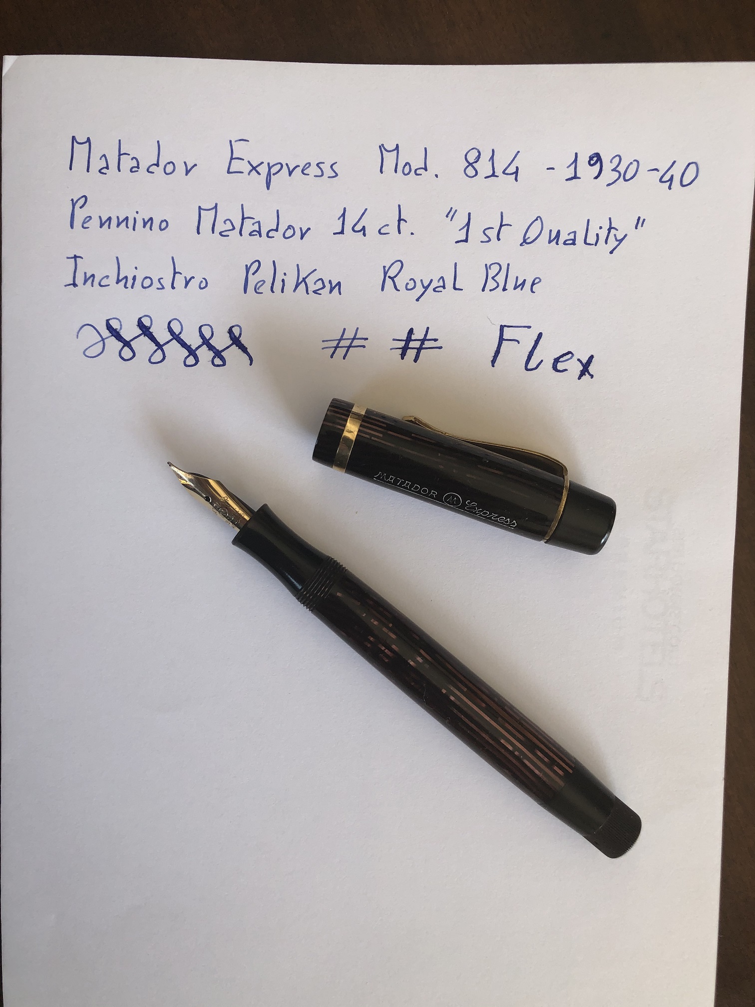 Complessivamente, un sistema piuttosto semplice e pratico, ma alcune componenti avrebbero potuto essere progettate con maggiore cura. Ad esempio il movimento dello stantuffo con la rotazione del fondello viene assicurato dalla presenza di un singolo piccolo perno o paletto in plastica (o ebanite?) infilato in un forellino dello stesso stantuffo. Non so come questo perno fosse inserito originariamente, nel mio esemplare era rimovibile e in corrispondenza del foro era presente una crepa. Un difetto forse provocato dall'eccessiva pressione con cui era stato inserito il perno. Questa situazione mi ha costretto a incollare il perno sullo stantuffo, che ho cercato di rafforzare in corrispondenza della crepa. In pennino flex 14 ct. Matador é piuttosto elegante e ben proporzionato sulle dimensioni della stilo. Il gruppo pennino - alimentatore (in ebanite) é inserito nella sezione a pressione. Ho avuto piccoli problemi nello smontaggio a causa di alcune incrostazioni di inchiostro un poco resistenti alle varie operazioni di pulizia, e nessun problema nel reinserimento in sezione. Anche senza una messa a punto che sicuramente farò in seguito, la scrittura é abbastanza piacevole. E' presente un feed back tipico di molti pennini vintage, per nulla fastidioso. La stilo mi pare ben equilibrata, e forse senza cappuccio calzato (non calzo MAI il cappuccio sul fusto) può risultare un poco piccola per alcuni utilizzatori. Personalmente non ho mani molto grandi e non ho rilevato alcuna scomodità.