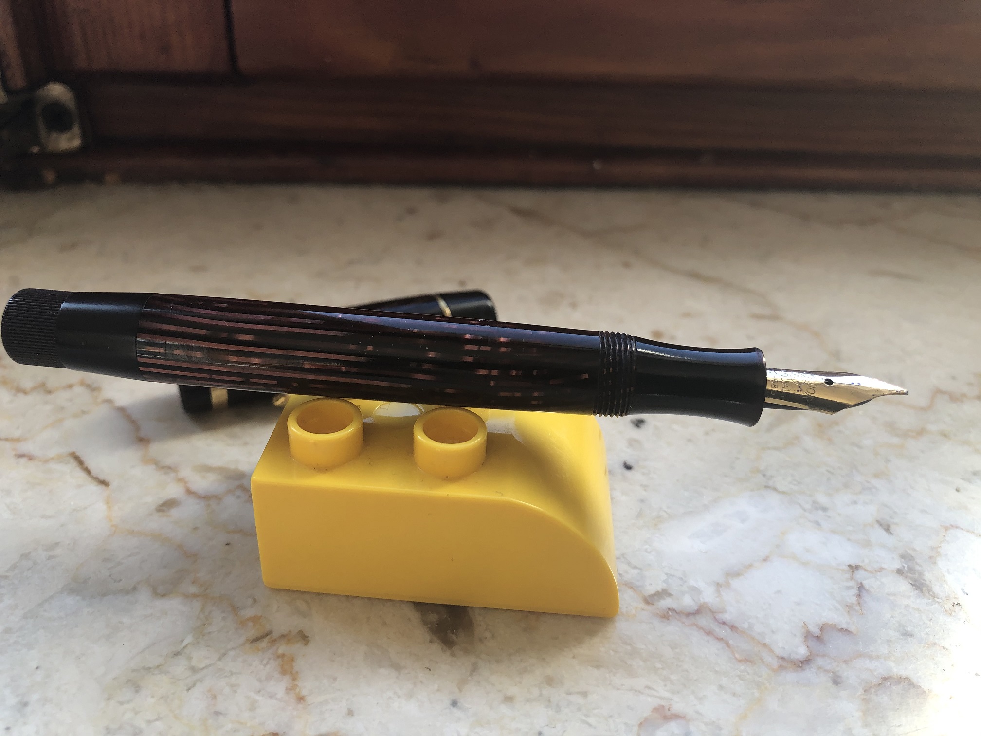 Questo modello é in celluloide tipo "striped", con sezione, fondello e top del cappuccio in ebanite. A proposito di copia, potremmo anche osservare che Pelikan utilizzò una celluloide striped nella seconda metà degli anni 50 per i suoi modelli 400, 400N e 400NN, ma penso sia meglio non azzardare paralleli poco probabili..