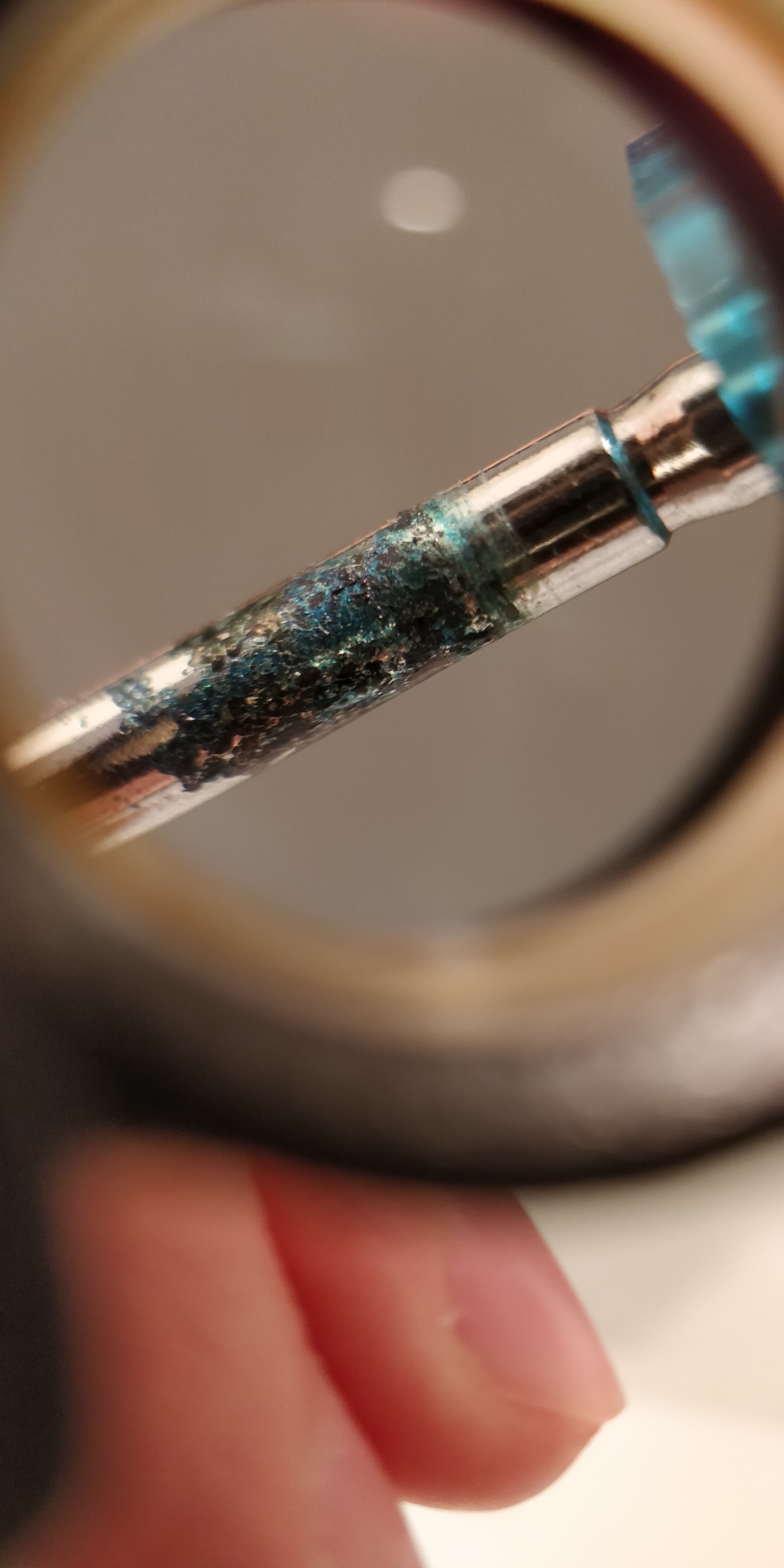 Usata molto poco e caricata con un Edelstein Rubino. La rispolvero dopo un po' e la trovo tutta fessurata sulla filetto del fusto dove si avvita il cappuccio. Peccato perché era una pennetta simpatica, ma c'era da immaginarselo, ovviamente nessuno regala nulla e se costa pochi euro il motivo c'è e si vede, come testimoniato anche dalle corrosioni mostrate qualche messaggio più su.