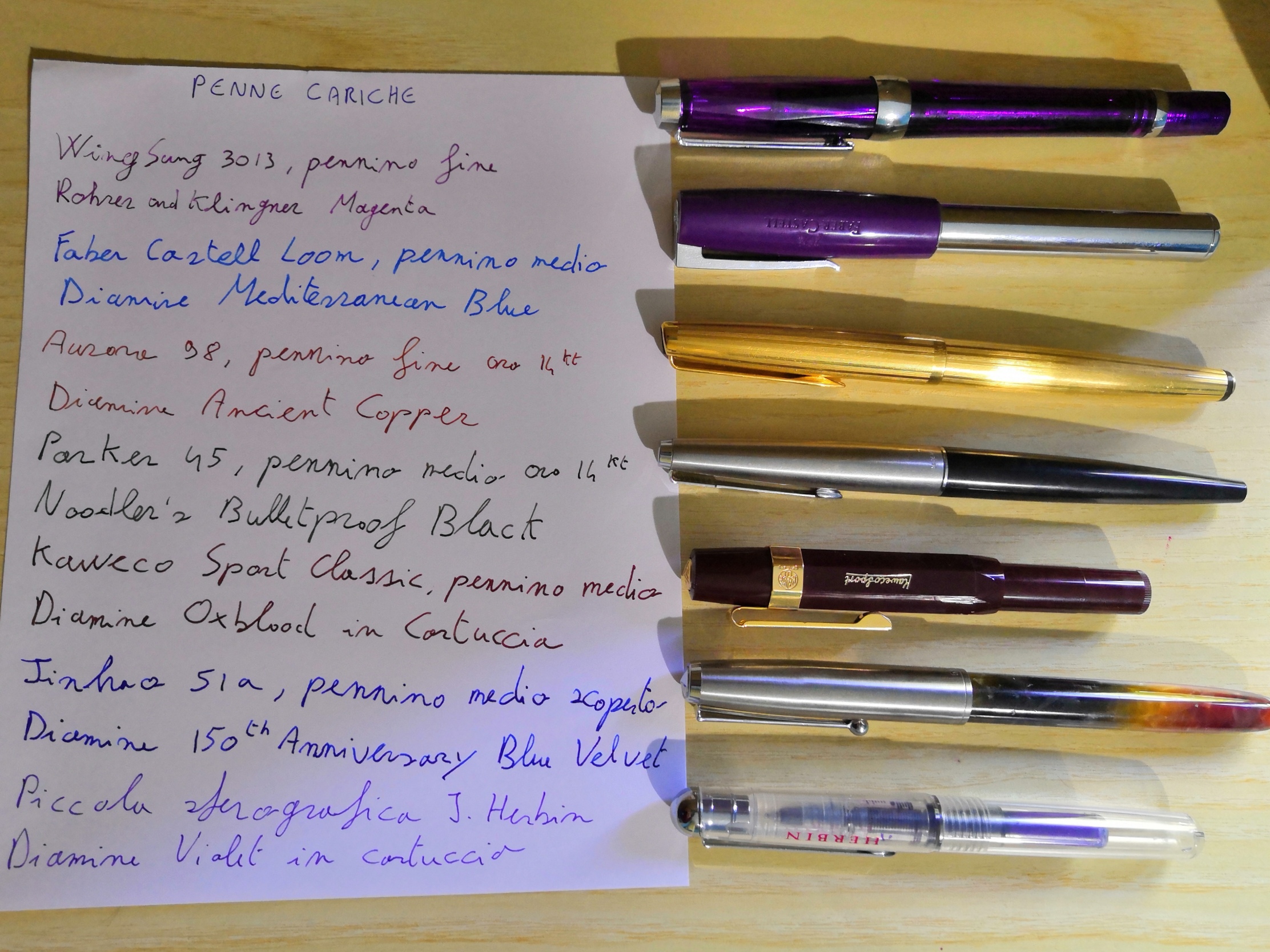 Solitamente ho sei stilografiche cariche contemporaneamente. Quelle attuali sono una Wingsung 3013, fine, caricata con un Rohrer&Klingner Magenta, scrive con un flusso un po' magro, devo provare ad allargare un po' i rebbi che mi paiono troppo stretti.