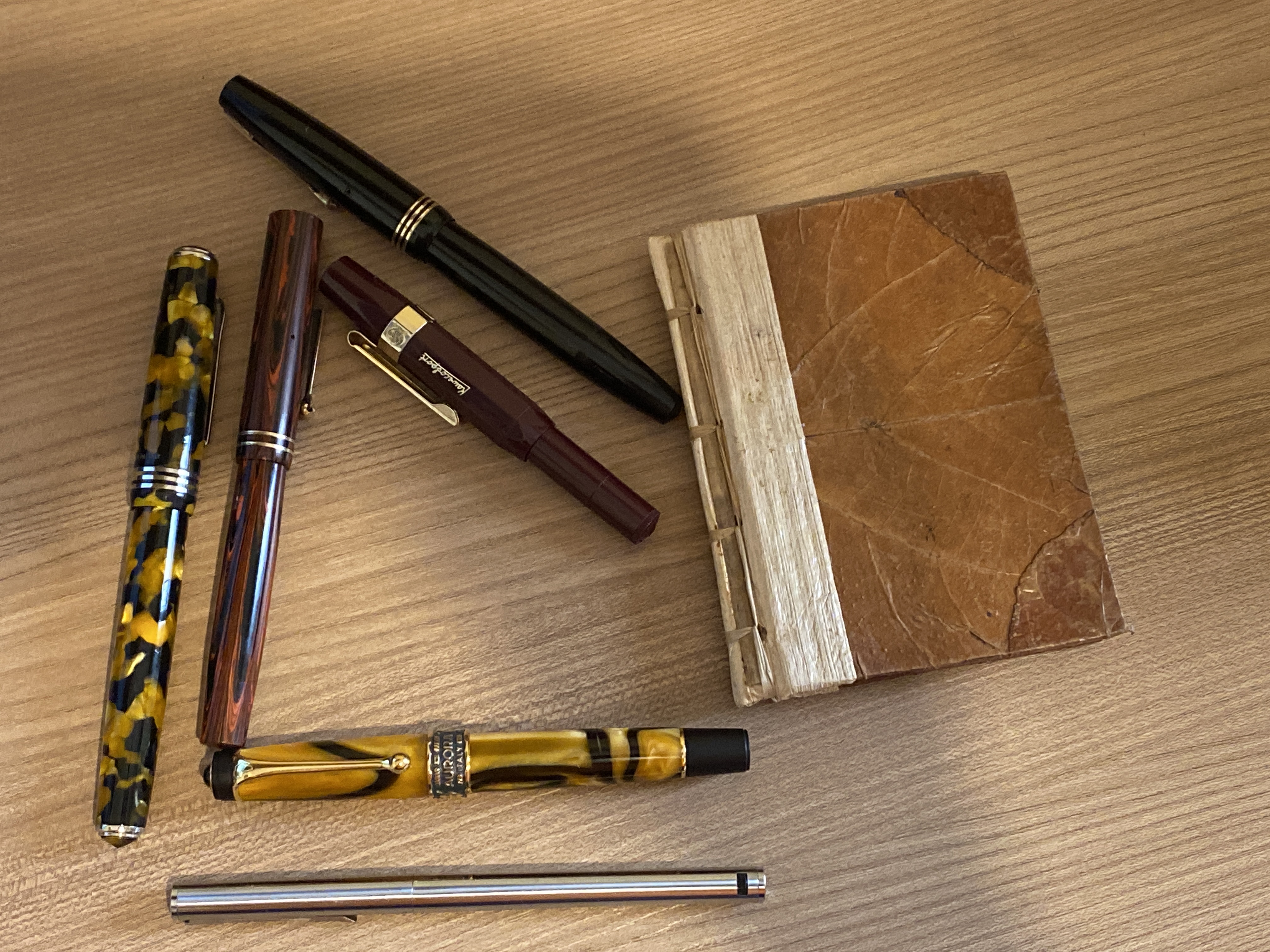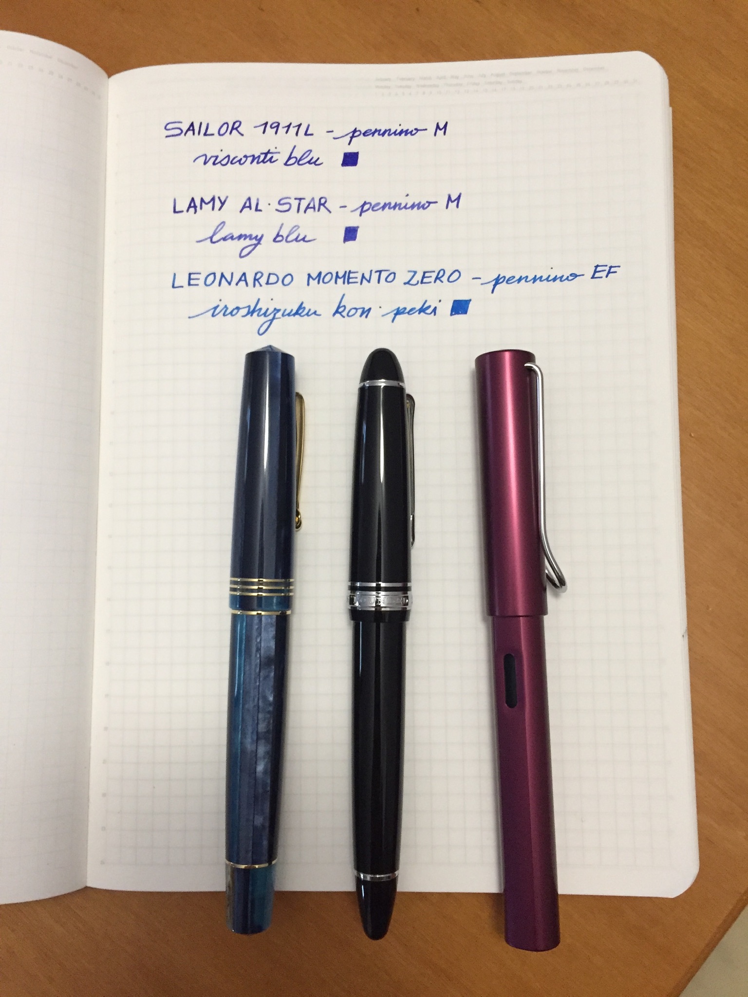 A casa: la nostra ultima 5000 con Pelikan 4001 nero; Waterman Man 200 burgundy con Diamine saddle brown; Aurora 88k con 4001 blu. Per errore mi sono accorto che c'è anche la matita perfetta. Domani metto quelle dello studio