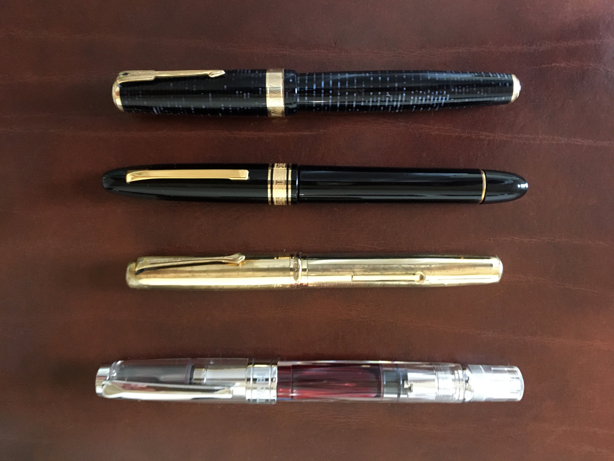 In studio una Montblanc 146 F con R & K Sepia, Aurora Talentum nera EF con Diamine Eclipse, Platinum 3776 Century Bourgogne nib oro 14k F con Waterman Audacious Red, Pelikan M600 old style Nib 18k F con Pilot Iroshizuku syo-ro.