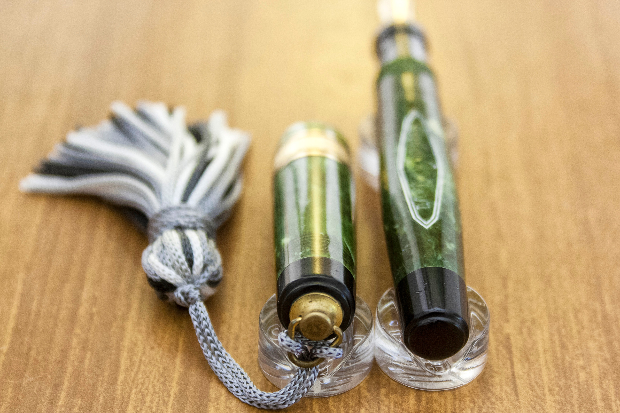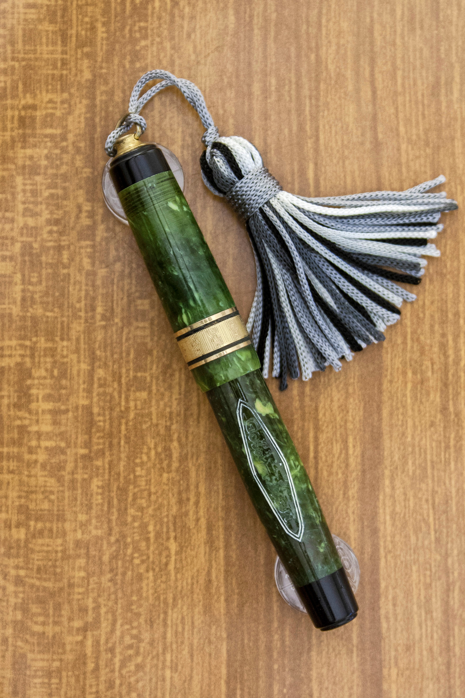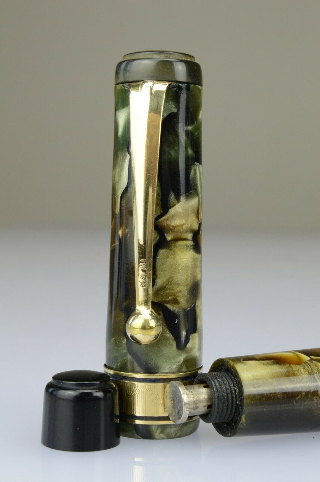 Una piccola e deliziosa stilografica degli anni trenta, prodotta per l'azienda fiorentina Banco Metalli Preziosi Fiani & Ciampi. Caricamento a pulsante di fondo, celluloide screziata verde (leggermente virata).