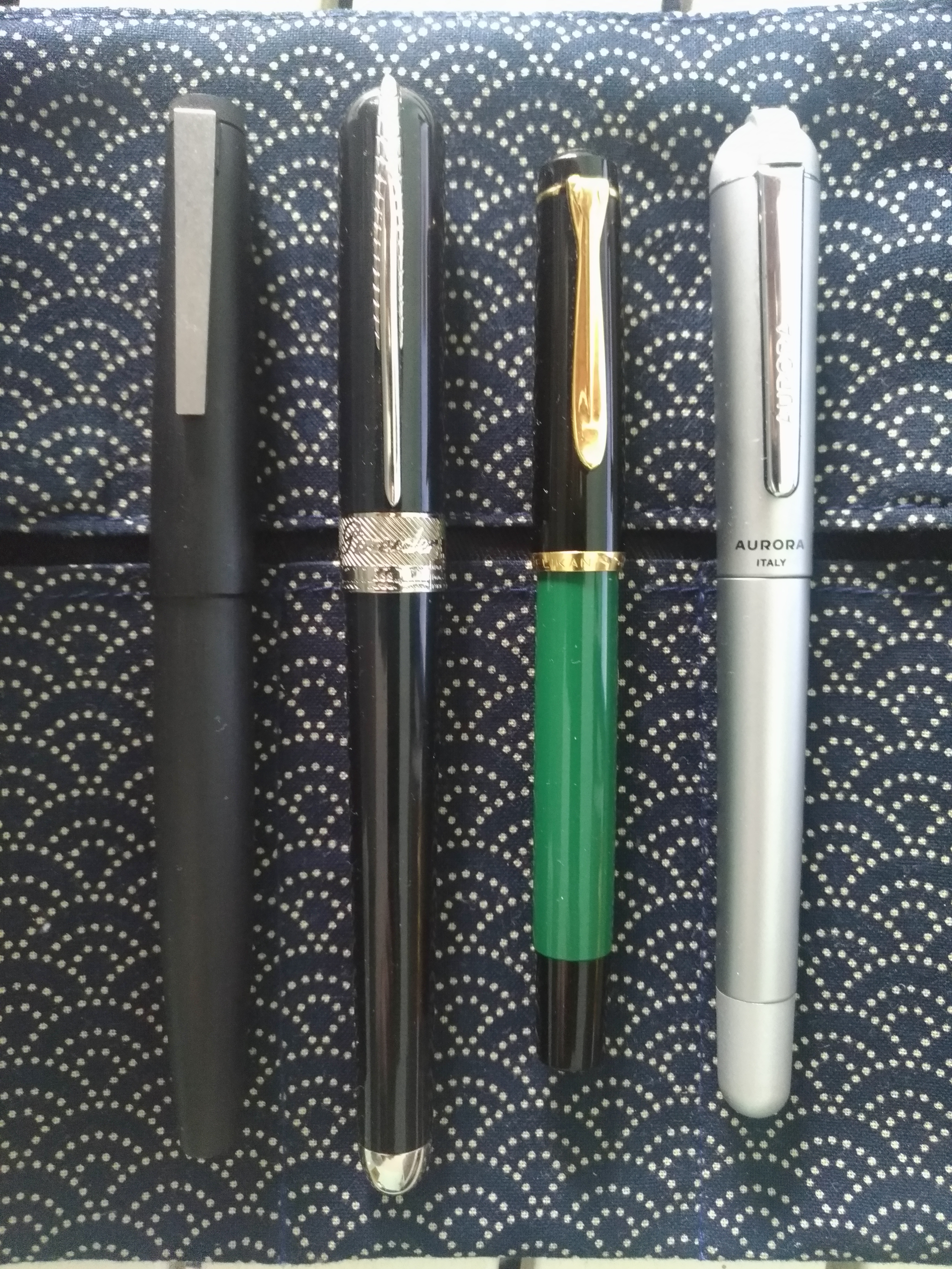 Oggi Delta The Journal con pennino fusion stub, Montblanc 146 Silver Barley con pennino fine, Montblanc 149 Silver Rings con pennino fine e Parker Duofold sempre con pennino fine.