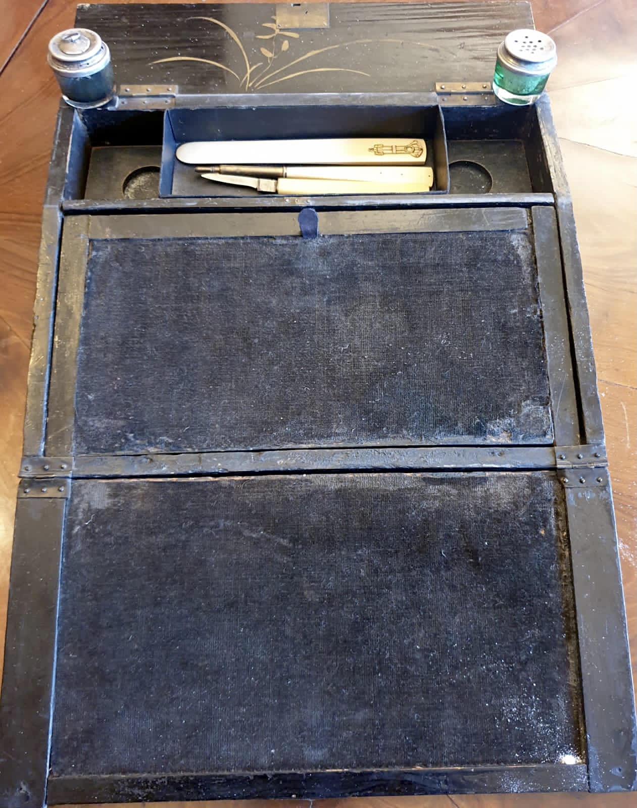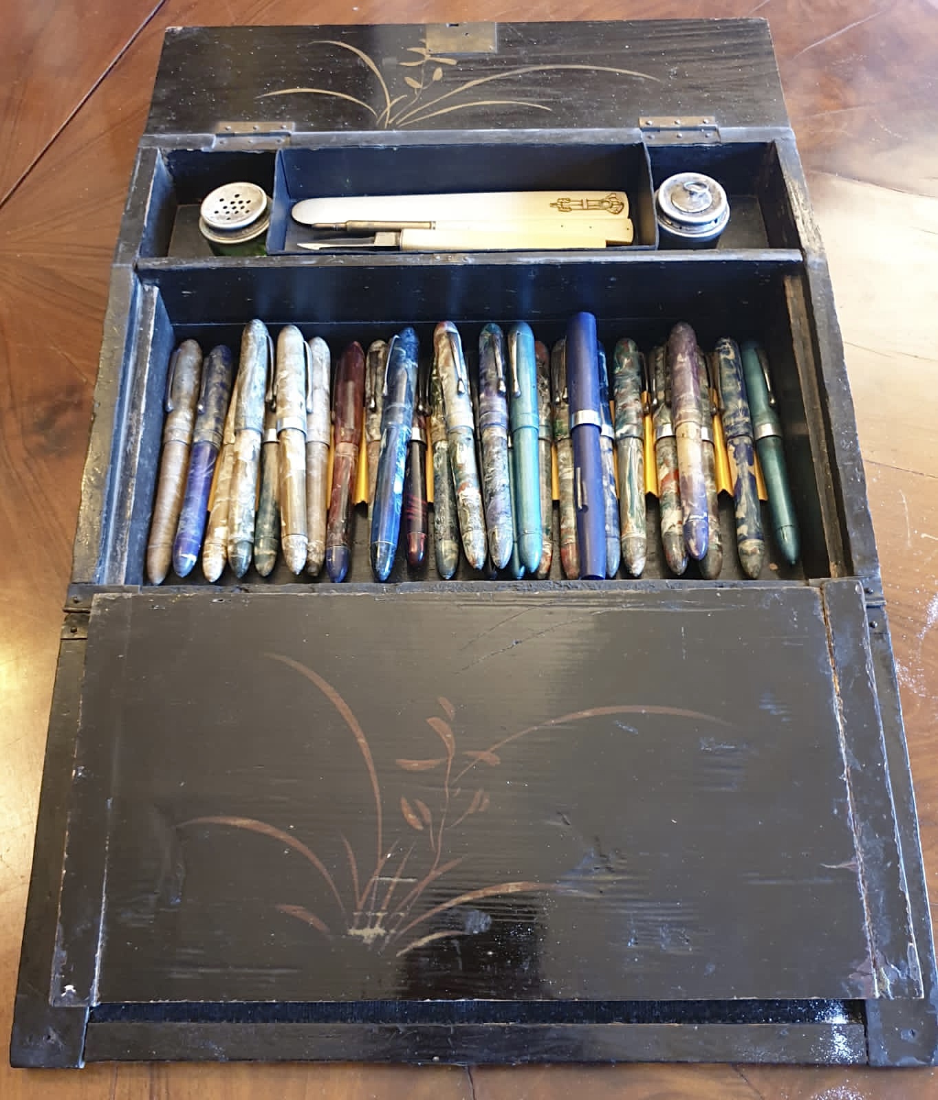 Ottocentesco scrittoio giapponese con tarsie in madreperla, decorazioni dipinte a mano. Completo di calamaio, sandracchiera in vetro (coperchi in argento) e serratura con chiave. Set in avorio. Lo uso altresì come... contenitore delle stilografiche in galalite della "F.lli Rossi" di Ancignano (VI), molto rare per la loro facile degradabilità soprattutto all'umidità.