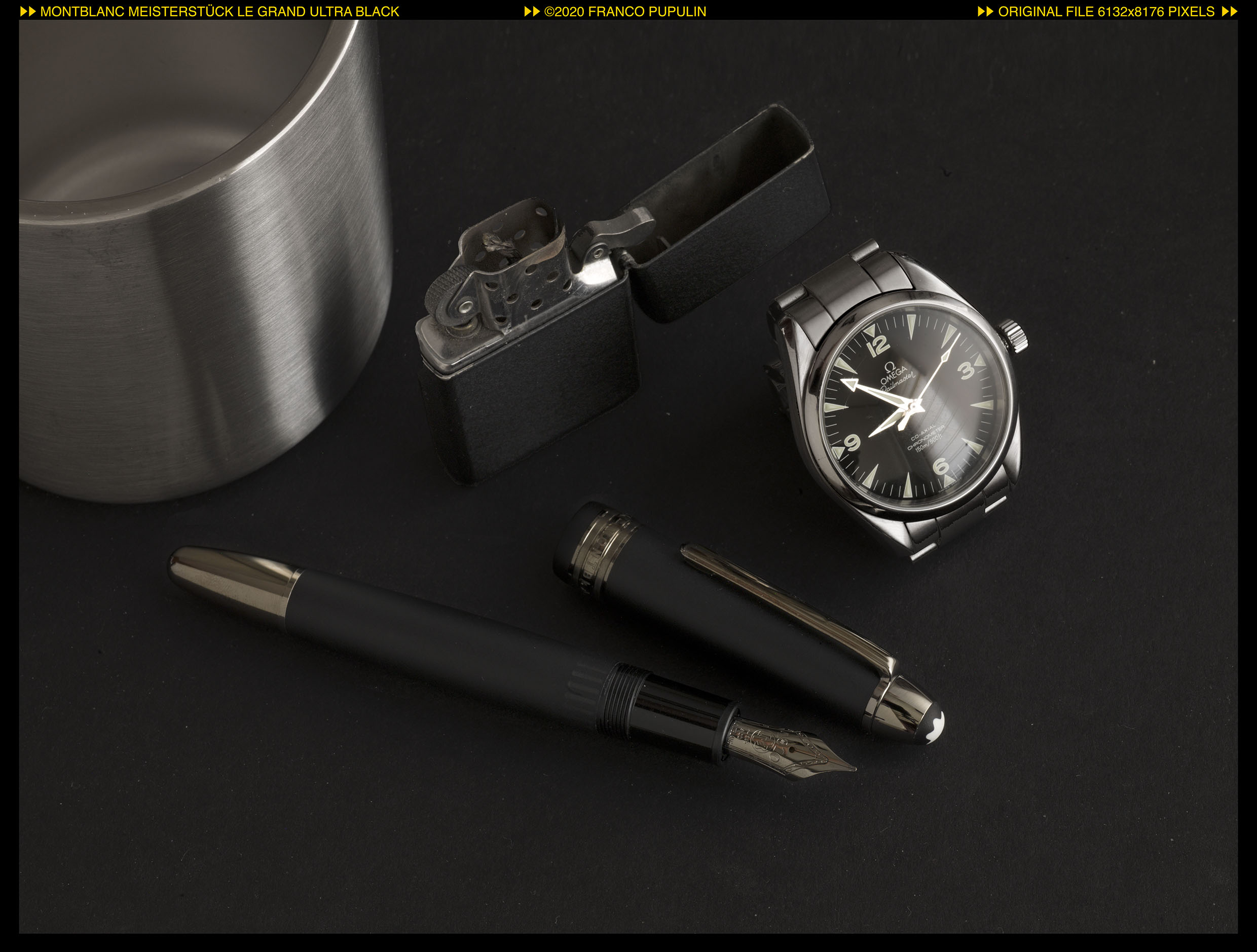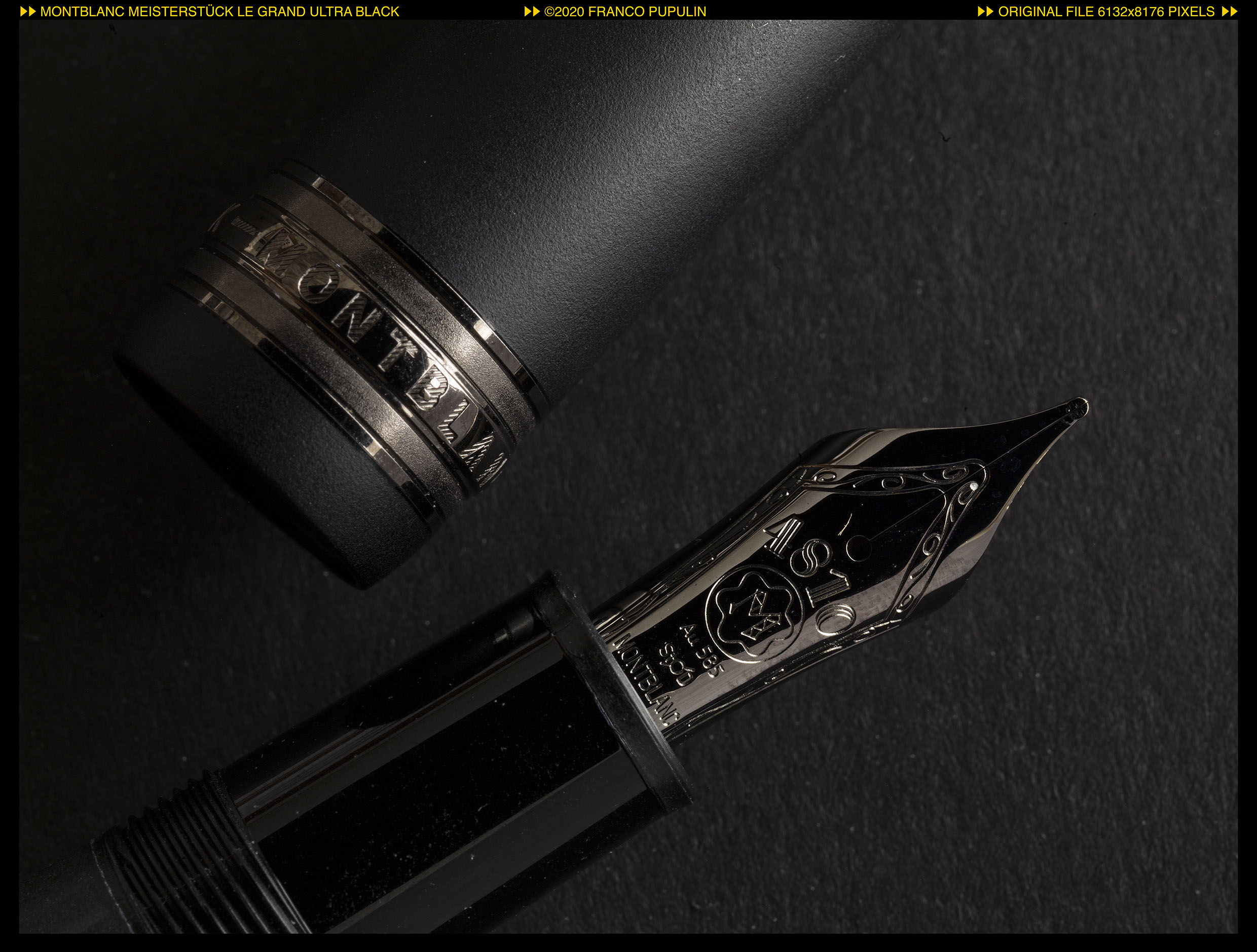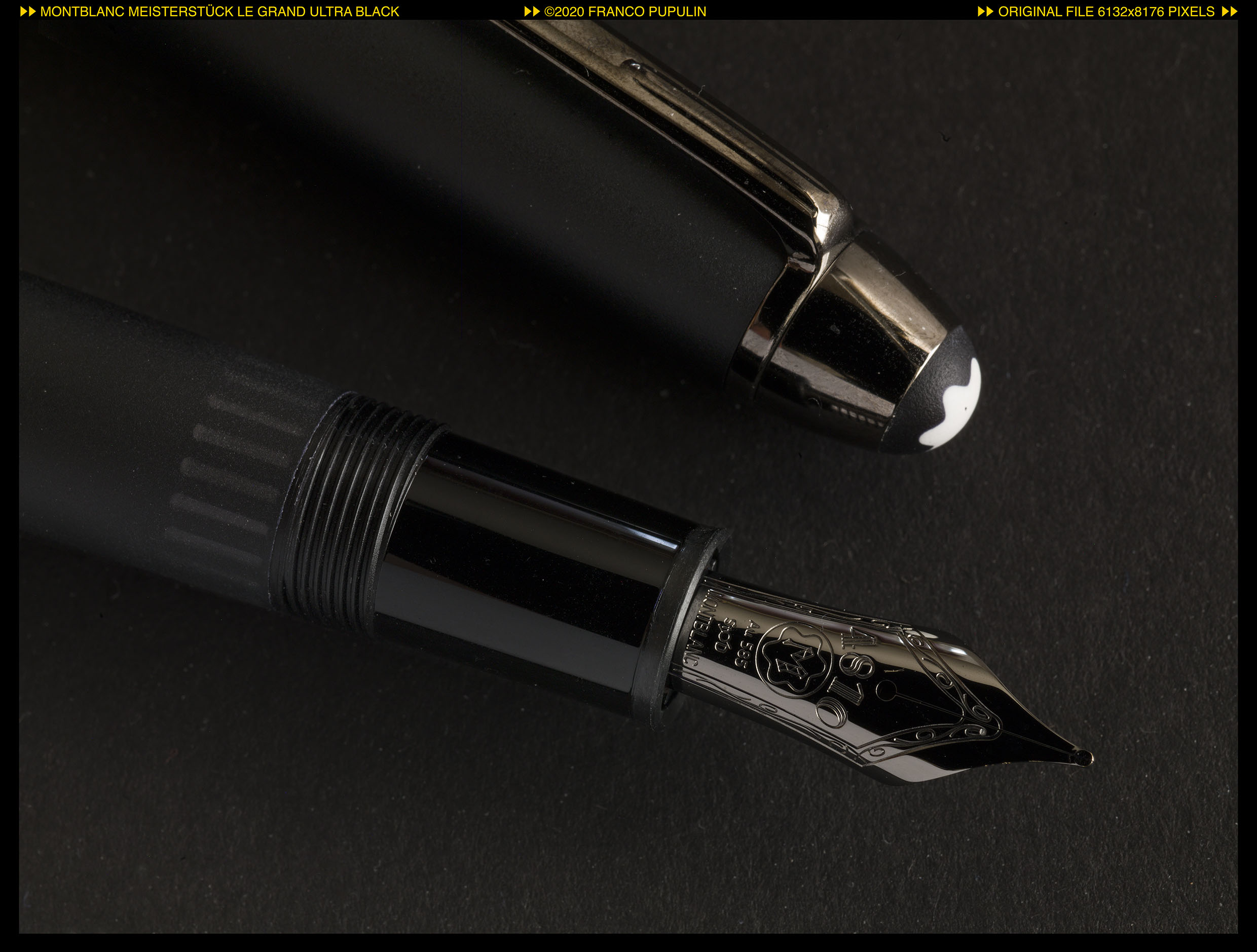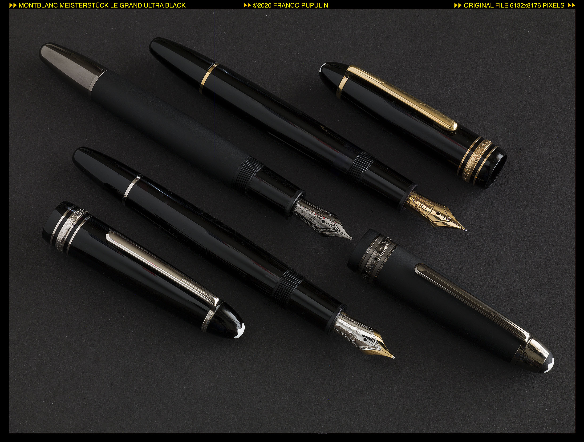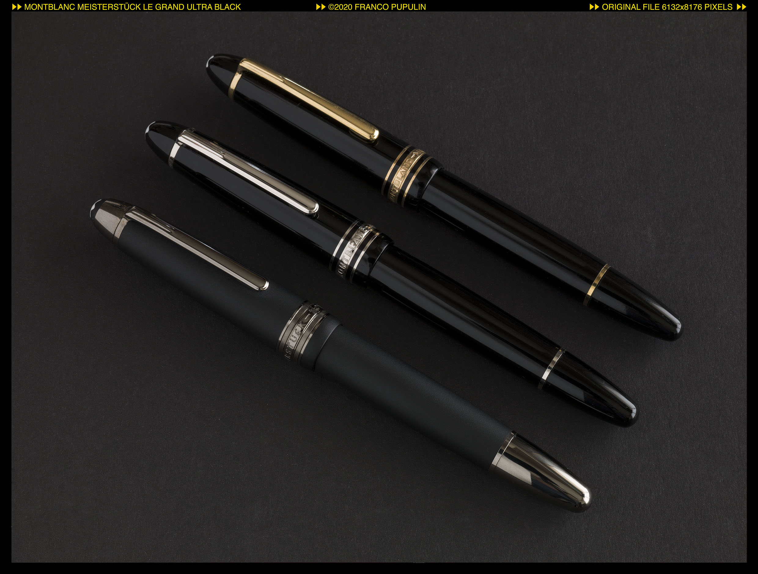 La Montblanc Meisterstück Ultra Black è stata prodotta, in edizione speciale, nel 2016. La serie comprendeva due stilografiche e due rollerball, nelle taglie Le Grand e Classica, e due penne biro nella nuova dimensione Media e nella taglia Classica. Quella che ho ricevuto io è una stilografica Meisterstück Le Grand (le dimensioni sono quelle di una 146 contemporanea). Per Edizione Speciale, Montblanc intende degli strumenti da scrittura la cui produzione non è limitata in numero, ma nel tempo. La Ultra Black, come dicevo, è stata prodotta esclusivamente nel 2016 e, a giudicare dalla rarità di queste penne sul mercato, deve essere stata venduta fulmineamente. Non mi stupisce che sia stato così.