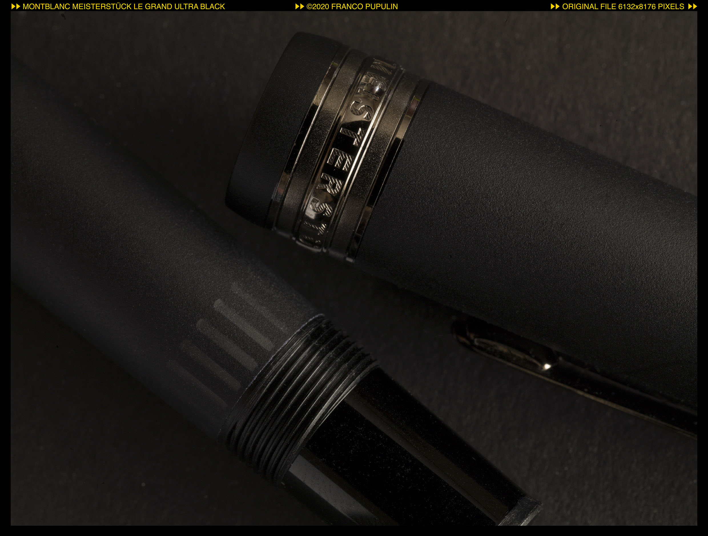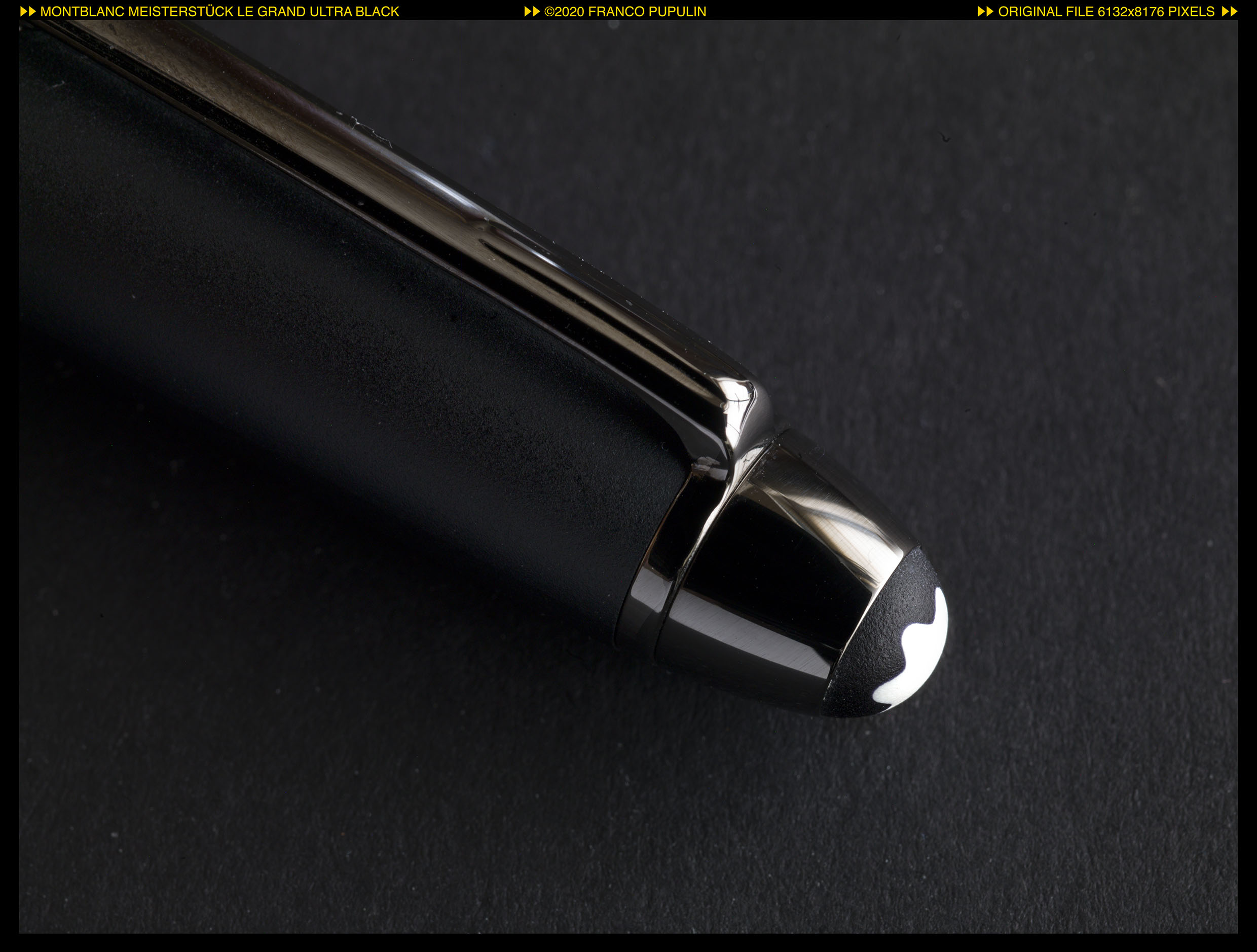 Opaca. La sabbiatura è perfetta. La resina è irriconoscibile come una classica resina “preziosa” di Montblanc. Anche osservata con una lente d’ingrandimento piuttosto potente (10x), la finitura è perfettamente uniforme, e l’effetto opaco impressionante. Il corpo e il cappuccio della Ultra Black non hanno alcun tipo di riflesso.