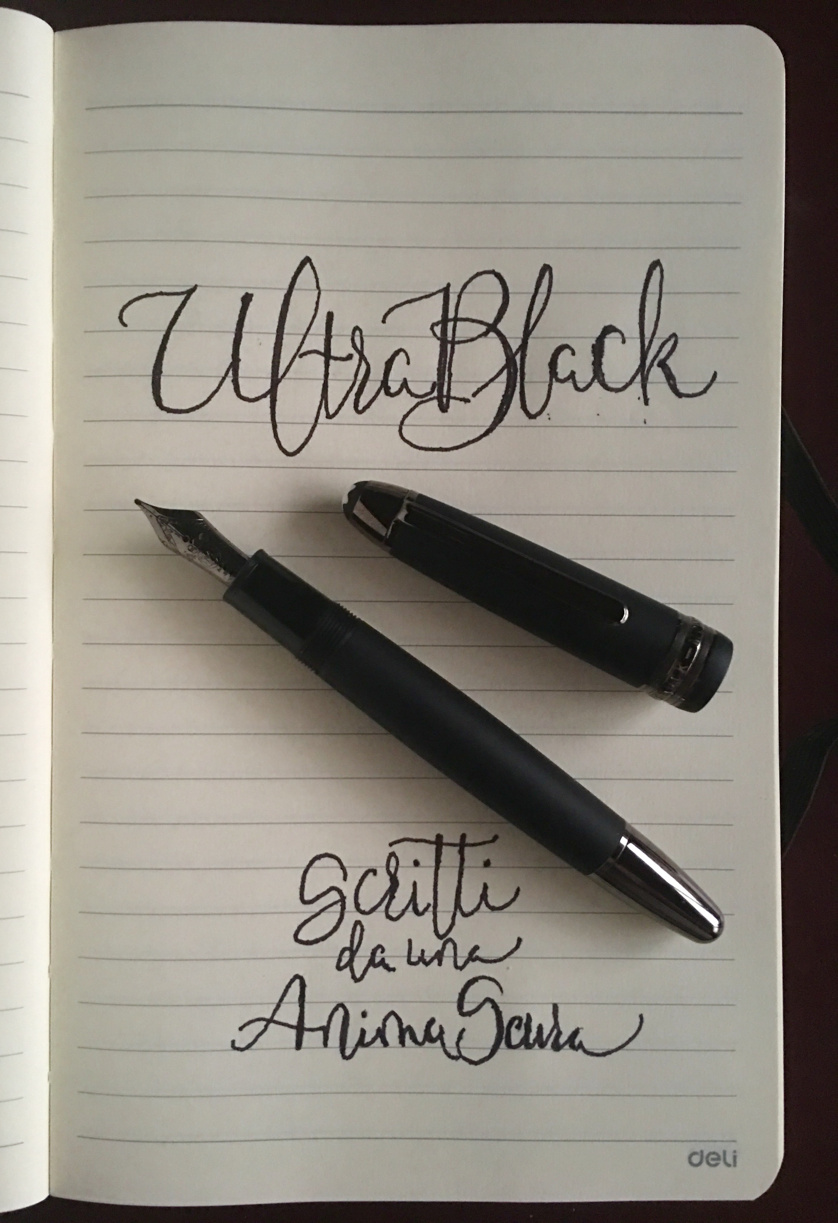 Scrittura. La penna è più pesante di una 146, in un modo che si può notare sin dalla prima presa. Il cappuccio ha un finale parzialmente metallico, e questo contribuisce al peso maggiore, ma il cappuccio è ininfluente alla scrittura per chi, come me, non lo calza per scrivere. La penna rimane però più pesante anche quando ci si limita a sostenerne il corpo: il fondello di metallo, anziché in resina, si fa sentire. Io prediligo le penne con un certo peso (vedi le mie OMAS Grand Paragon e le Montegrappa Extra), ma la Ultra Black è diversa. Nelle mie altre penne pesanti, l’aumento di peso è dato dalla sezione metallica, cosicché il peso aggiuntivo grava sulla punta. Nella Ultra Black il fondello metallico sposta invece il punto il equilibrio della penna all’indietro, rilevandolo dal pennino. La penna è, allo stesso tempo, più pesante e più leggera. Io l’ho sentita, piacevolmente, molto leggera sul pennino, che appena sfiora la carta. È una sensazione unica. Dal punto di vista del piacere della scrittura, questo dipenderà ovviamente dai gusti personali.