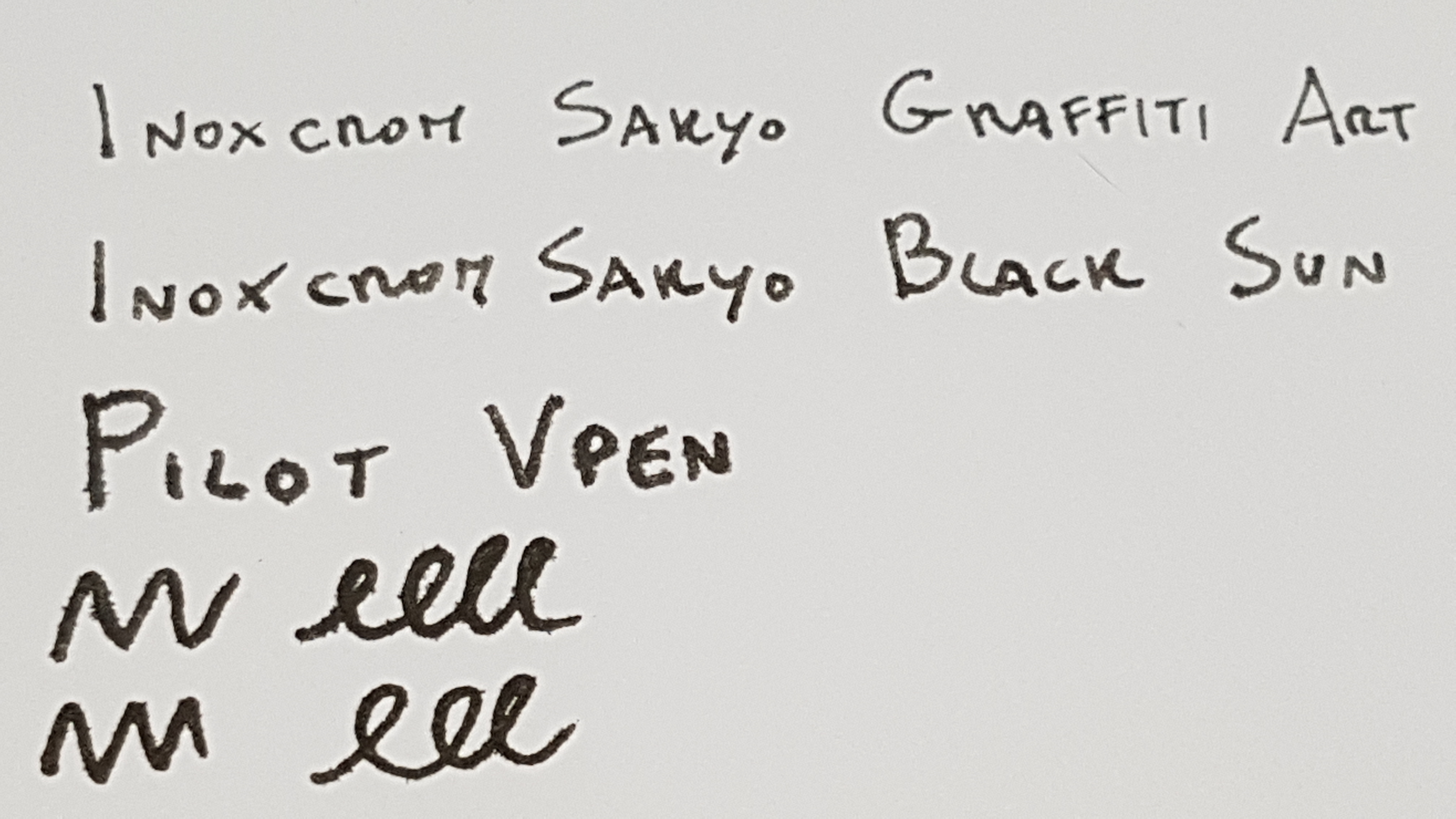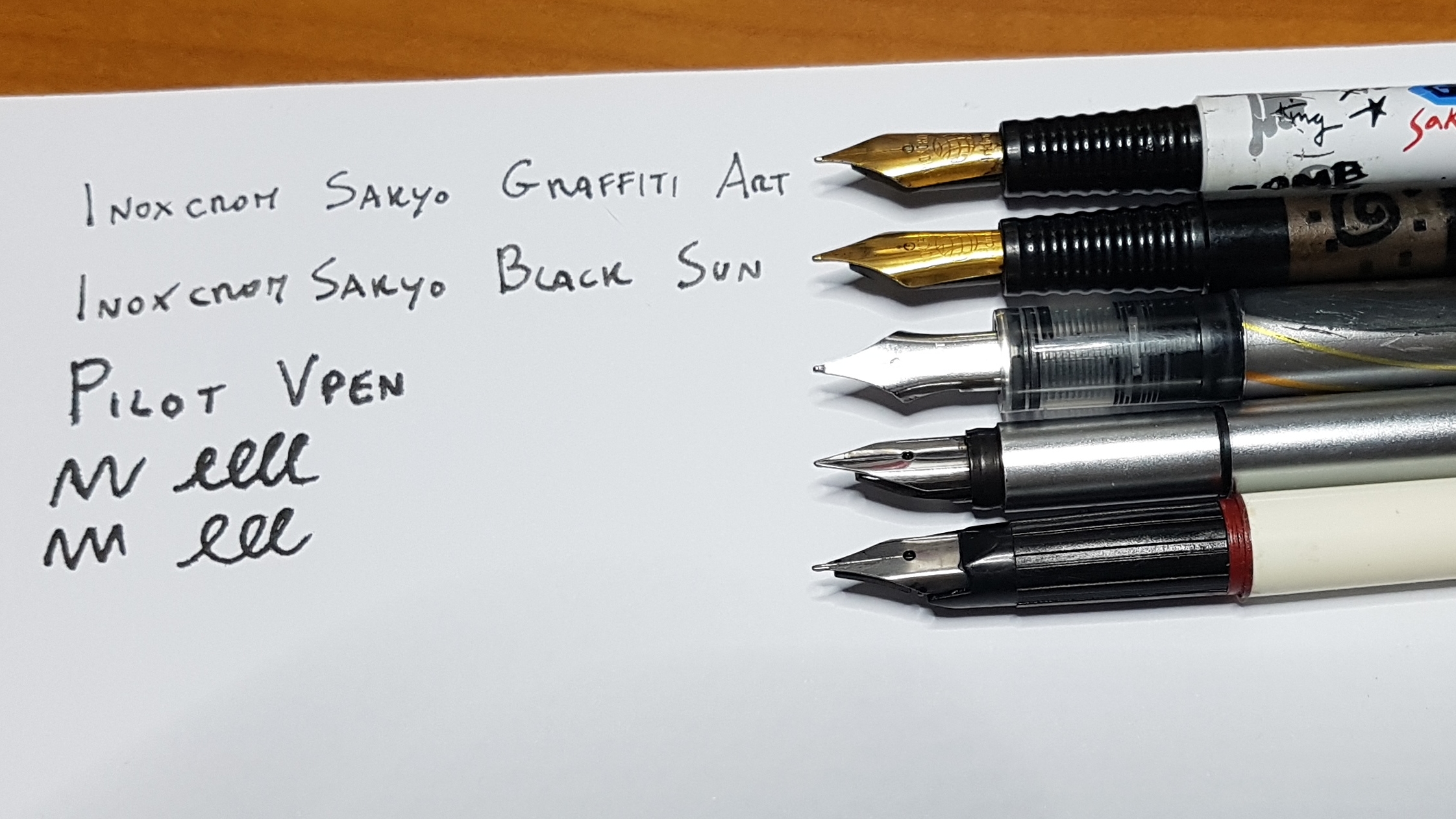 Nell'esempio solo la prima penna è caricata con l'inchiostro, le altre sono intinte. Le prime due scrivono allo stesso modo (i pennini sembrano misure diverse) e si vede che invece di un nero uniforme risulta grigio scuro. Si notano diversi spazi chiari in cui la stesura non è uniforme. So che la carta non è adatta e che è normale per una stilografica non avere un tratto uniforme, ma fino questo punto?