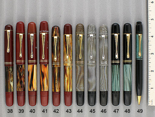 Spero, comunque, che tu non abbia l'ardire di confrontare lo straordinario secondo modello in assoluto della Pelikan (le prime quattro penne da sinistra qui sotto, anno 1935, il primo fu la 100 nel 1929)