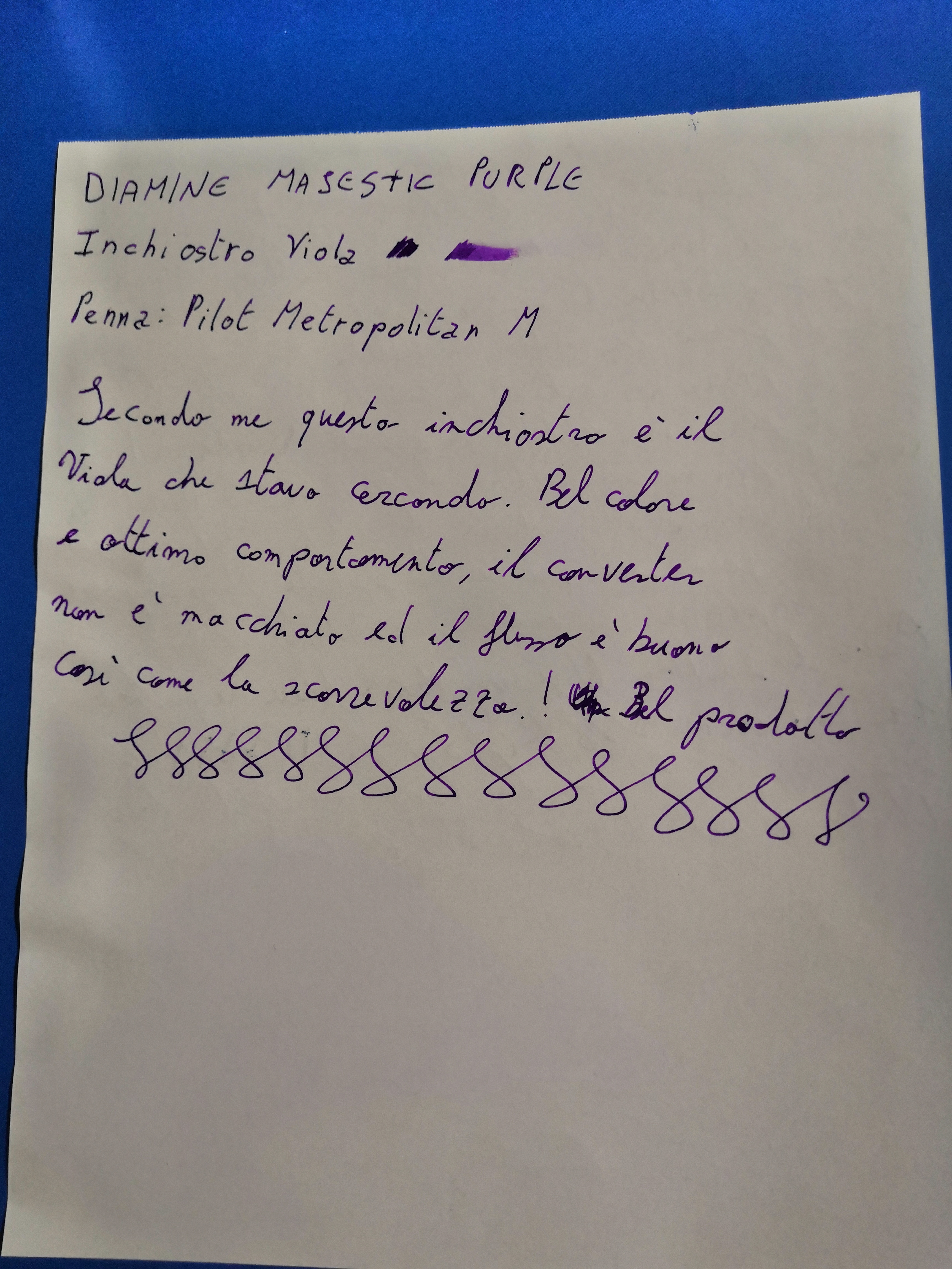 Buona serata e buon 2021 in arrivo a tutti. Cercando e ricercando un viola che mi aggradi, che sia Viola non tendente al blu, ma piuttosto verso il fucsia/magenta pur rimanendo viola, ho trovato lui. Il Diamine Majestic Purple.