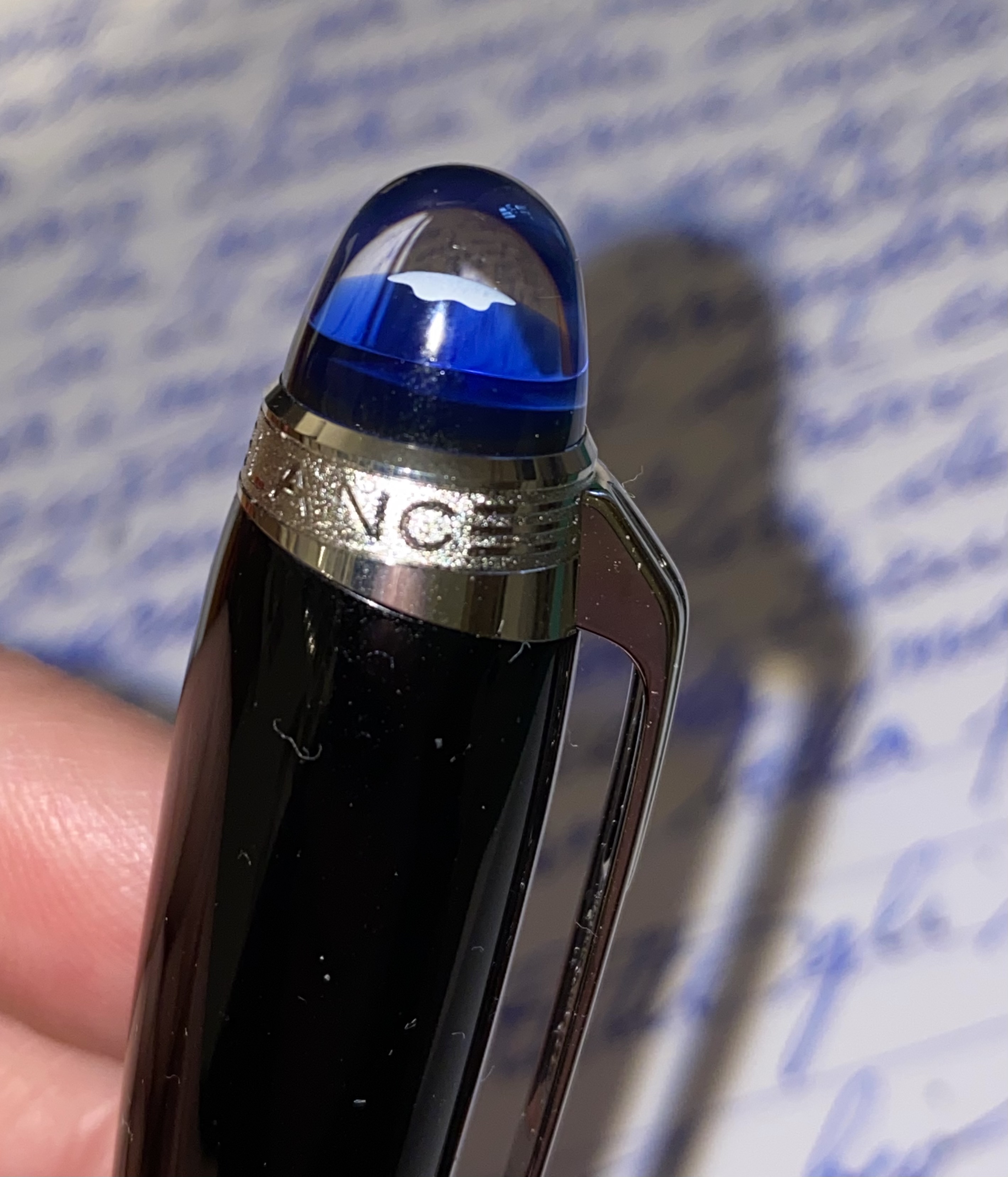 La prima carica è stata di Montblanc nero nella cartuccia in dotazione ma non è scoccata la scintilla. La seconda carica è stata di Robert Oster Graphite per tentare di snellirne il tratto e andava anche bene però il colore dell’inchiostro faceva a pugni con la penna secondo me. La terza carica sembra quella giusta... il Private Reserve Electric Blue si intona perfettamente alla cupoletta azzurra alla sommità del cappuccio. :wave: