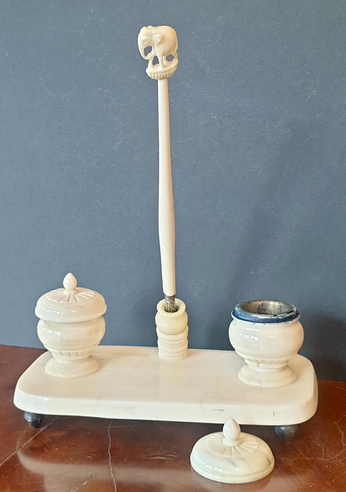 Set da scrivania in osso di bufalo d'acqua, composto da un alloggiamento per la penna e due calamai, completi ciascuno di bicchierino in ottone fissato all’osso con un perno e chiusi da coperchi incisi con motivo a spicchi.