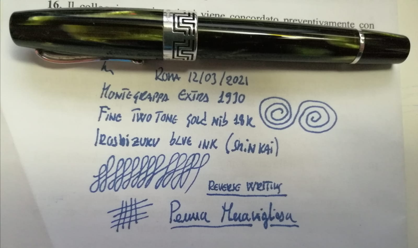 Da allora sono arrivate varie altre Montegrappa (una Classica Carbone, una Miya Turchese, due Emblema - Grigioperla e Blu Mediterraneo, una Extra Rossa, due Extra 1930 in Tartaruga e una Extra Otto Linne Brilanti), con ogni gradazione di pennino: extra-fine, fine, medio, largo e un altro stub. Per mia fortuna, tutte scrivono benissimo e con mia grande soddisfazione. Di fatto, da tempo accarezzo l'idea di una Extra 1930 in celluloide Bianco e Nero (della quale si parla poco ma che trovo raffinatissima), ma il prezzo mi ha sinora trattenuto dal dare il passo.