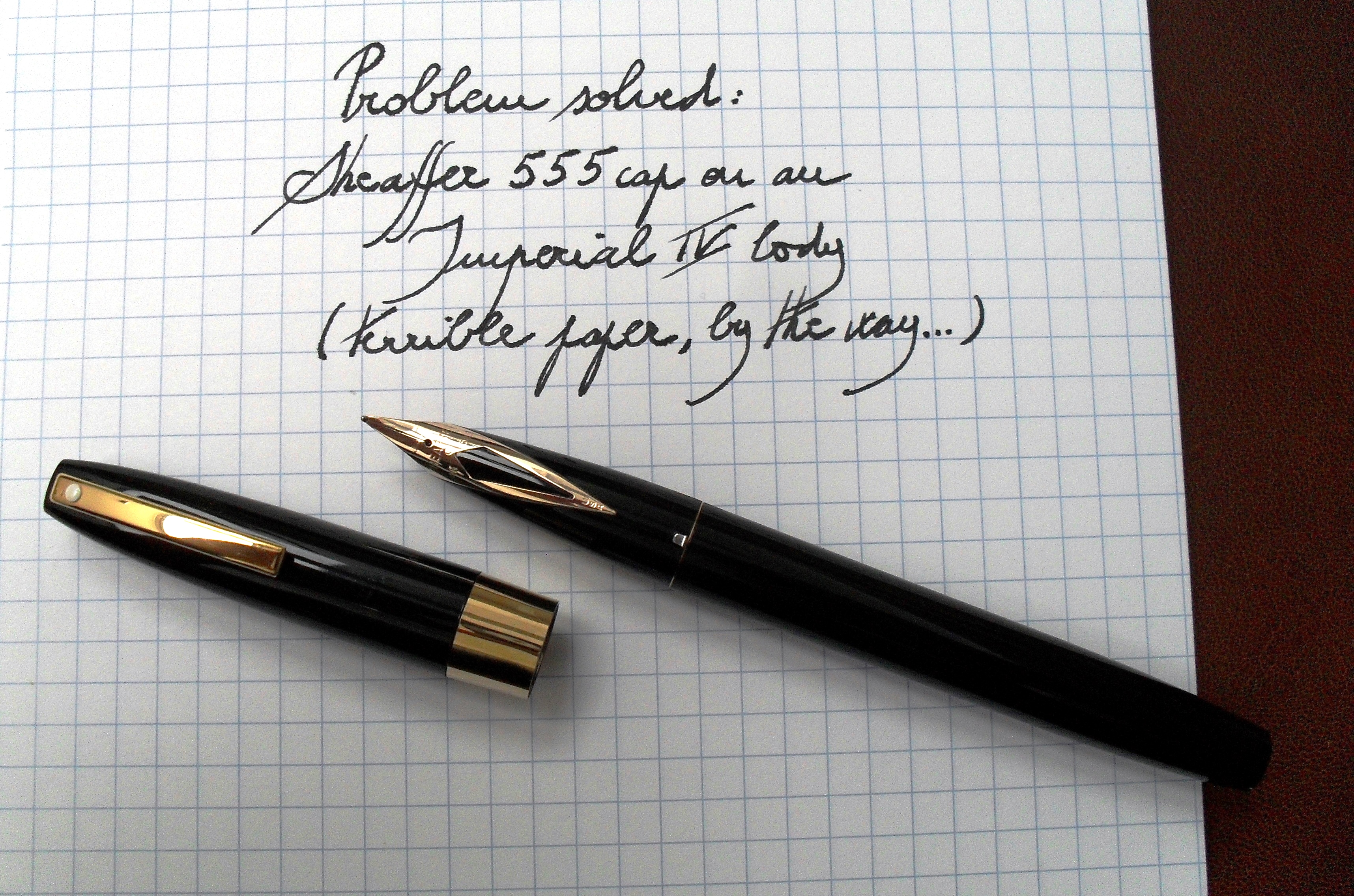 Ultima puntata, per una felice conclusione: curiosando fra gli esemplari di cui dispongo, ho trovato un cappuccio di Imperial IV, che naturalmente s'inserisce benissimo sul fusto di questa stilografica: ecco dunque a voi il risultato d'una felice riunione!
