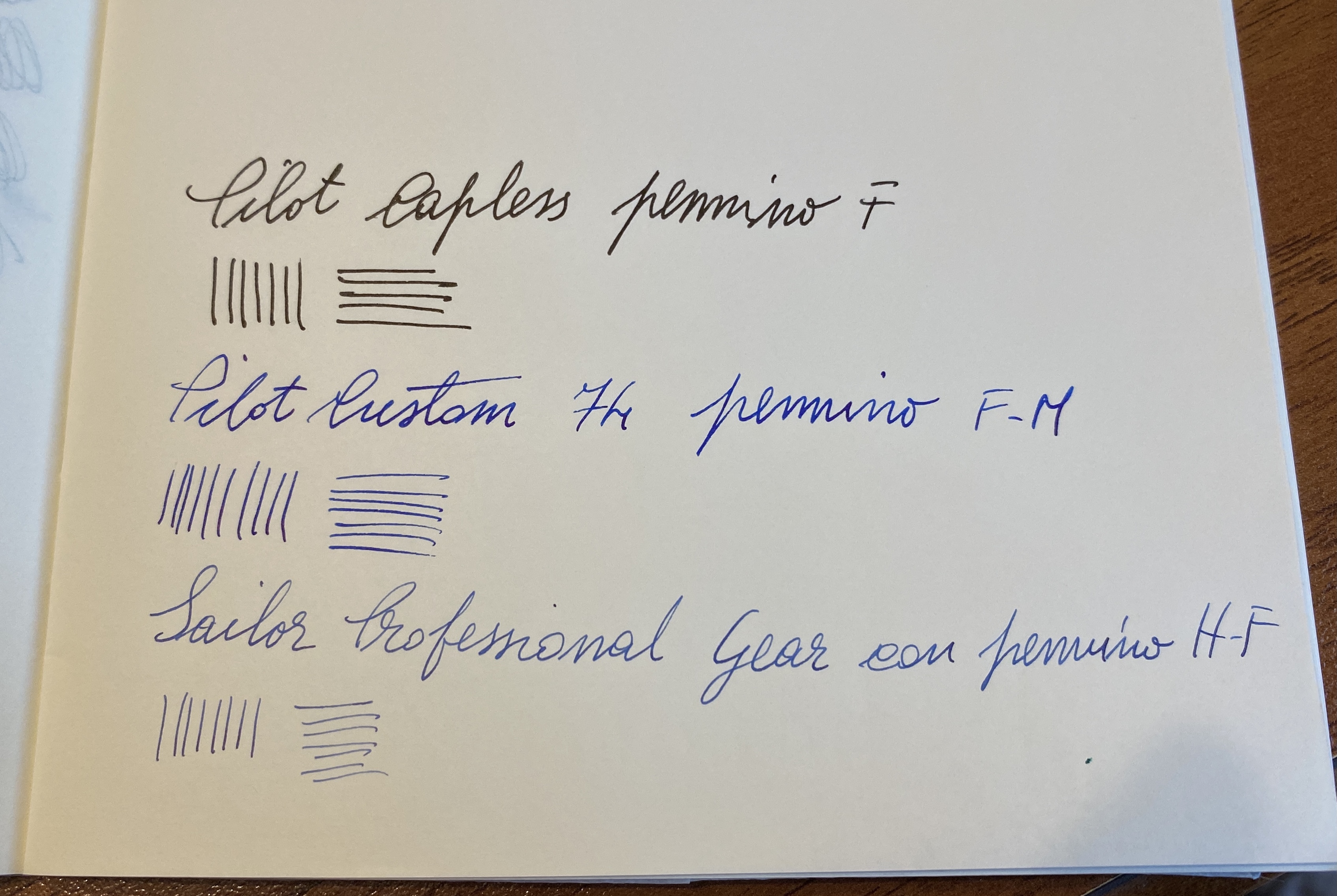 Ciao, ho solo uno dei pennini che citi, il Sailor 21k, poi ho la Pilot custom 74 però con pennino F-M e non c’è assolutamente paragone. Il sailor è molto più sottile. Di F Pilot ho solo la Capless, il pennino è totalmente diverso ma per sottigliezza vince sempre il Sailor a mani basse.