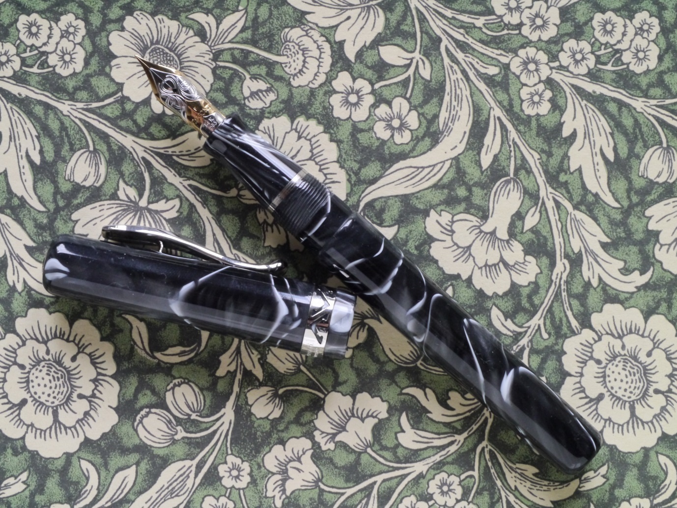 E' una penna abbastanza grande, simile ad un Pelikan M800, ma anche più lunga, la forma è una delle più ergonomiche che mi siano mai capitate, e ha la filettatura sul fusto incredibilmente smussata, è quasi impossibile sentirla anche mettendoci le dita sopra. E' una penna a converter.