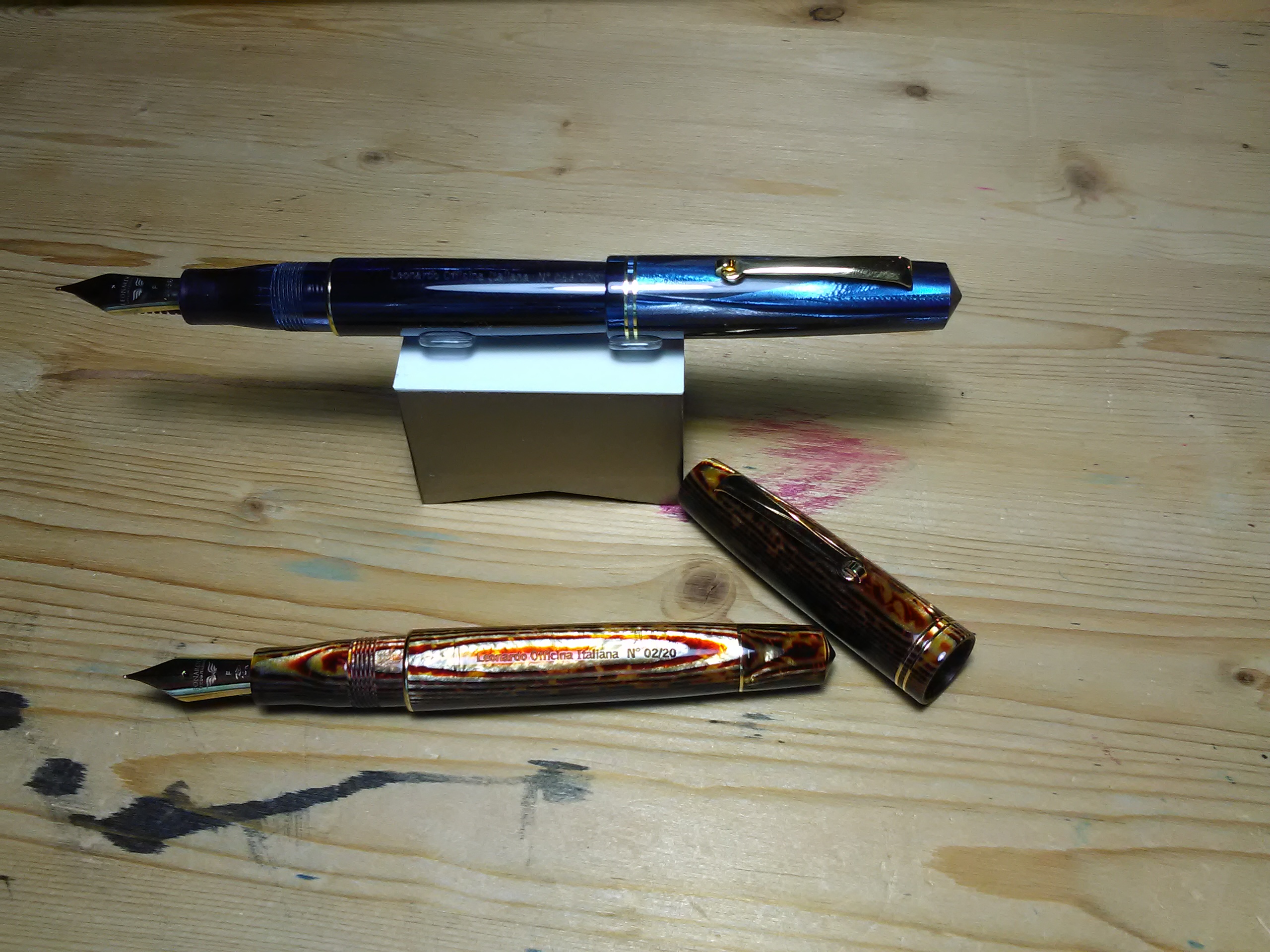 le ho da diversi anni e i pennini sono Bock, quello della Arco mi ha fatto tribolare un po' all'inizio ma poi tutto si è sistemato con la pazienza. I pennini sono gemelli ma diversi nel comportamento, un pochino "frenato" quello della Arco, più abbondante e "scivoloso" quello della Abisso. Sono molto sensibili al tipo di inchiostro. L'unico "difetto" di queste penne è la scarsa autonomia e non avendo finestre di controllo rimani a secco nel momento meno opportuno. Questo fatto è stata la scusa per prendere la Furore che è più capiente. Ho semplicemente raddoppiato le boccette, una a casa e una in ufficio :D . Sono le penne che ho tenuto sempre cariche e anche se qualche volta cambio l'inchiostro non le ho mai lavate, qualche parola di colore misto e poi tutto si aggiusta. Scusatemi per le foto ma non sono attrezzato, preferisco spenderli per le penne.