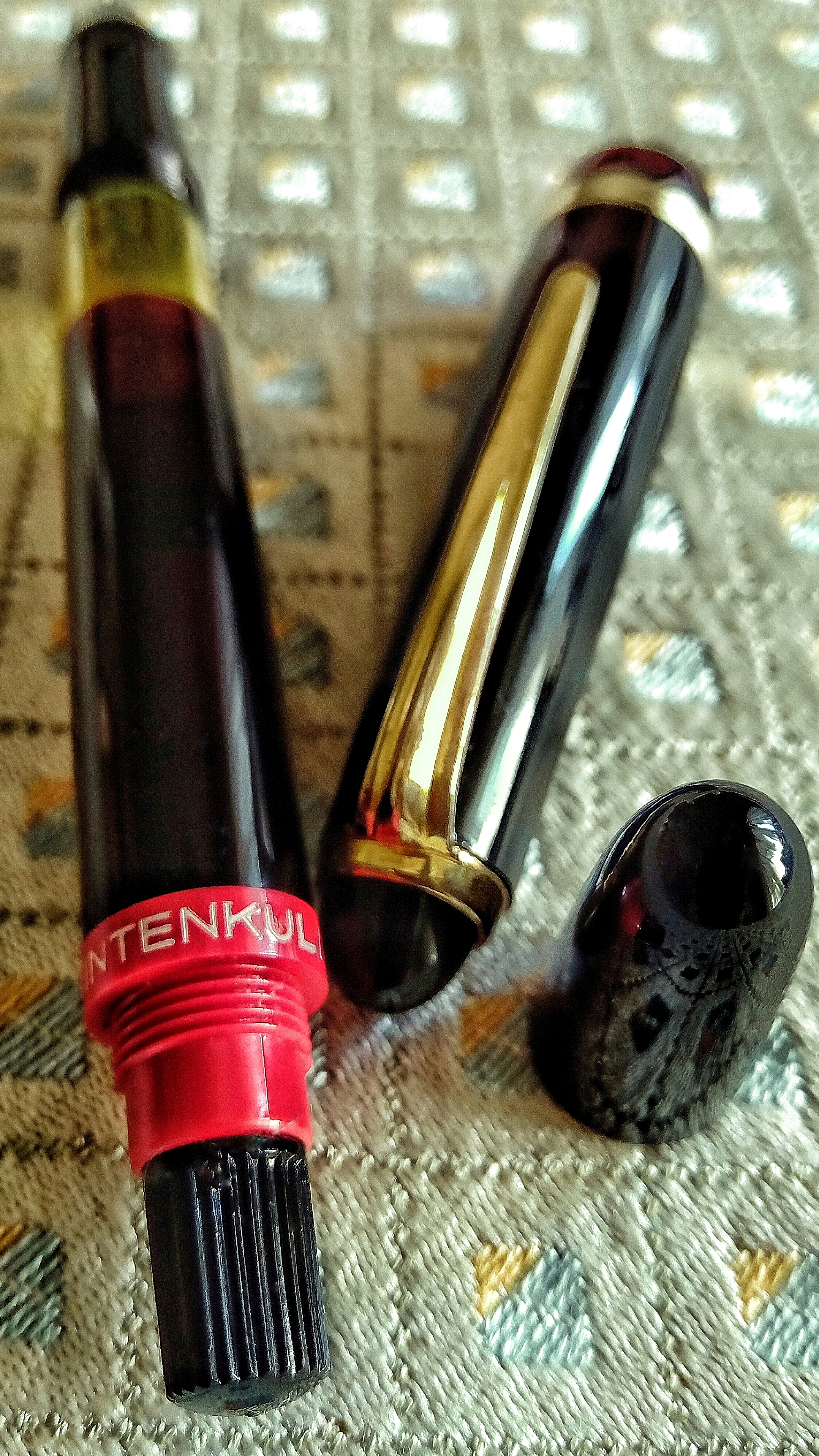 An interesting detail was that although the cap and pump cover were made of black celluloid, the barrel was made of transparent celluloid, staining the surface with black where you did not want to have the ink window (be careful with polishing too much as it will lose dyeing ...!!).