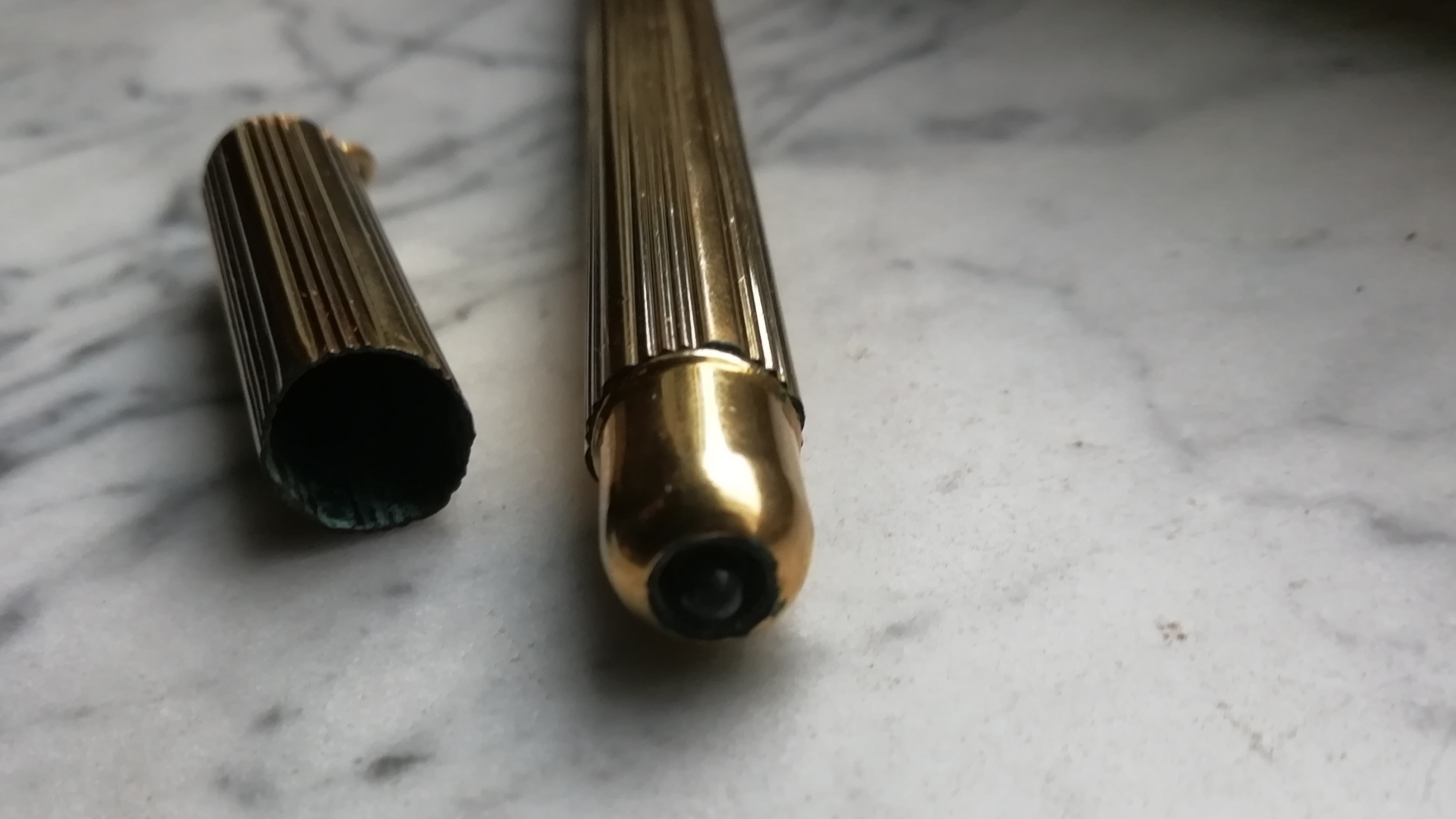 È un contagocce in combo con un portamine telescopico, laminato, probabilmente placcato oro, senza alcuna traccia di sorta di marchi o punzoni.