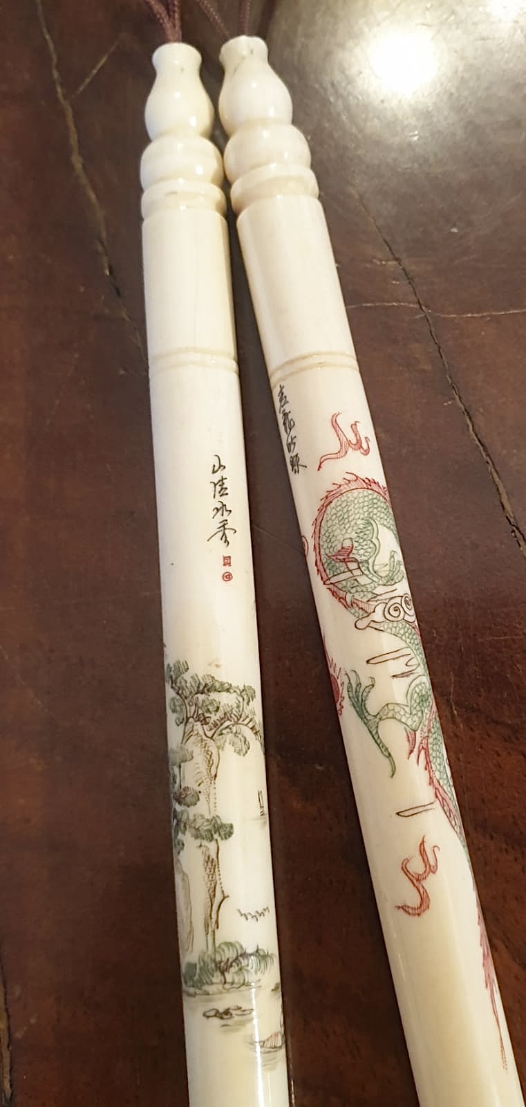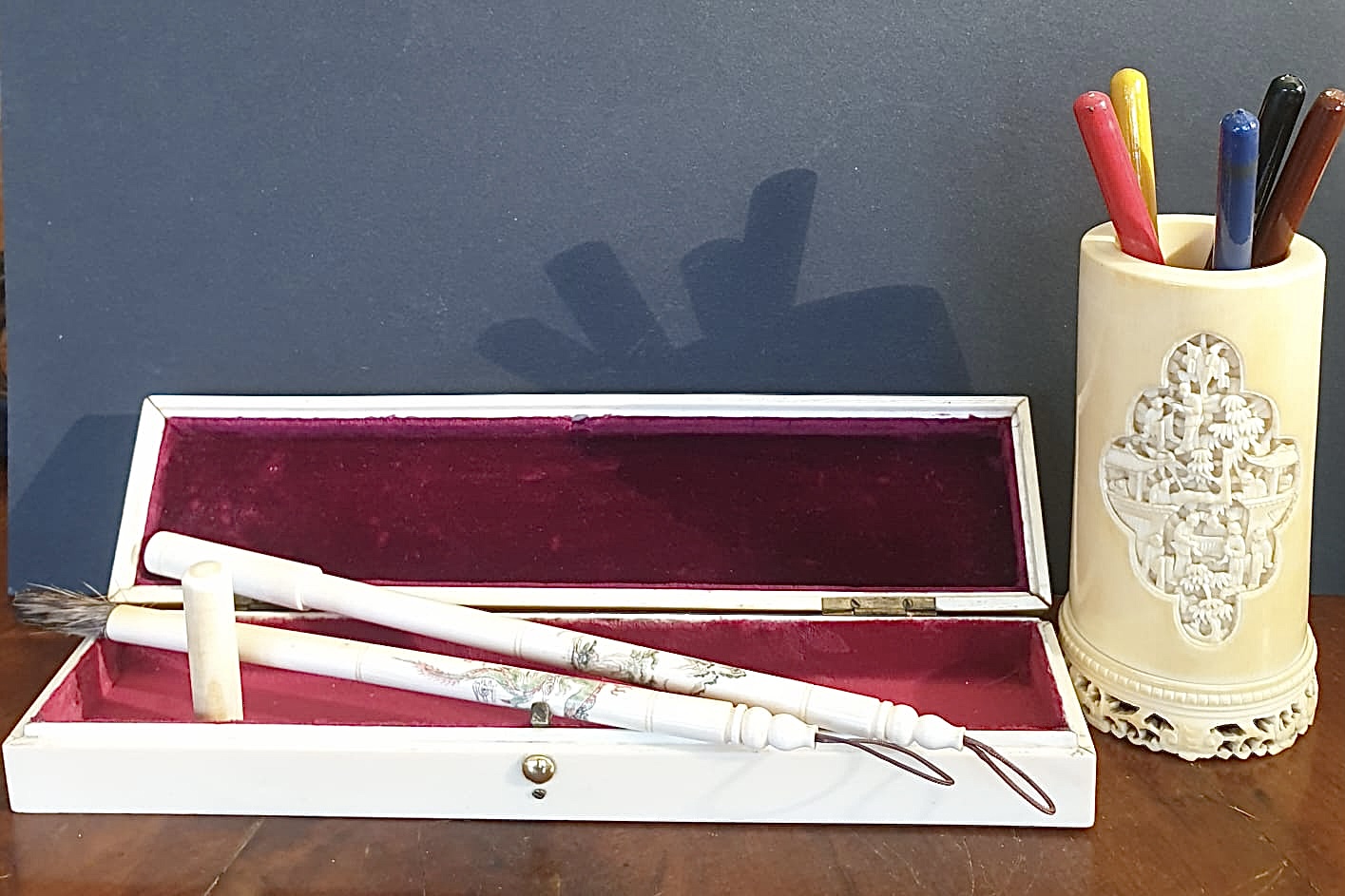 Due bei contenitori (con notevoli bassorilievi) in avorio, da scrivania con 2 pennelli incisi e dipinti. Firmati.