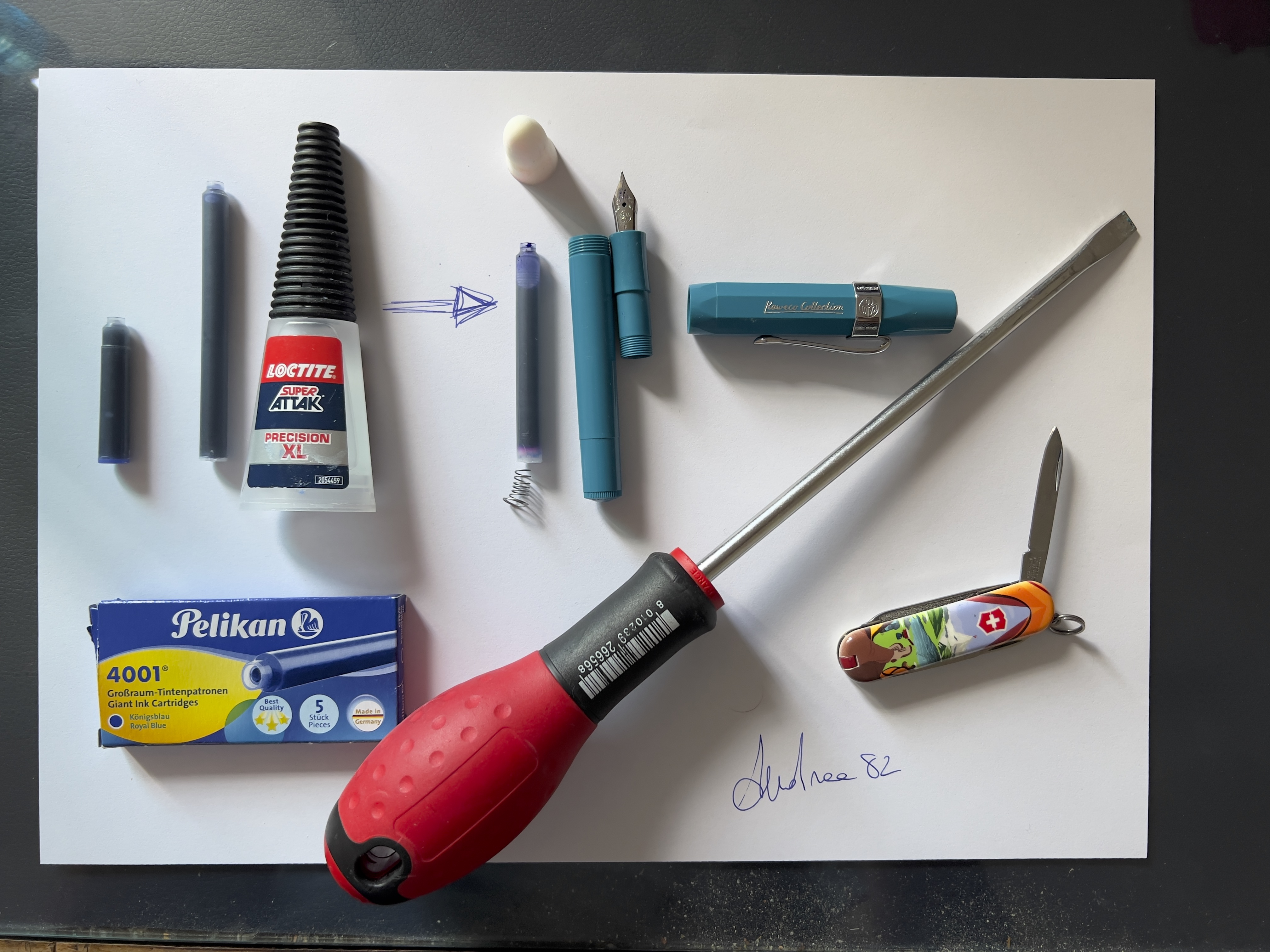 Uso con grande soddisfazione una nuovissima Kaweco Sport LE color Cyan (che consiglio a tutti, è un colore splendido!). Non volevo arrendermi alla solita cartuccia standard. Così, conscio di essere stato da sempre chiamato MacGyver, mi sono messo all'opera e ho creato una cartuccia a tenuta stagna che accoglie circa il doppio dell'inchiostro di una cartuccia standard.