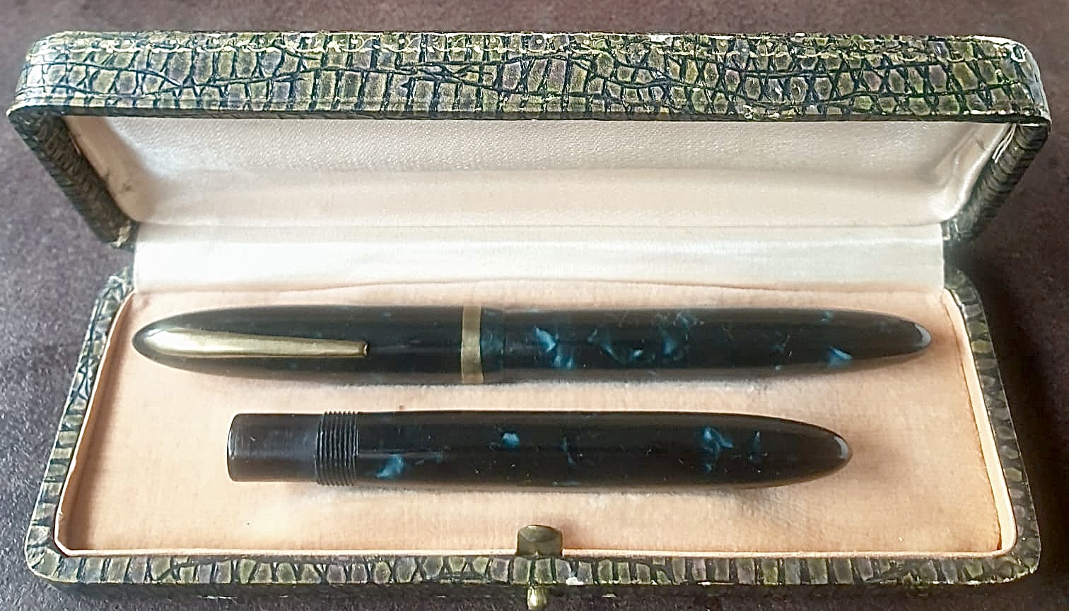 Raro set ARTIL (cartoleria ARturo e TILde Ferrari, Milano) stilografica ed aspersorio anni ‘30 in celluloide.