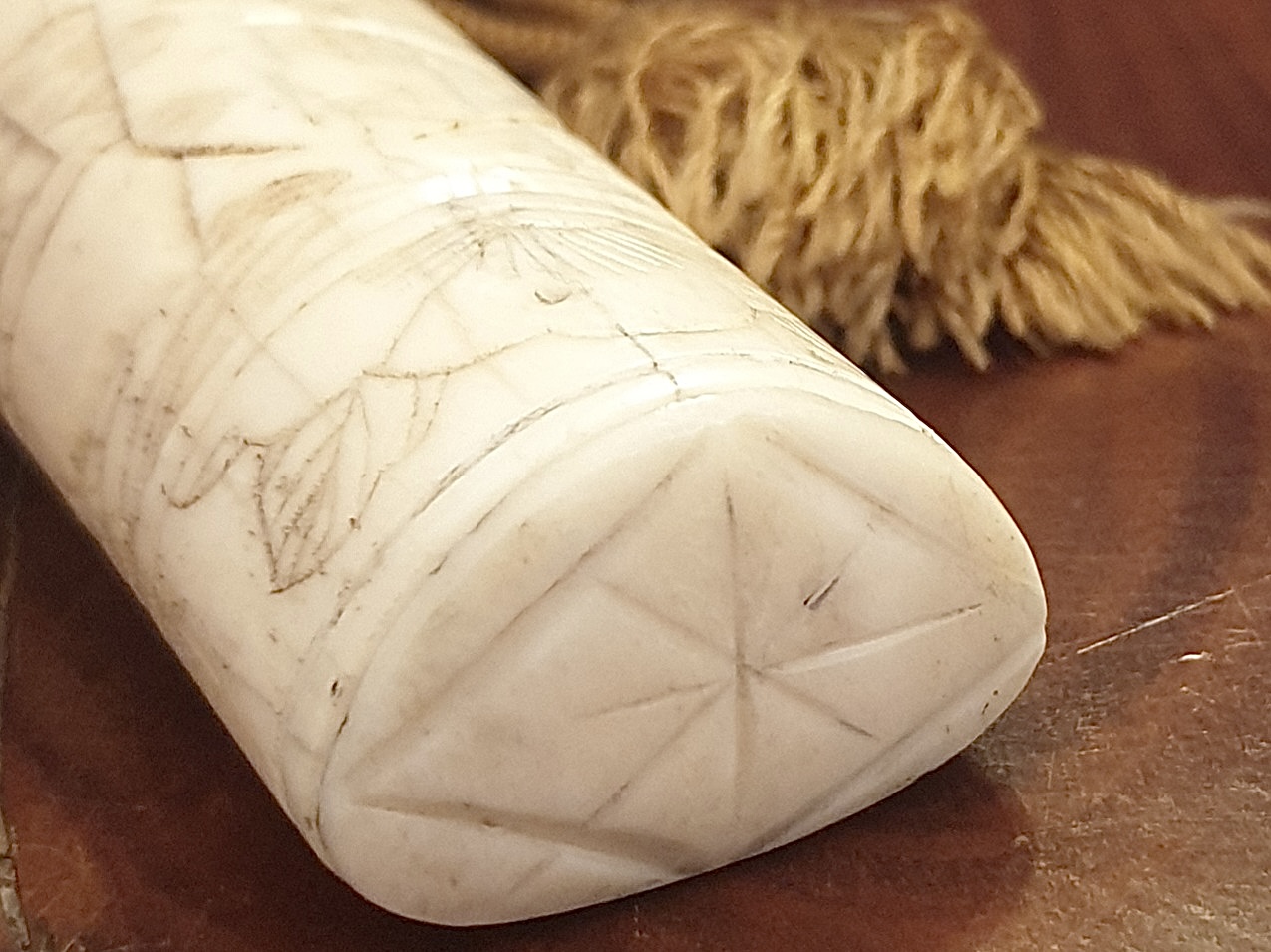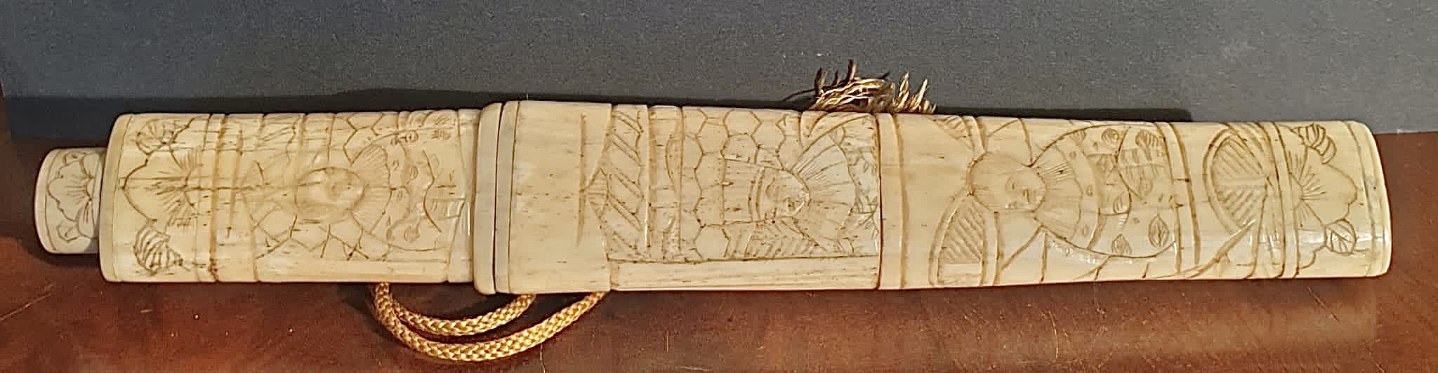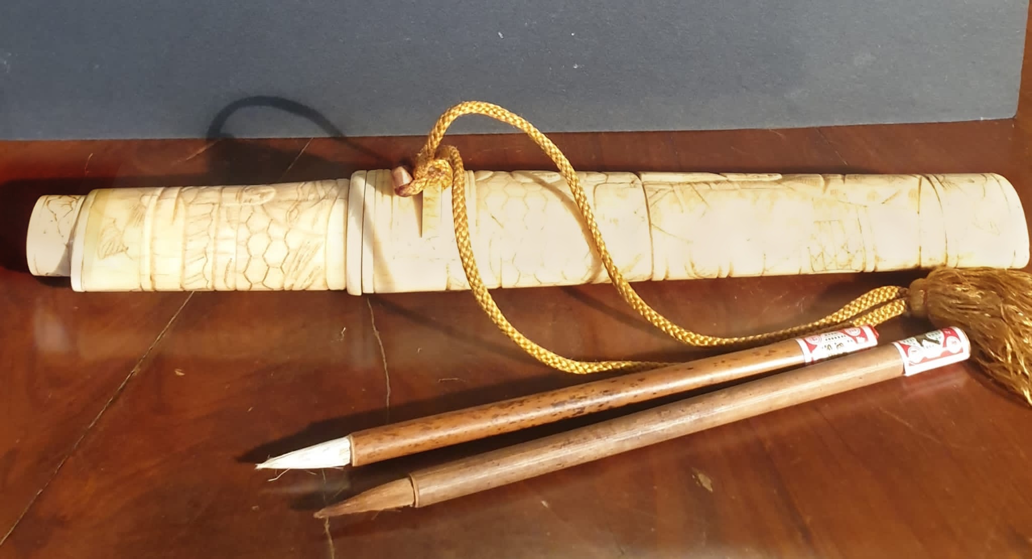 Raro, antico completo scrittorio da cintura (qalamdan, penner, yatate?) orientale in osso con calamaio in rame premuto dal basso con molla. H cm 27,4. Nelle ultime due foto, particolari delle iscrizioni su porta pennelli/calami e porta calamaio. Pennelli non coevi.